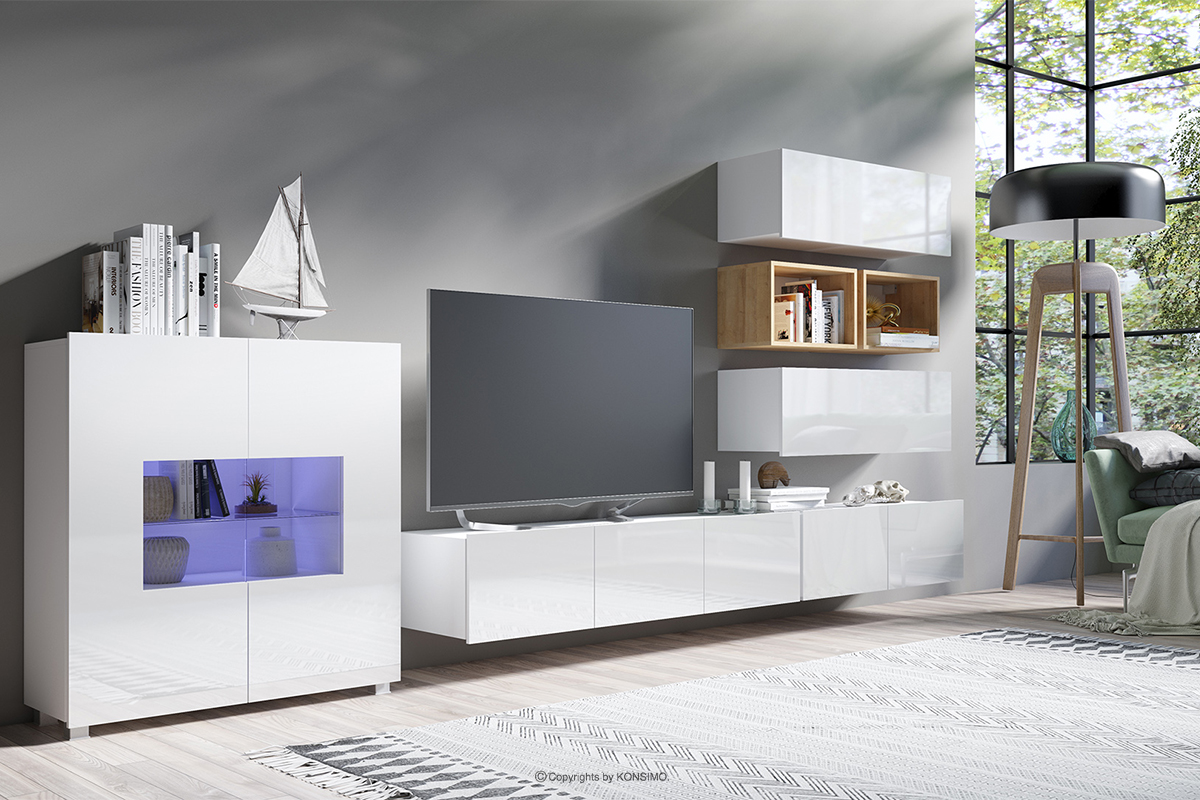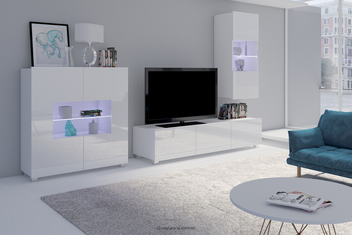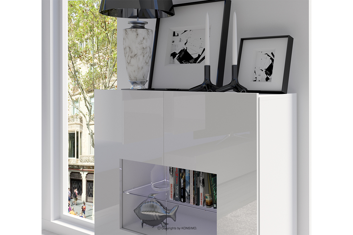 PAVO Objav celú kolekciu Moderná, presvetlená komoda s vitrínou biely lesk- farba bílý lesk