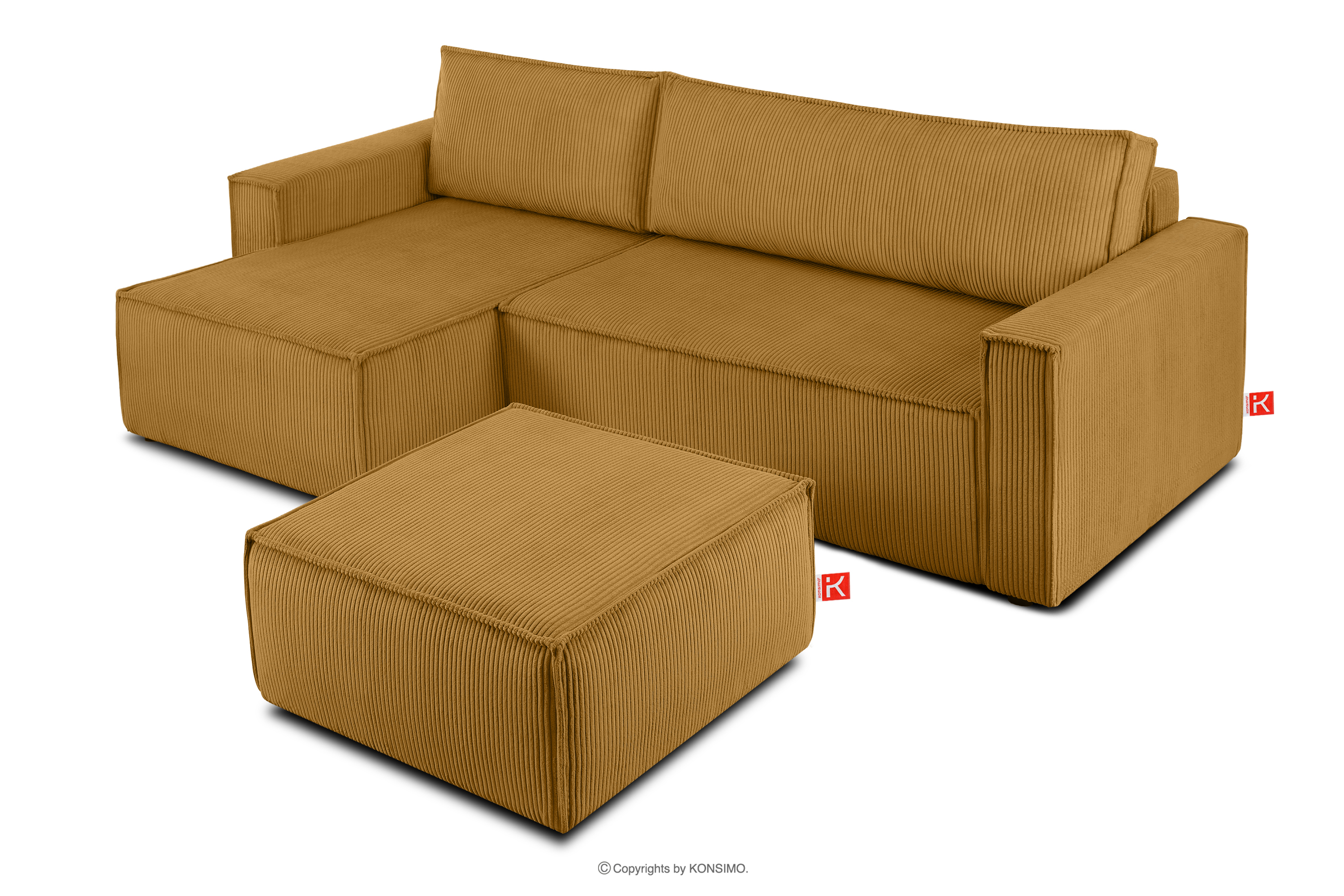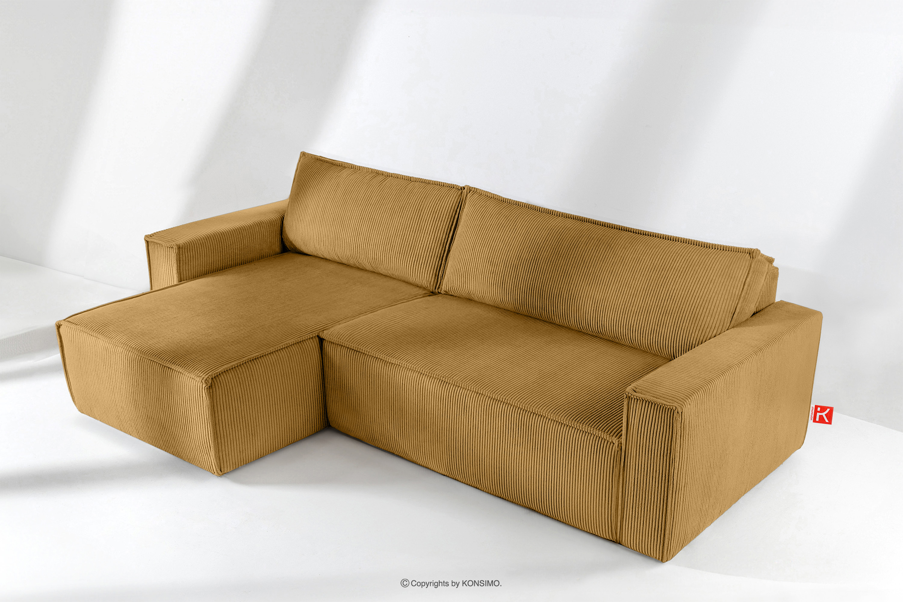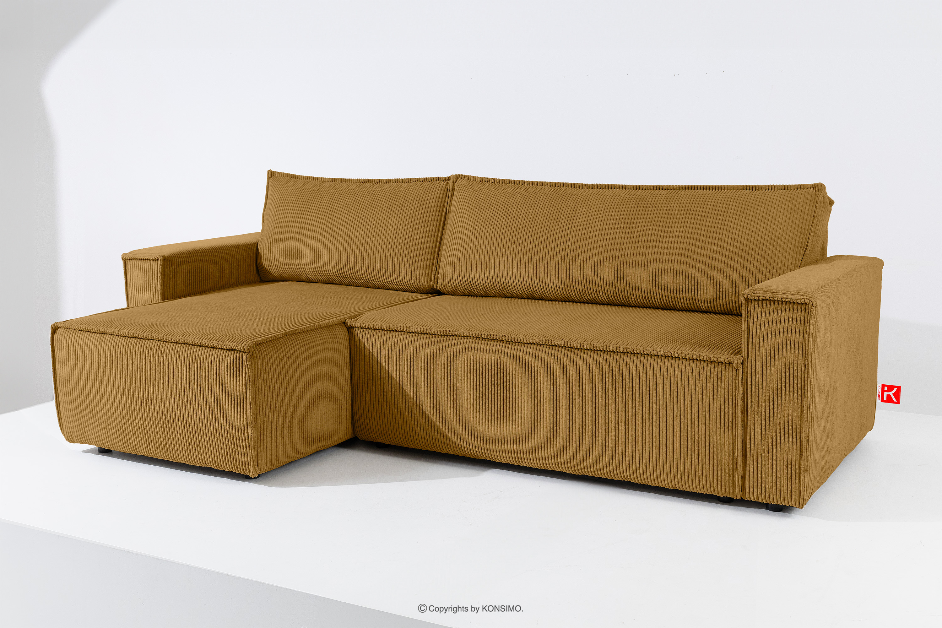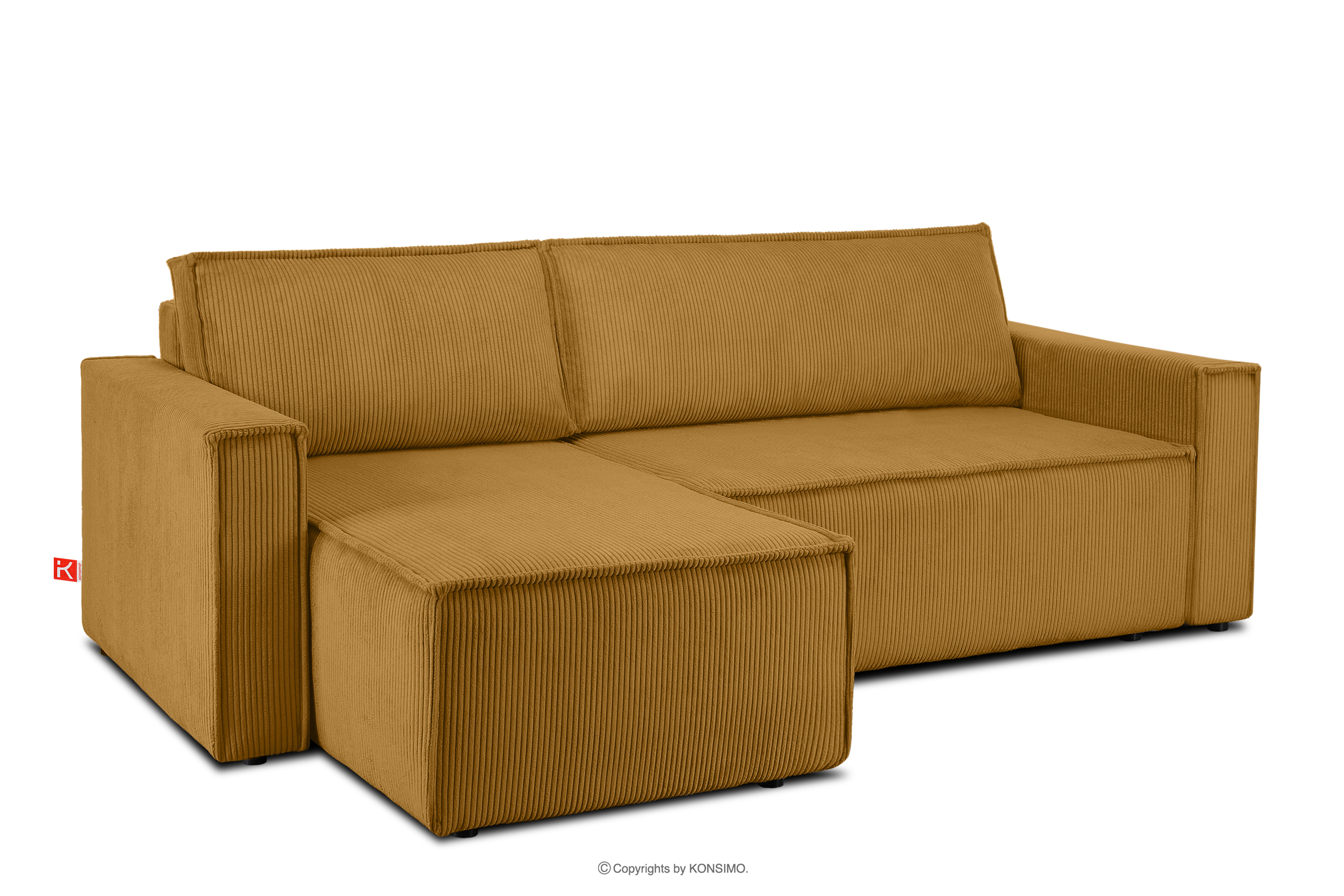 Veľká manšestrová žltá pravá/ľavá rozkladacia rohová pohovka je kus nábytku v modernistickom štýle. Jej charakteristické široké bočné strany ju vyčleňujú z radu štandardného nábytku. To je však len začiatok jej mimoriadnych možností. Je to univerzálna rohová pohovka, čo znamená, že má navyše tú vlastnosť, že si sama dokáže vybrať, na ktorej strane chcete mať rozkladacie kreslo.