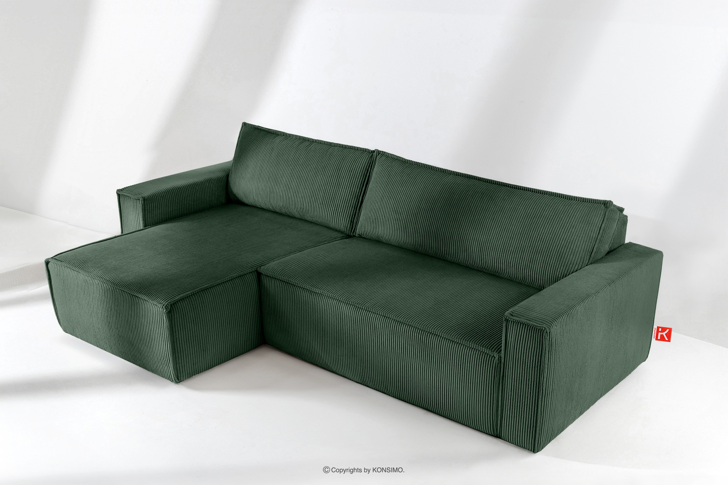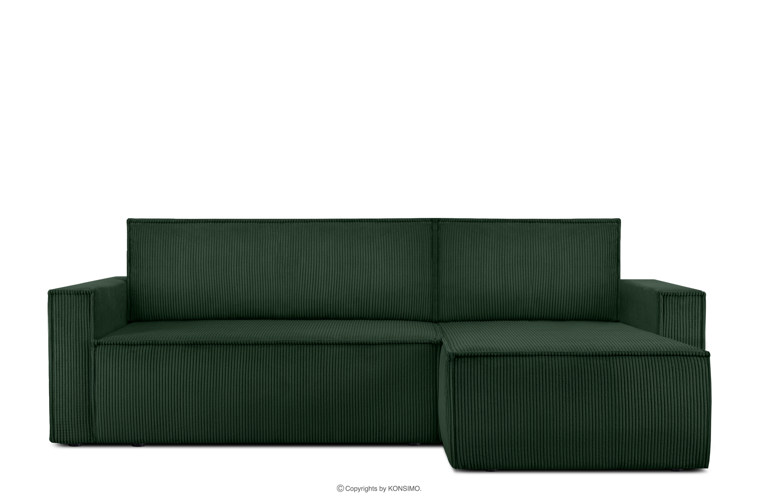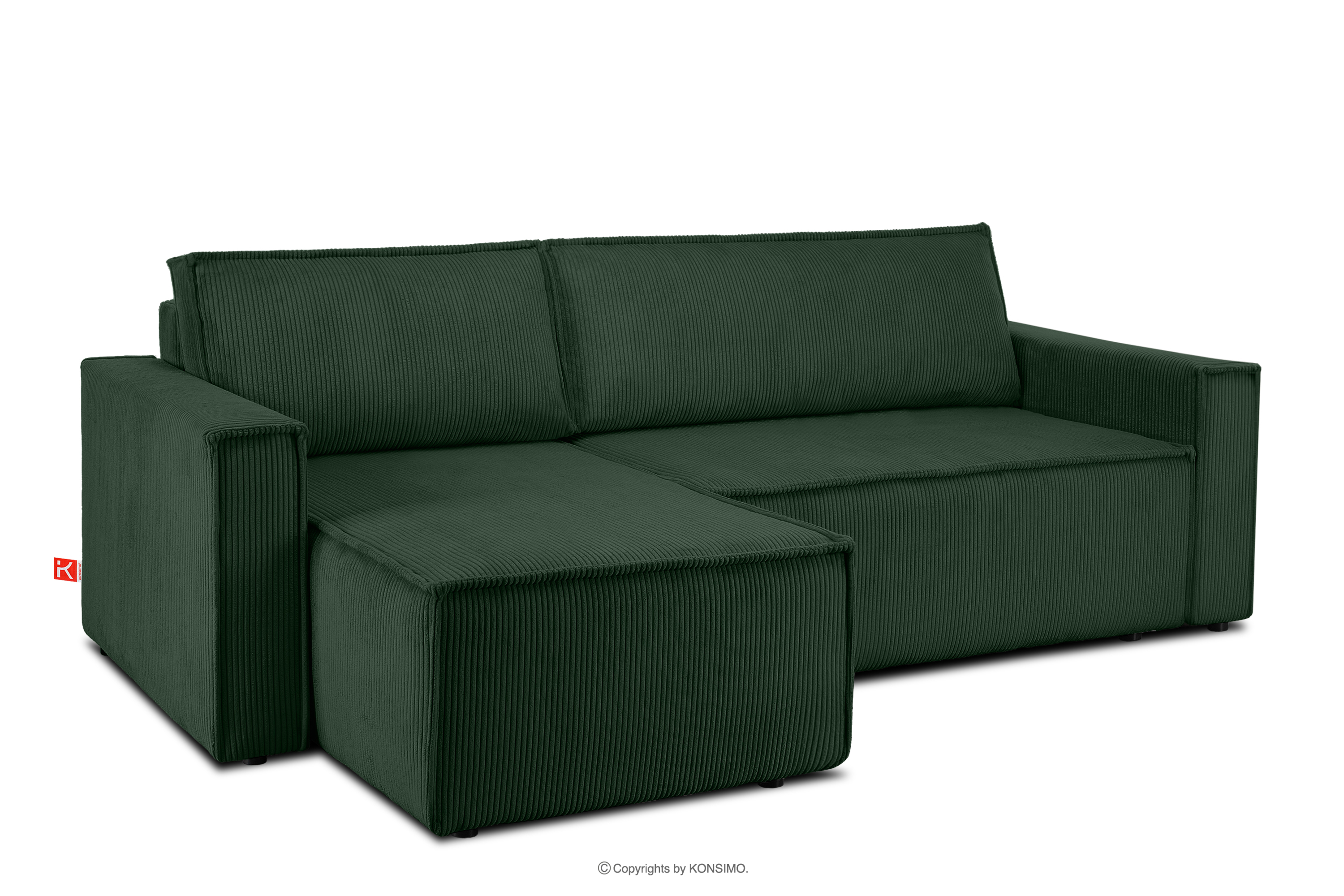Veľká rozkladacia rohová sedacia súprava manšestrová tmavozelená pravá/ľavá je kus nábytku v modernistickom štýle. Jej charakteristické široké bočné strany ju vyčleňujú z radu štandardného nábytku. To je však len začiatok jej mimoriadnych možností. Je to univerzálna rohová pohovka, čo znamená, že má navyše tú vlastnosť, že si sama dokáže vybrať, na ktorej strane chcete mať rozkladacie kreslo.