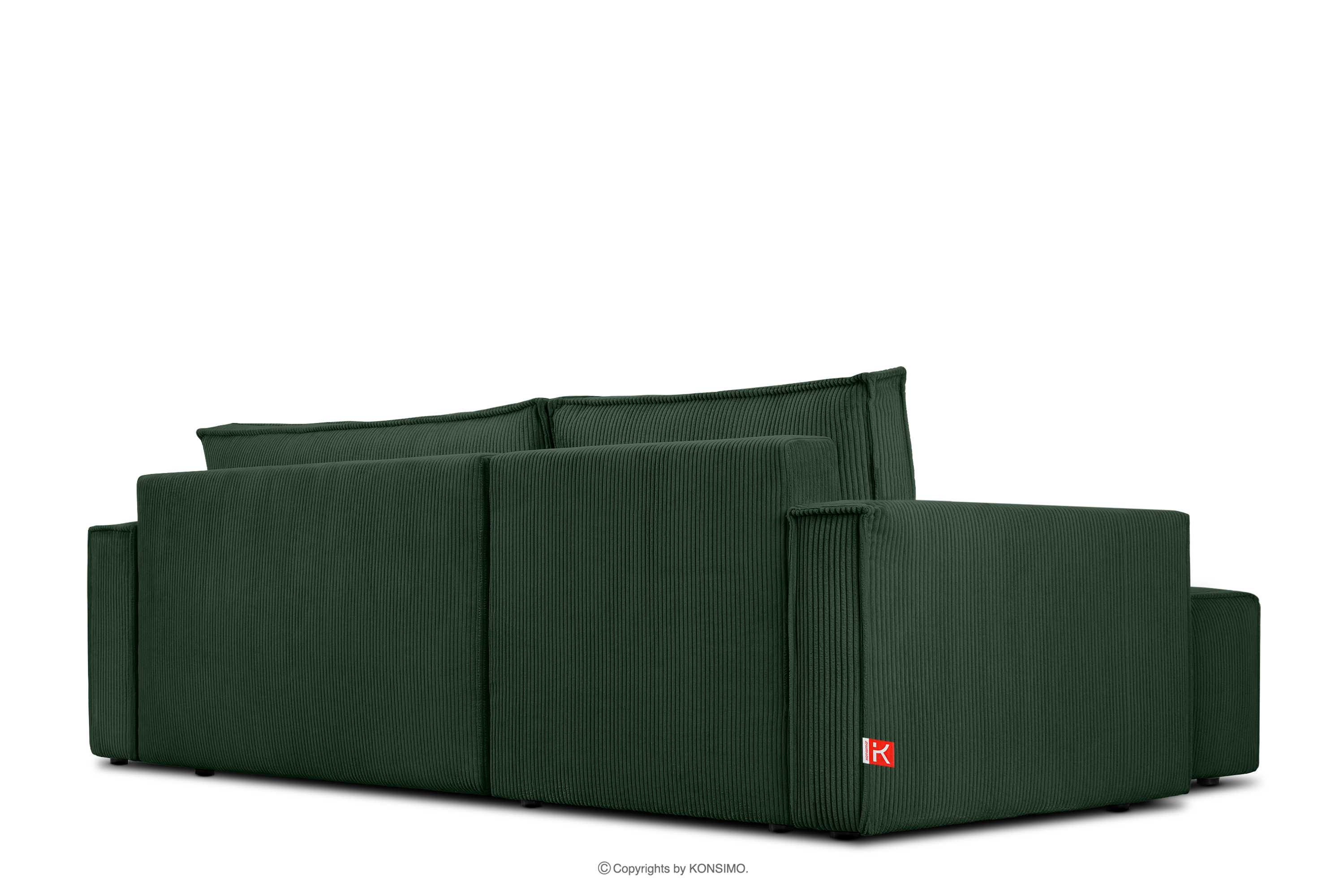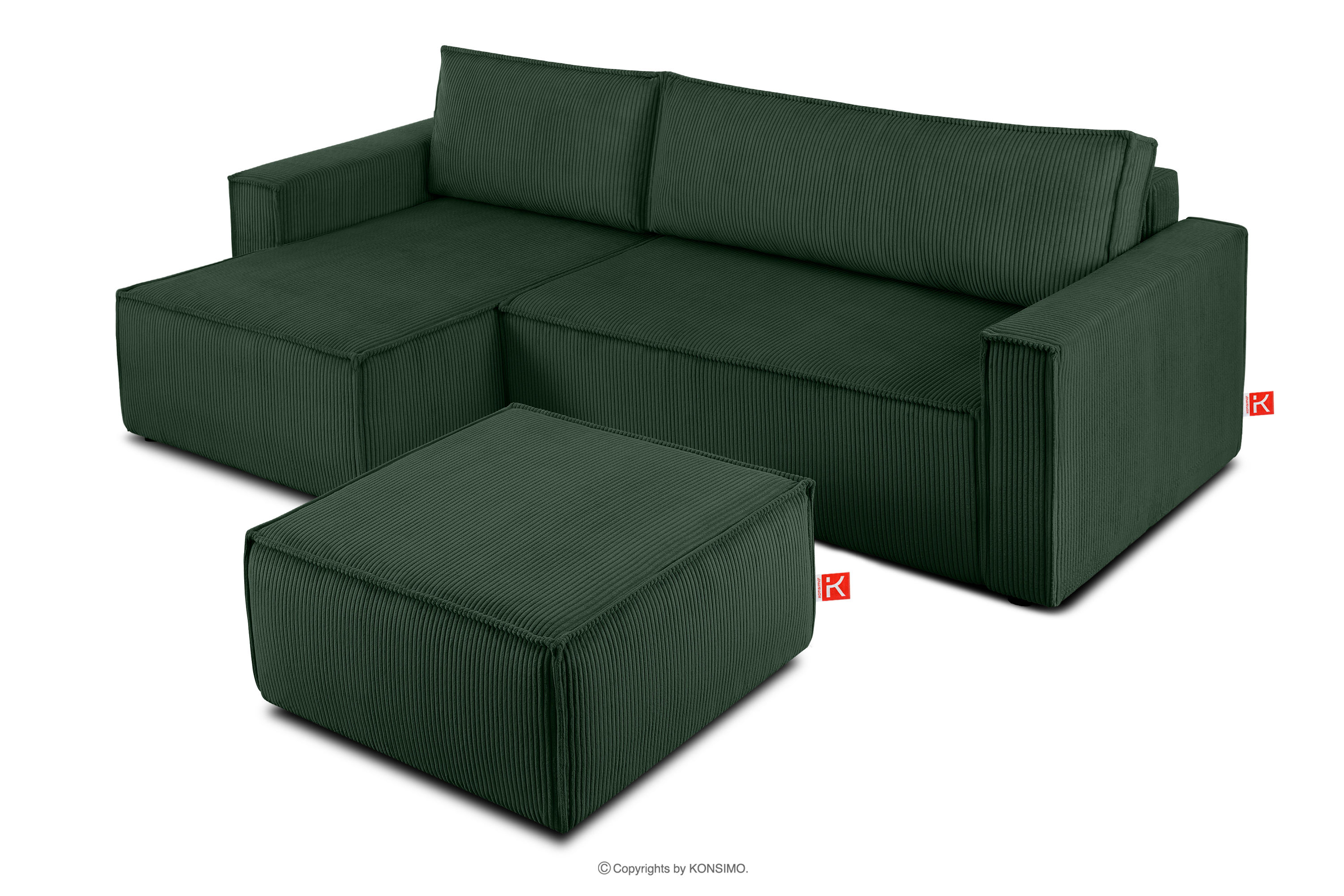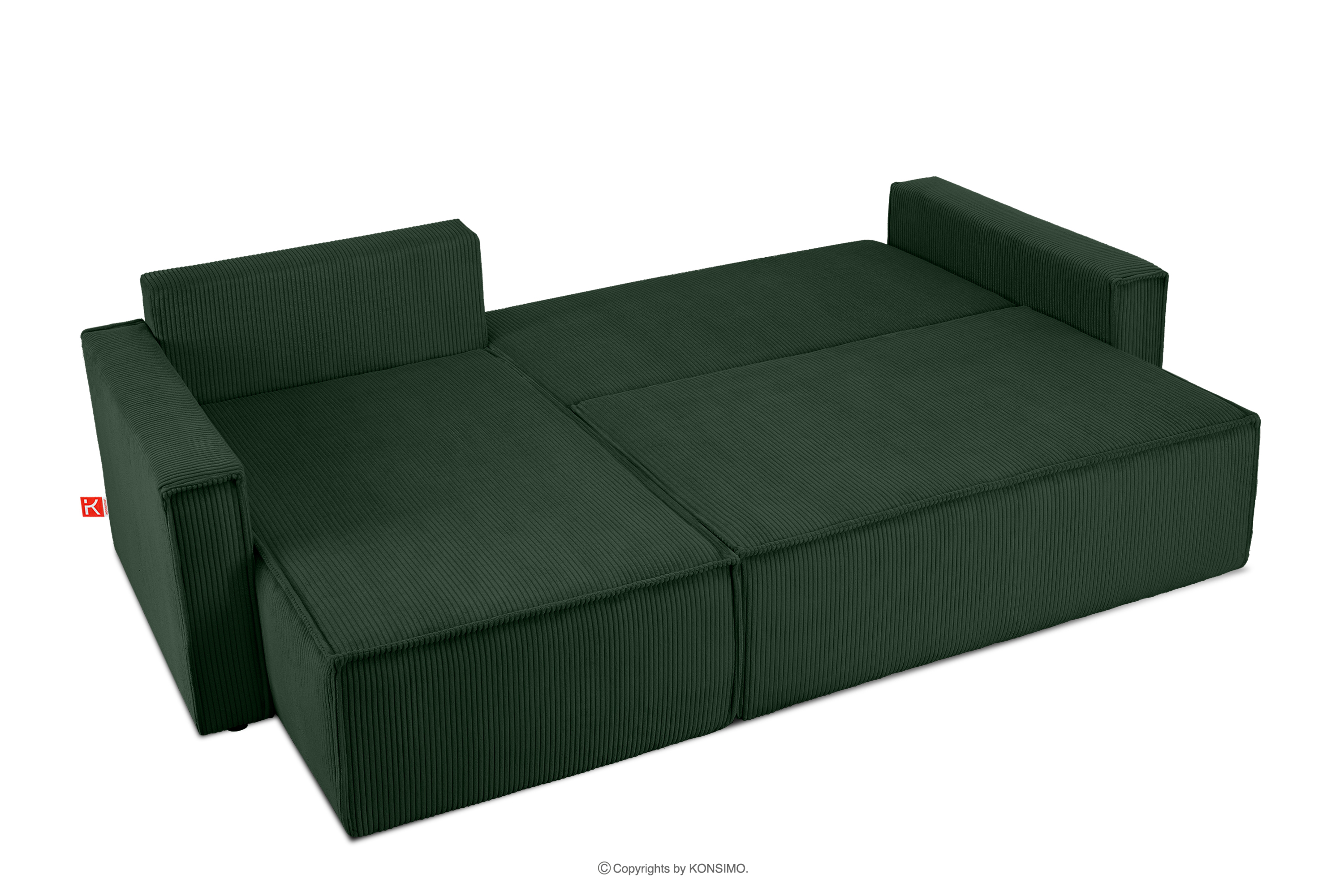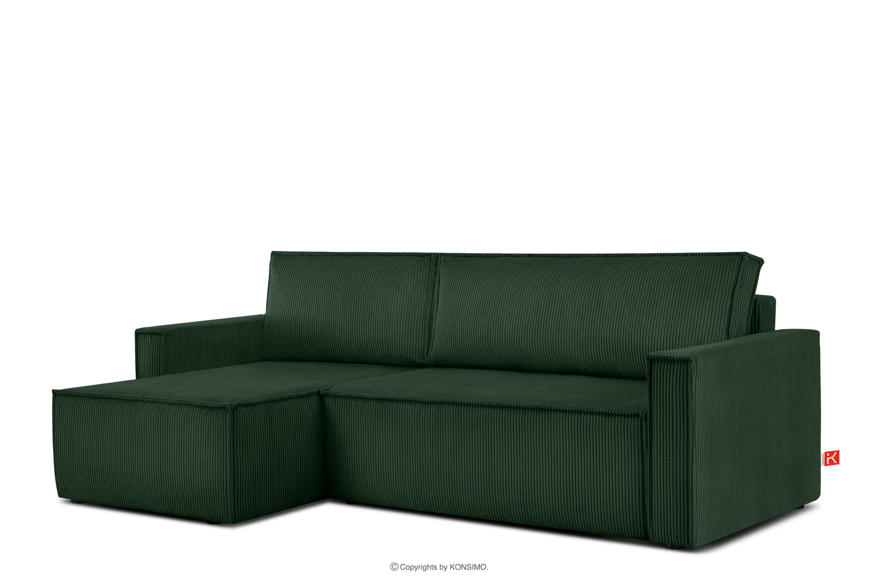 Veľká rozkladacia rohová sedacia súprava manšestrová tmavozelená pravá/ľavá je kus nábytku v modernistickom štýle. Jej charakteristické široké bočné strany ju vyčleňujú z radu štandardného nábytku. To je však len začiatok jej mimoriadnych možností. Je to univerzálna rohová pohovka, čo znamená, že má navyše tú vlastnosť, že si sama dokáže vybrať, na ktorej strane chcete mať rozkladacie kreslo.