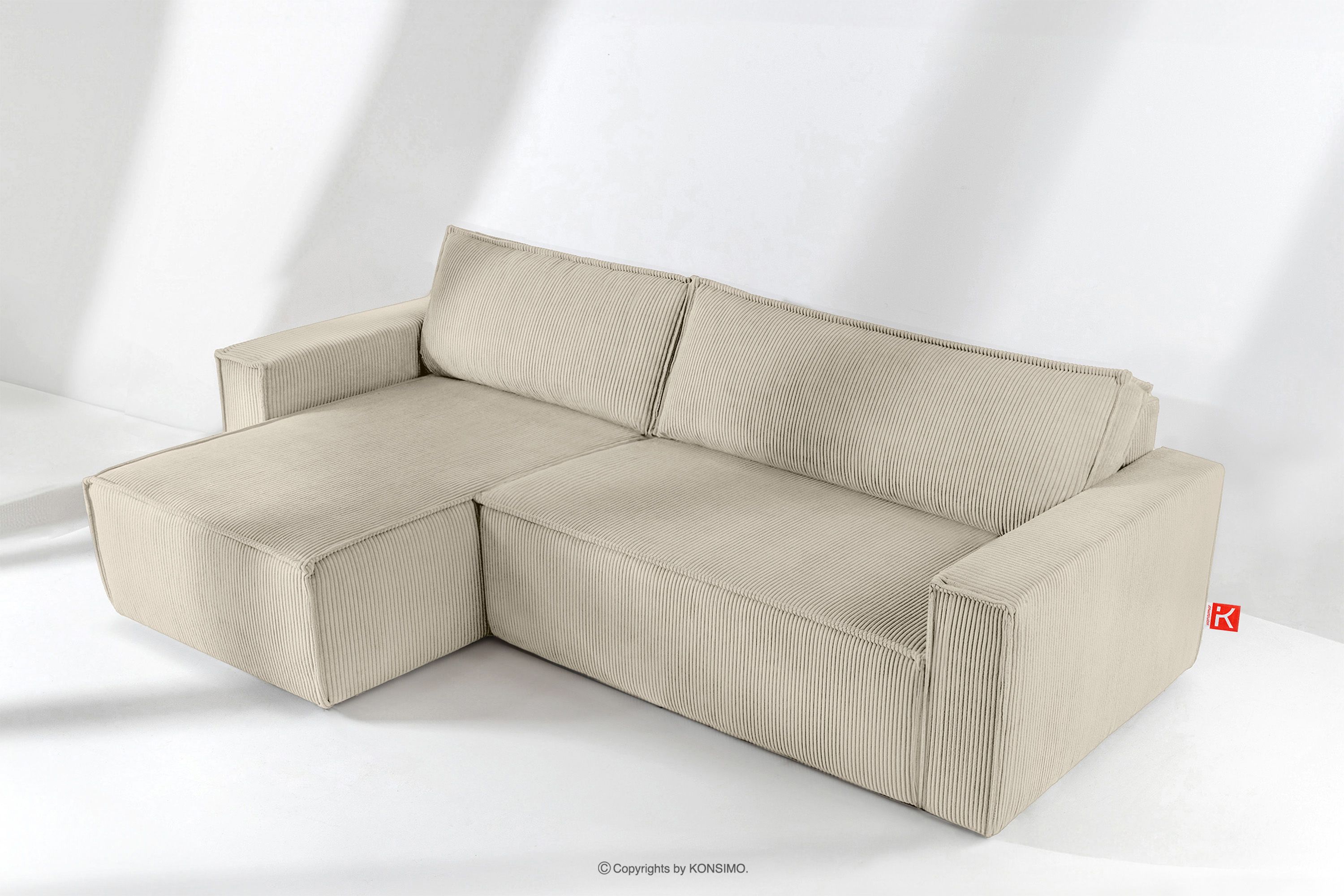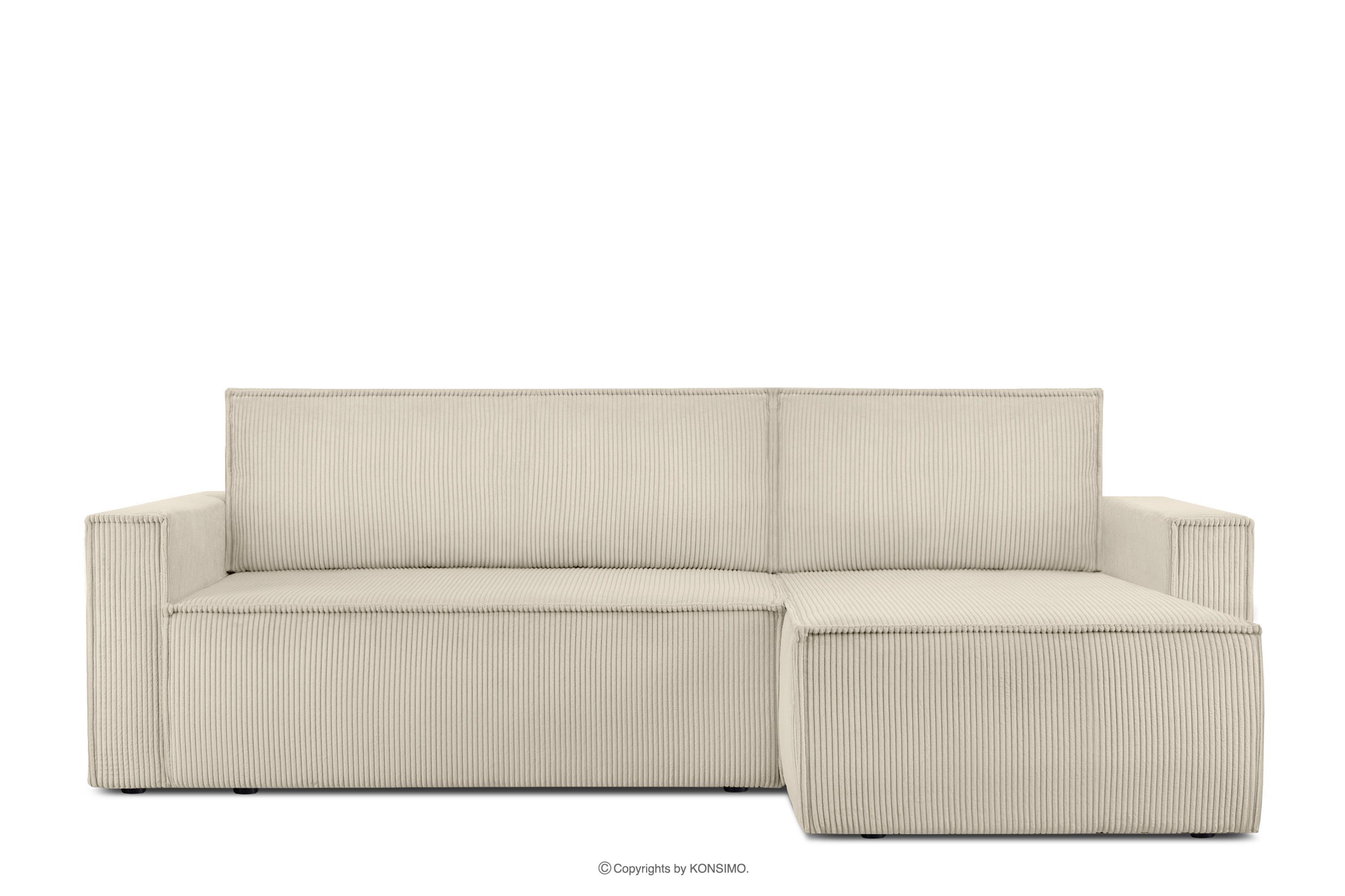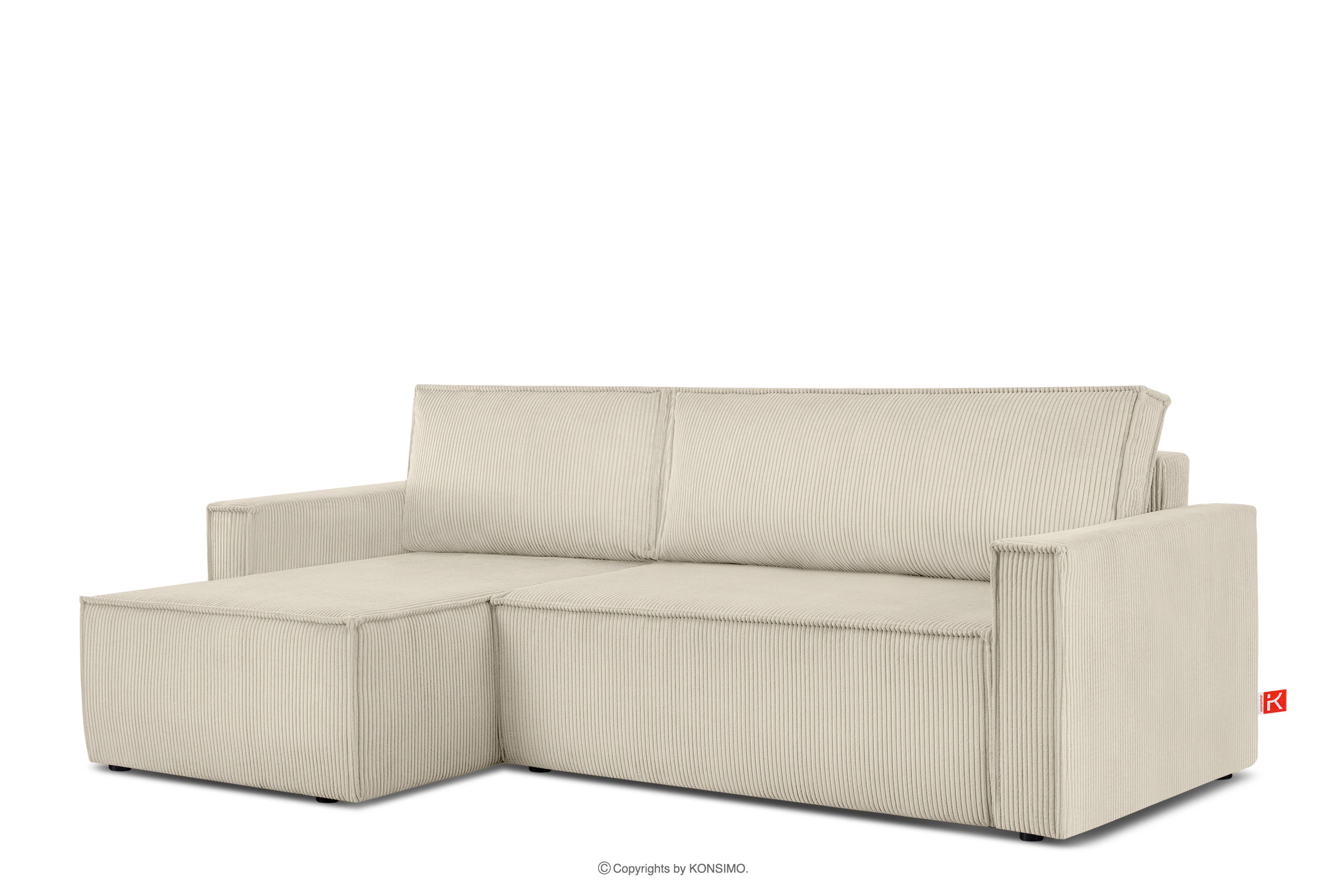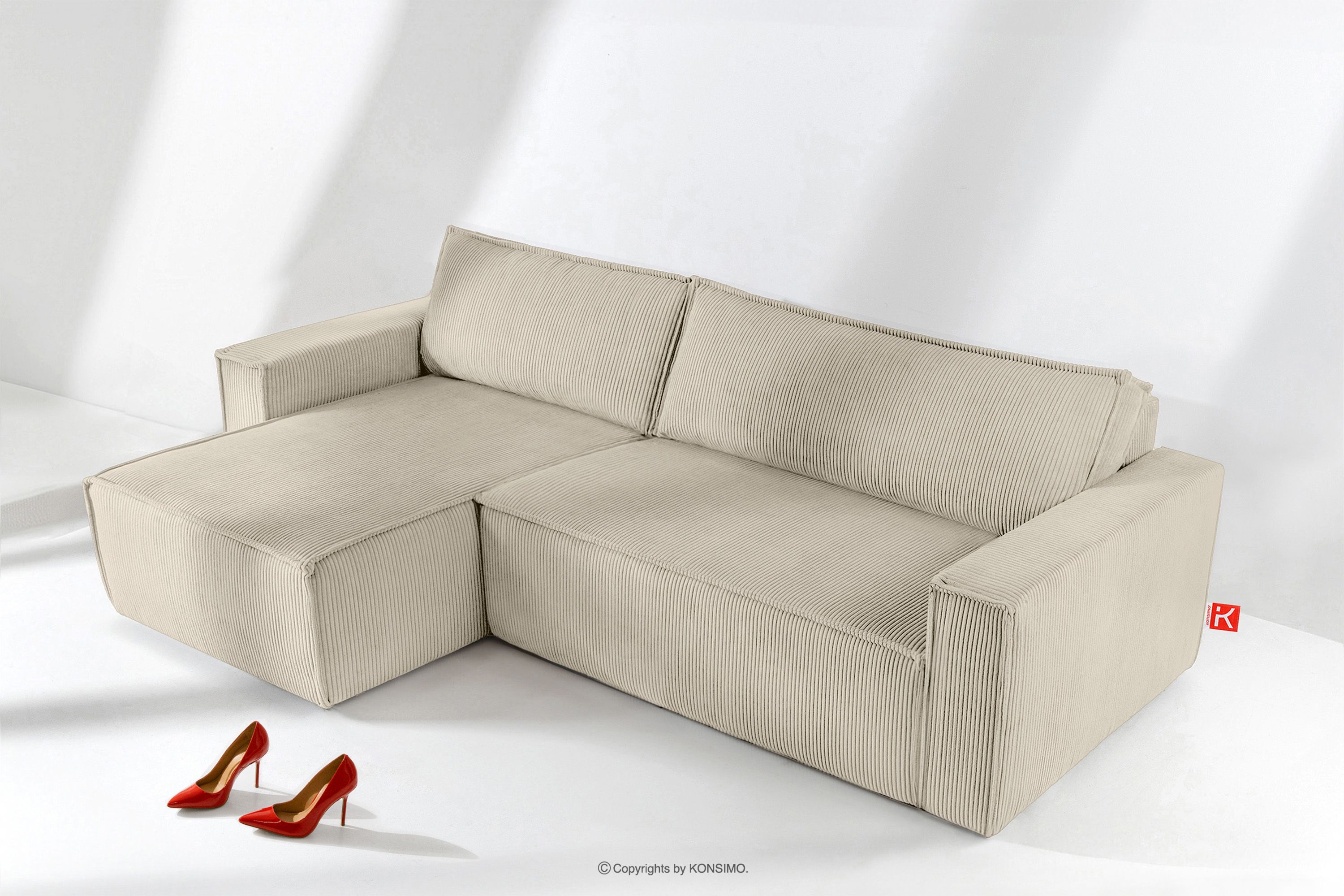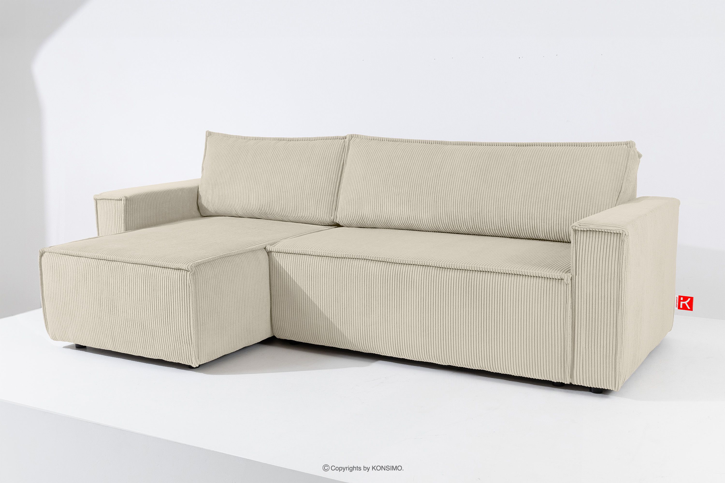 Veľká rozkladacia manšestrová krémová rohová pohovka pravá/ľavá je kus nábytku v modernistickom štýle. Jej charakteristické široké boky ju vyčleňujú z radu štandardného nábytku. To je však len začiatok jej mimoriadnych možností. Ide o univerzálnu rohovú pohovku, čo znamená, že má navyše tú vlastnosť, že si sama vyberie, na ktorej strane chcete mať rozkladacie kreslo.