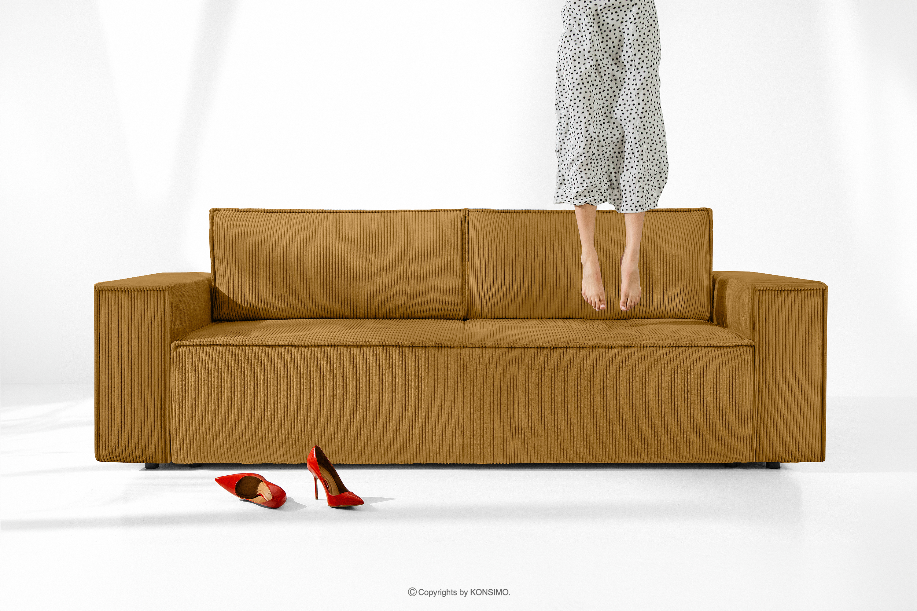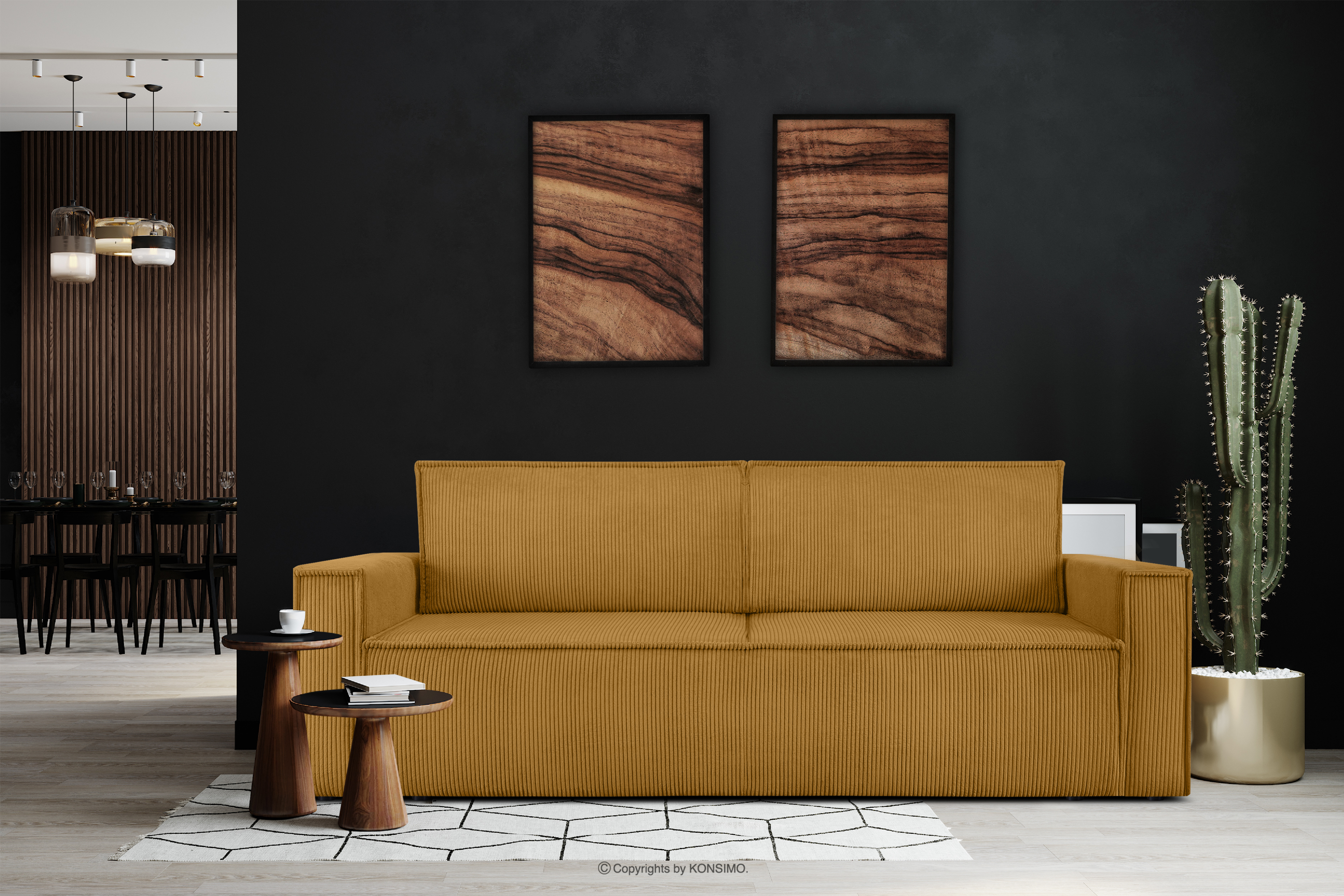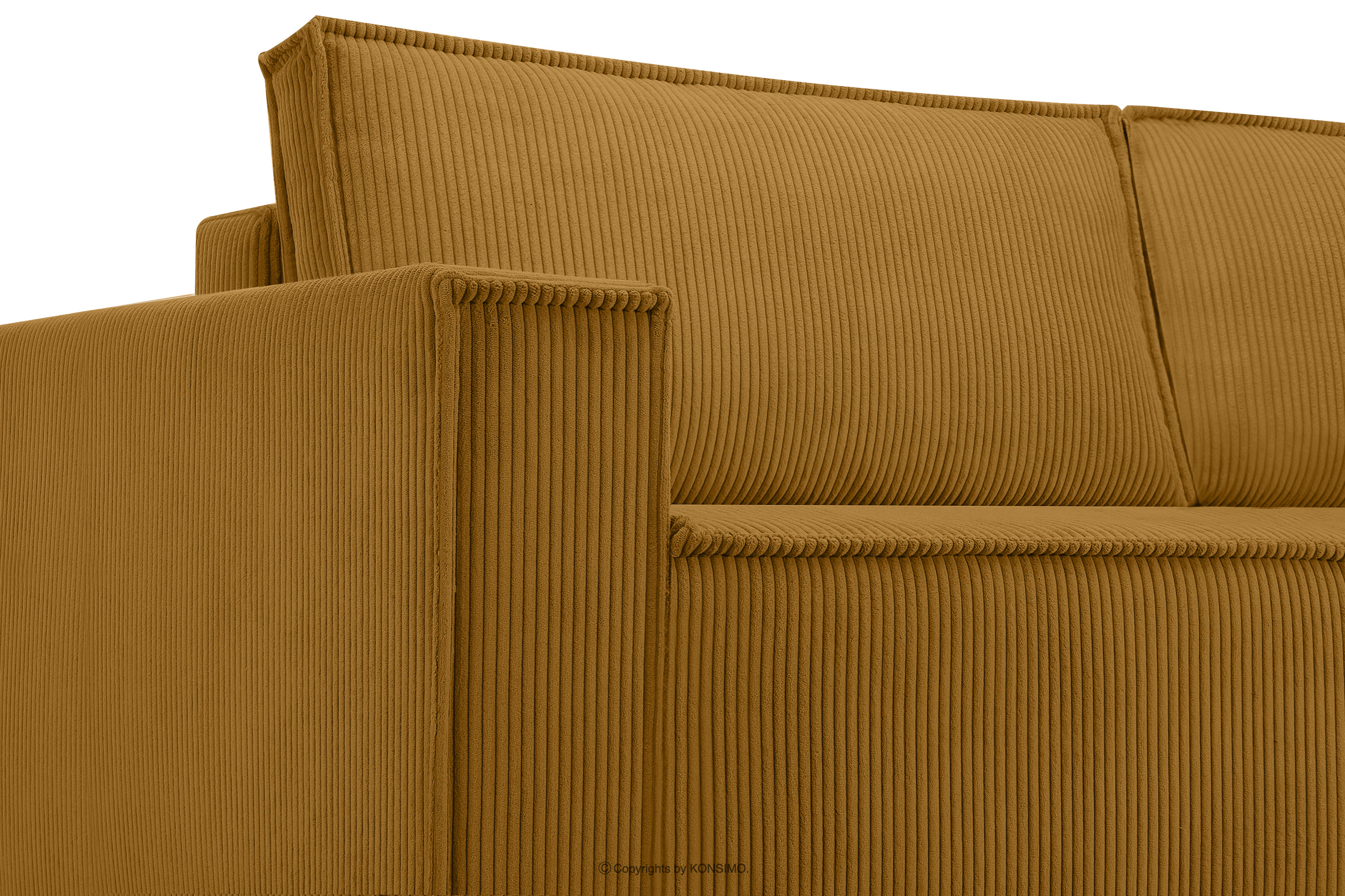 Pohovka 3 rozkladacia manšestrová žltá je kus nábytku v modernistickom štýle. Jej charakteristické široké boky ju vyčleňujú z radu štandardného nábytku. To je však len začiatok jej mimoriadnych možností. Opierkové vankúše poskytujú ideálnu oporu pre váš chrbát a vďaka svojim veľkým rozmerom aj skvele vyzerajú. Celé čalúnenie tohto výnimočného kusu nábytku je vyrobené z manšestrovej látky, ktorá je nielen príjemná na dotyk, ale aj si dlho zachováva svoj neporušený vzhľad.