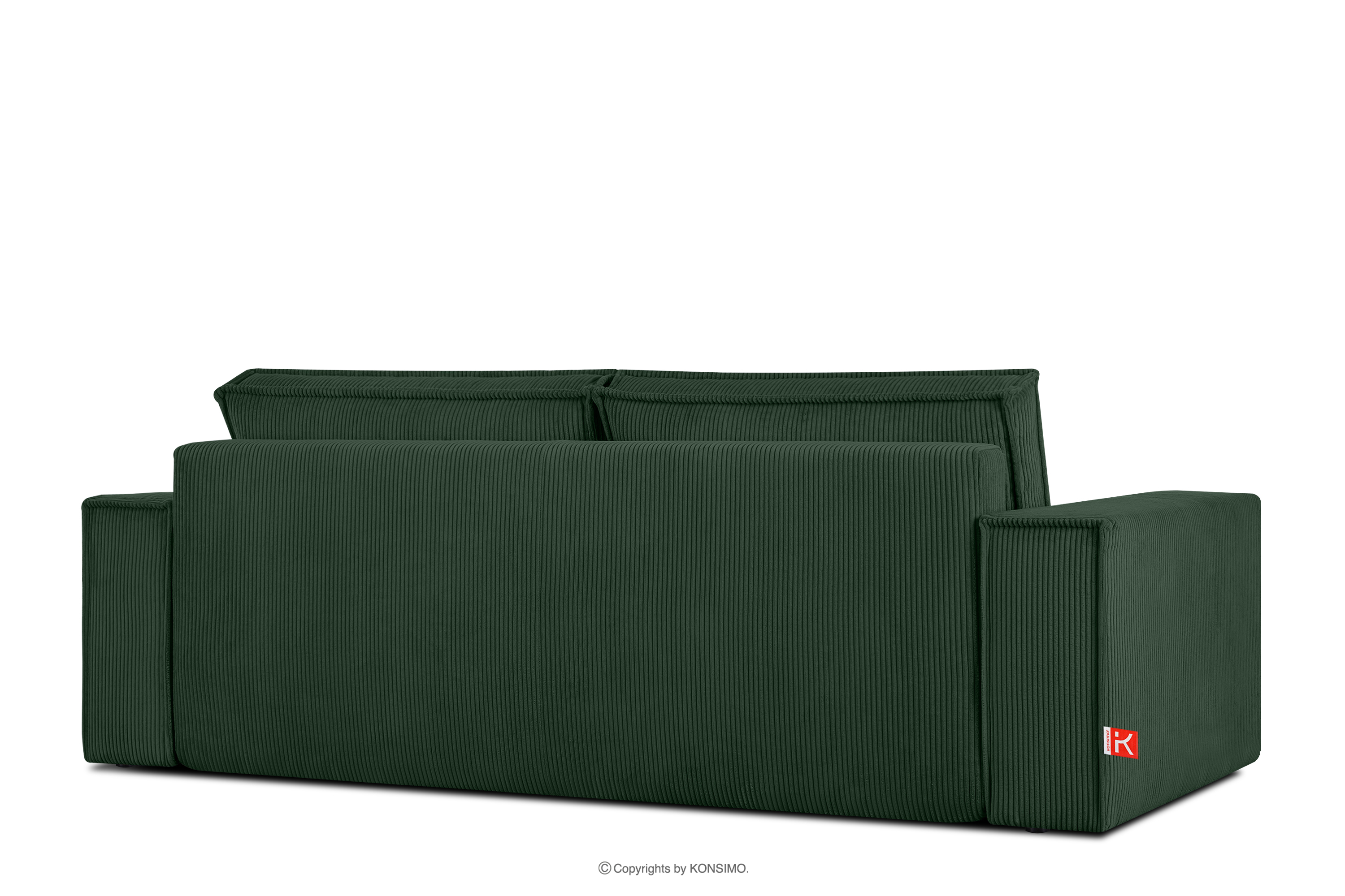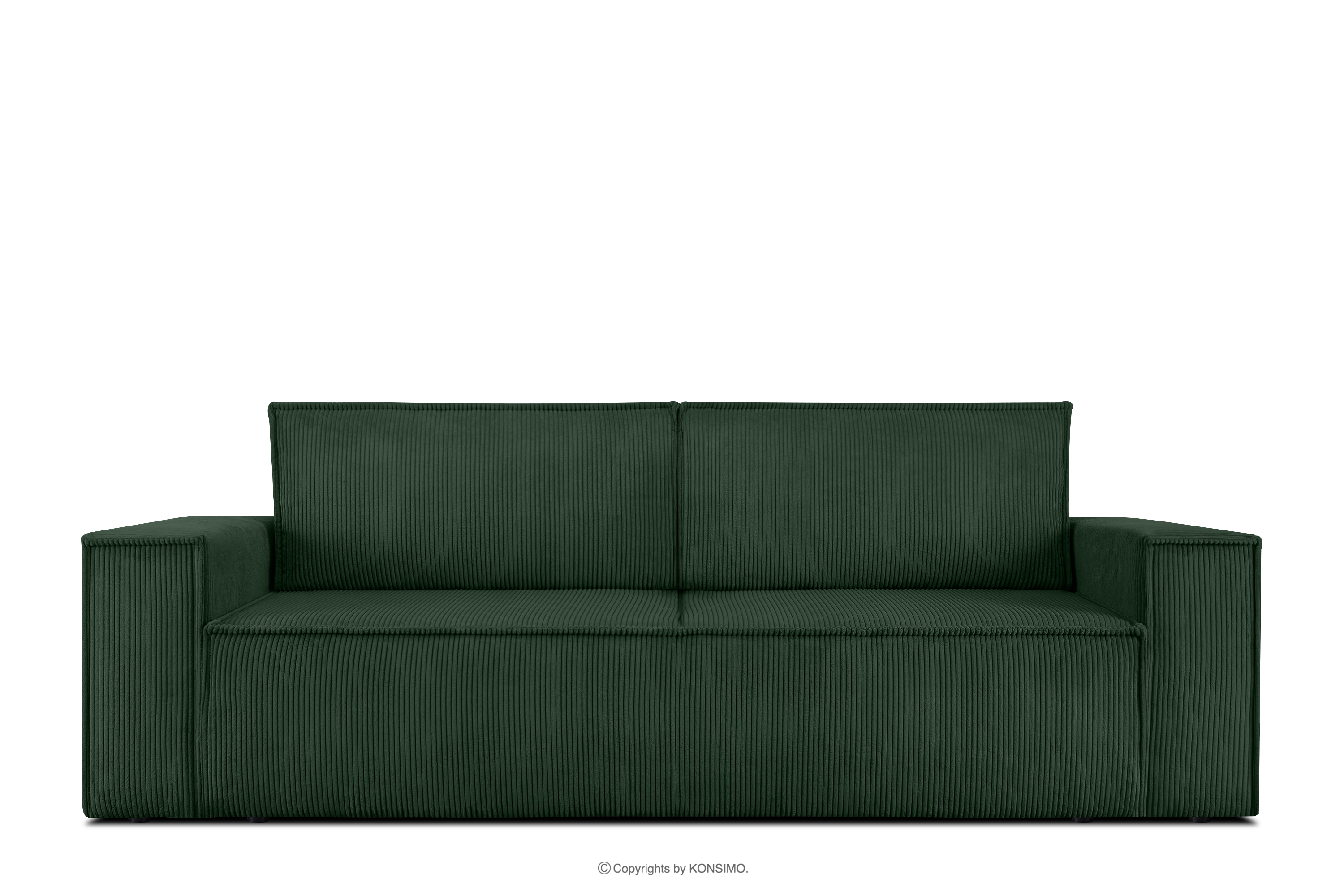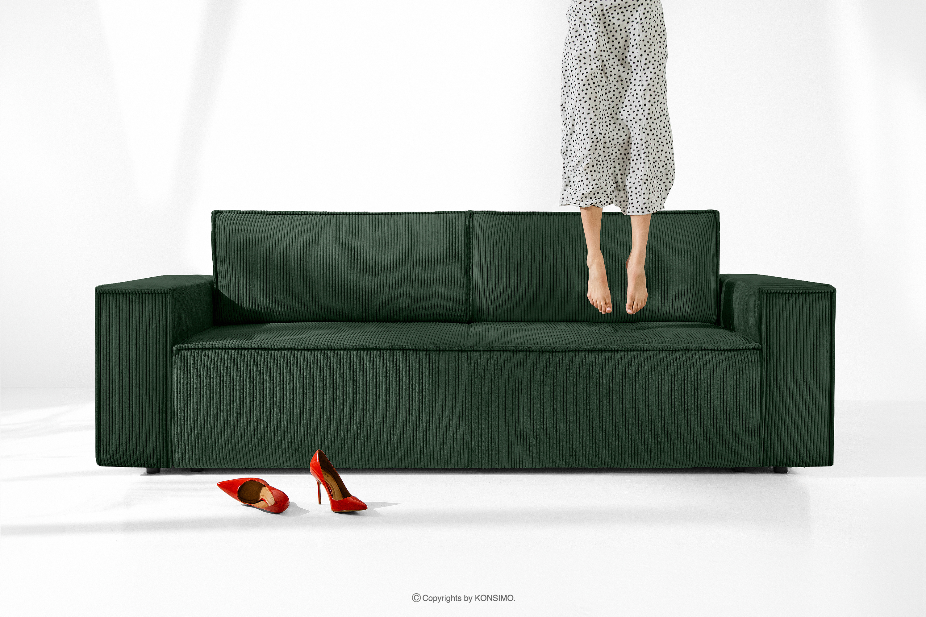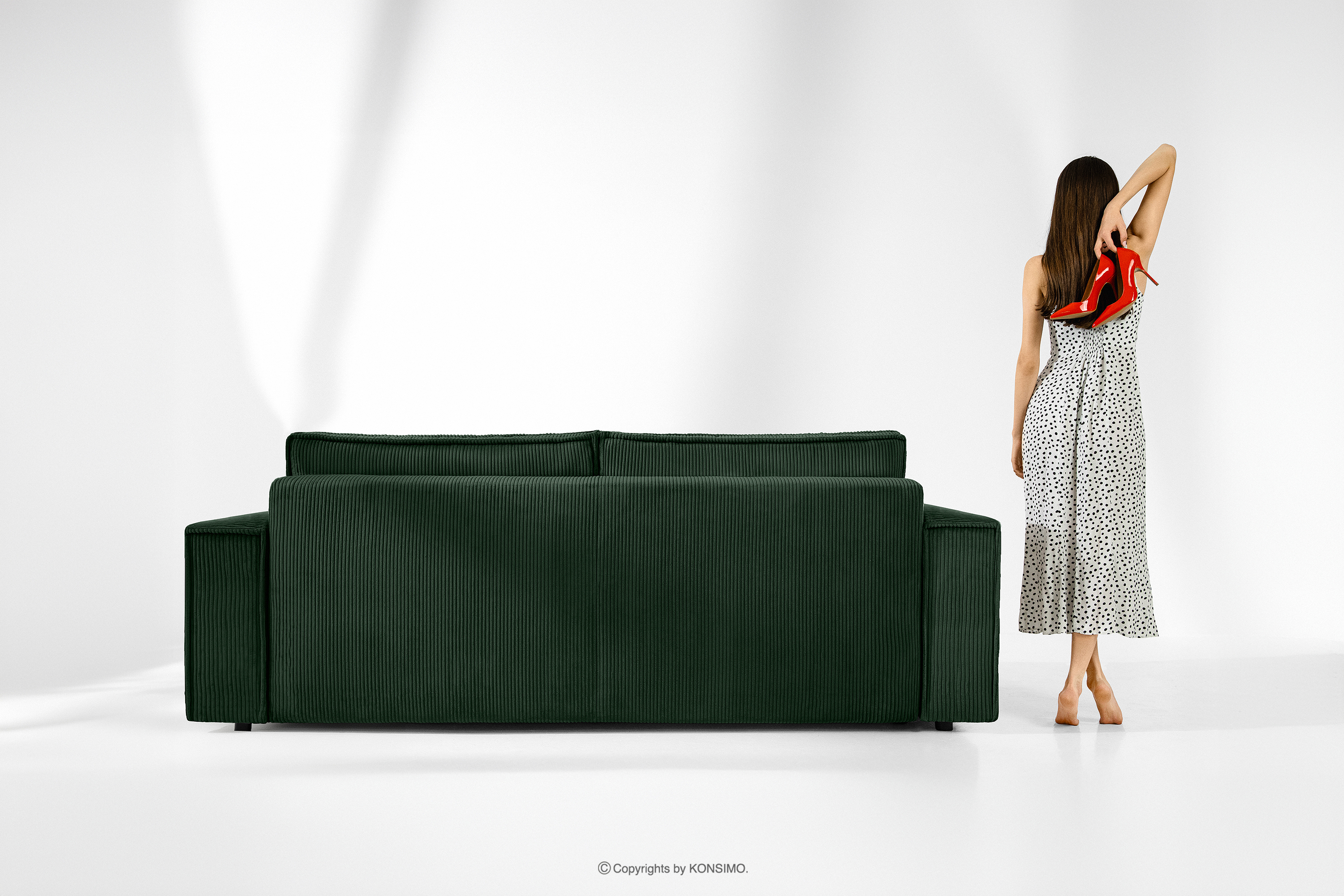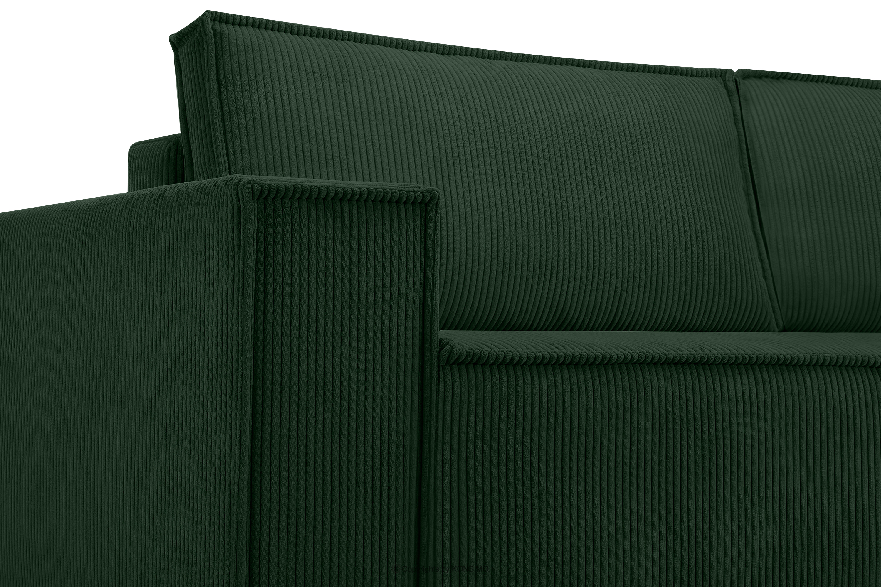 Trojmiestna pohovka s priestorom na lôžko v tmavozelenej farbe je kus nábytku v modernistickom štýle. Jej charakteristické široké boky ju vyčleňujú z radu štandardného nábytku. To je však len začiatok jej výnimočných možností. Opierkové vankúše sú dokonalou oporou pre váš chrbát a vďaka svojim veľkým rozmerom aj skvele vyzerajú. Celé čalúnenie tohto výnimočného kusu nábytku je vyrobené z manšestrovej látky, ktorá je nielen príjemná na dotyk, ale aj si dlho zachováva svoj neporušený vzhľad.
