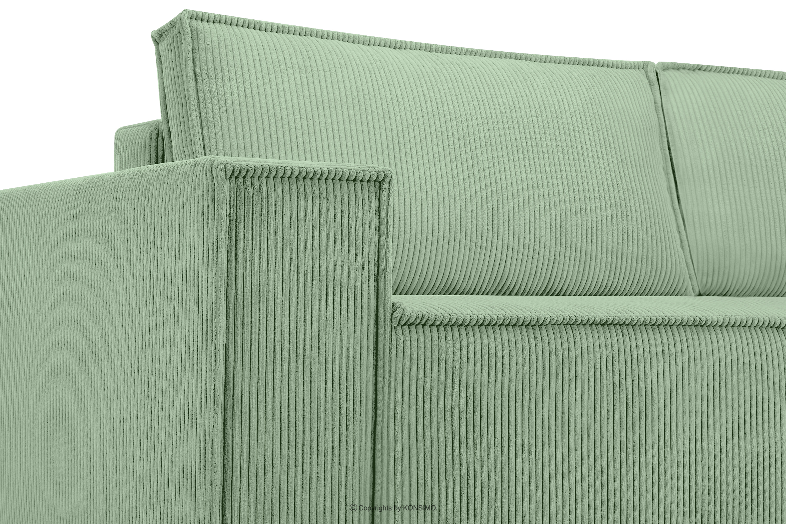 Trojmiestna pohovka s kontajnerom na lôžkoviny v mätovej farbe je kus nábytku v modernistickom štýle. Jej charakteristické široké bočné strany ju vyčleňujú z radu štandardného nábytku. To je však len začiatok jej výnimočných možností. Opierkové vankúše sú dokonalou oporou pre váš chrbát a vďaka svojim veľkým rozmerom aj skvele vyzerajú. Celé čalúnenie tohto výnimočného kusu nábytku je vyrobené z manšestrovej látky, ktorá je nielen príjemná na dotyk, ale aj si dlho zachováva svoj neporušený vzhľad.
