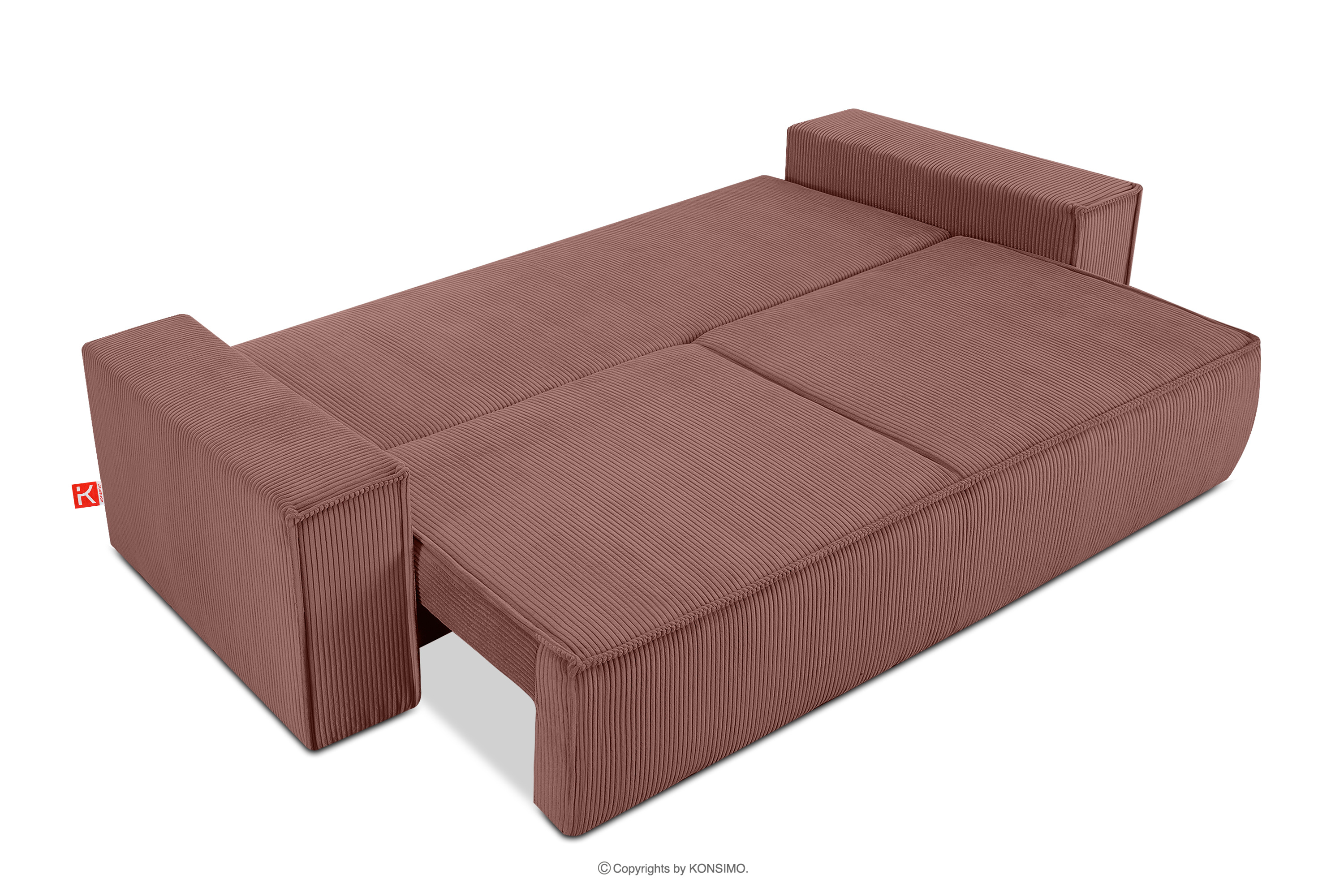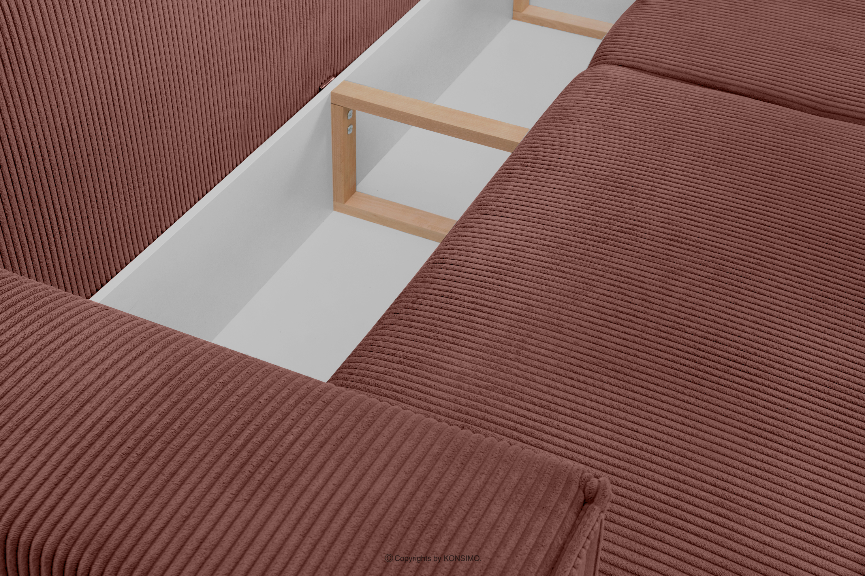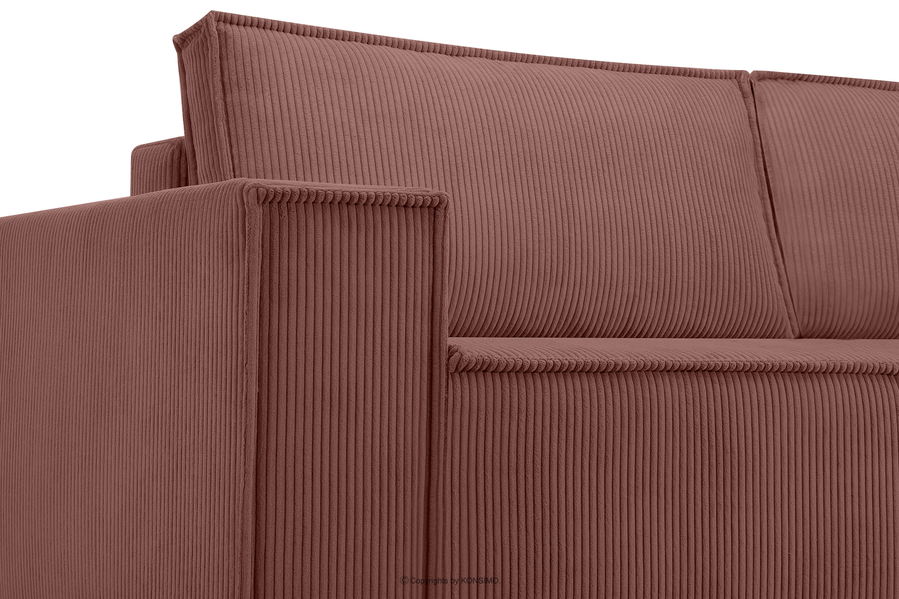 Trojmiestna pohovka s kontajnerom na posteľnú bielizeň ružovej farby je kus nábytku v modernistickom štýle. Jej charakteristické široké boky ju vyčleňujú z radu štandardného nábytku. To je však len začiatok jej mimoriadnych možností. Opierkové vankúše sú dokonalou oporou pre váš chrbát a vďaka svojim veľkým rozmerom aj skvele vyzerajú. Celé čalúnenie tohto výnimočného kusu nábytku je vyrobené z manšestrovej látky, ktorá je nielen príjemná na dotyk, ale aj si dlho zachováva neporušený vzhľad.
