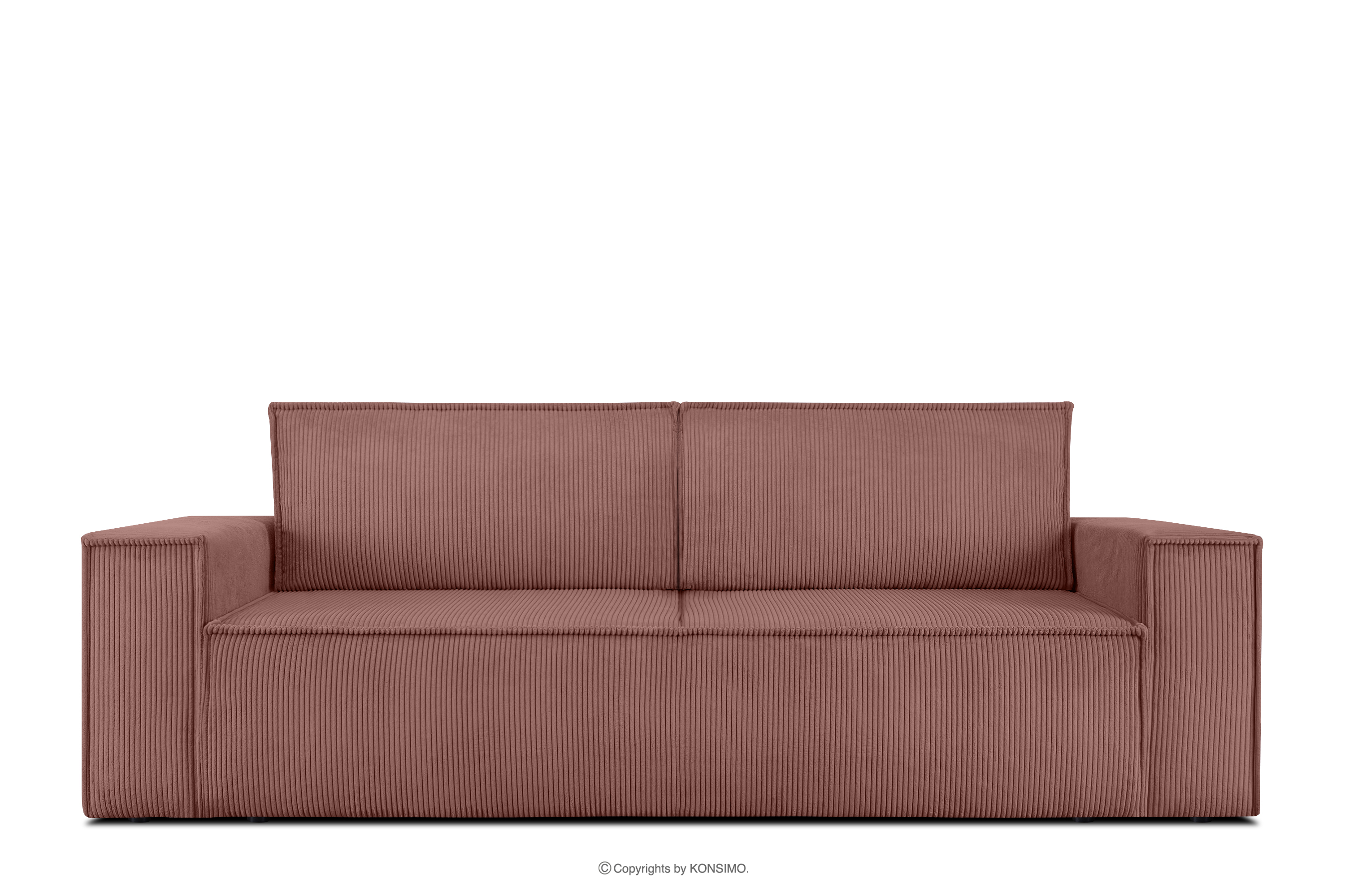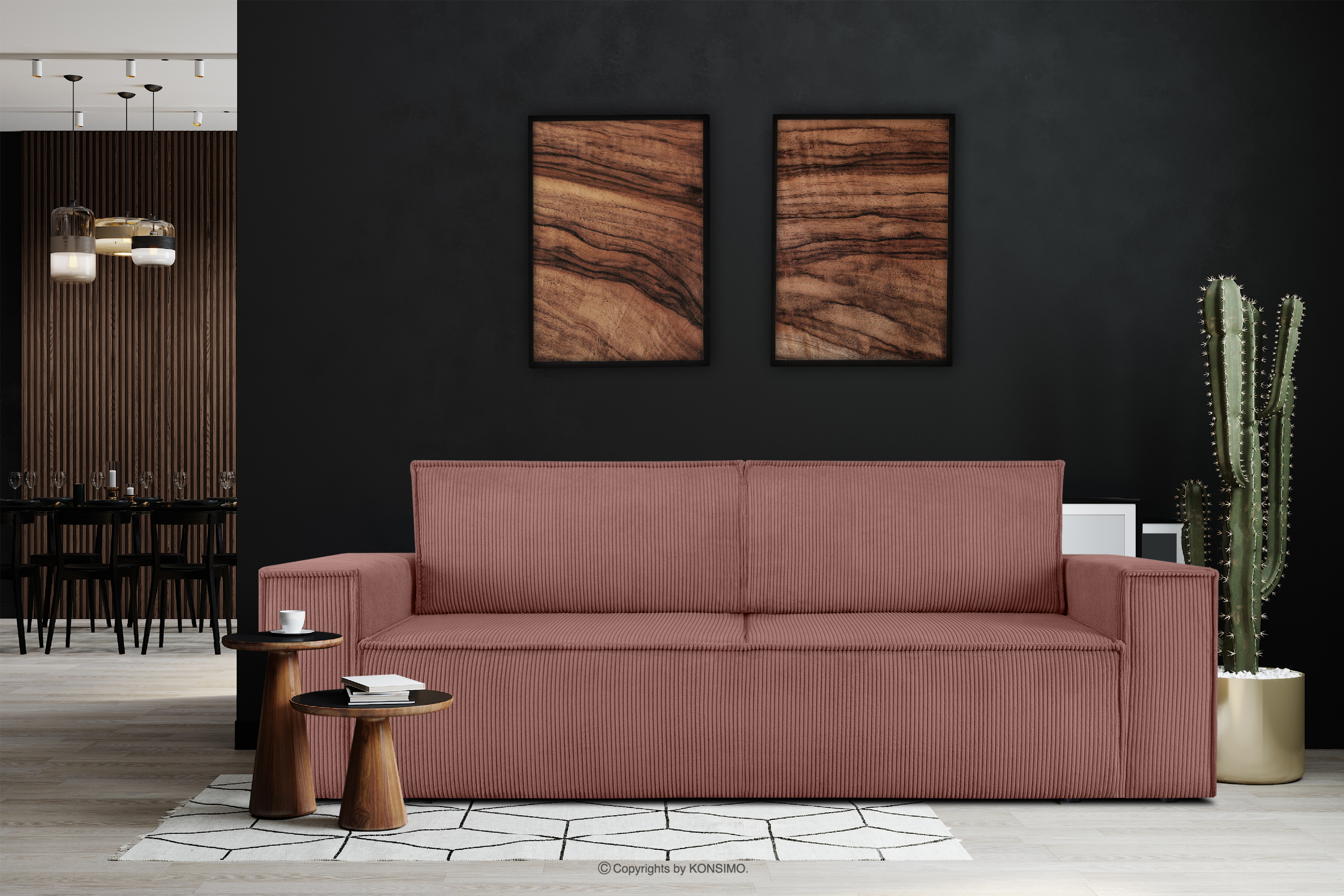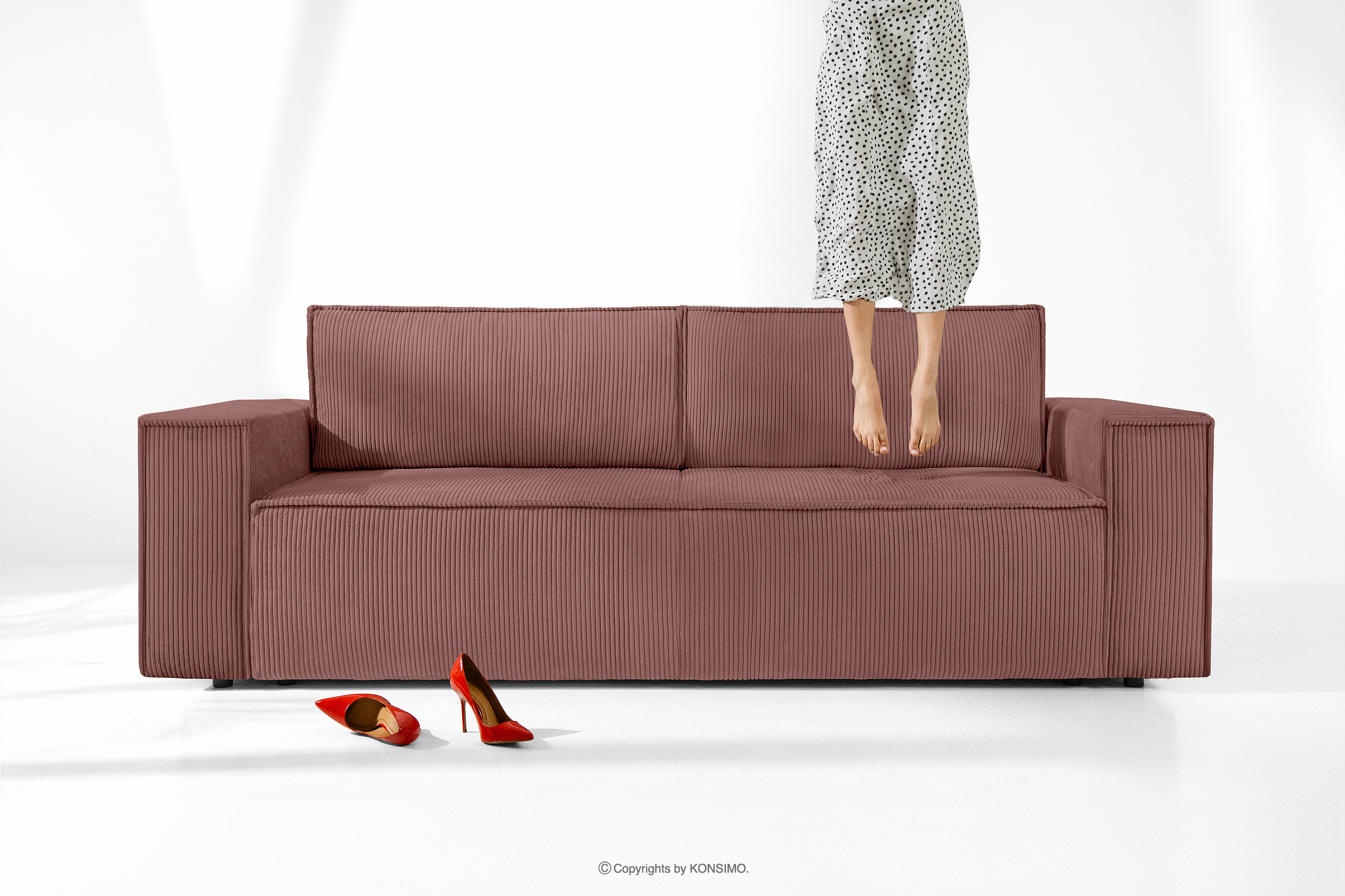Trojmiestna pohovka s kontajnerom na posteľnú bielizeň ružovej farby je kus nábytku v modernistickom štýle. Jej charakteristické široké boky ju vyčleňujú z radu štandardného nábytku. To je však len začiatok jej mimoriadnych možností. Opierkové vankúše sú dokonalou oporou pre váš chrbát a vďaka svojim veľkým rozmerom aj skvele vyzerajú. Celé čalúnenie tohto výnimočného kusu nábytku je vyrobené z manšestrovej látky, ktorá je nielen príjemná na dotyk, ale aj si dlho zachováva neporušený vzhľad.