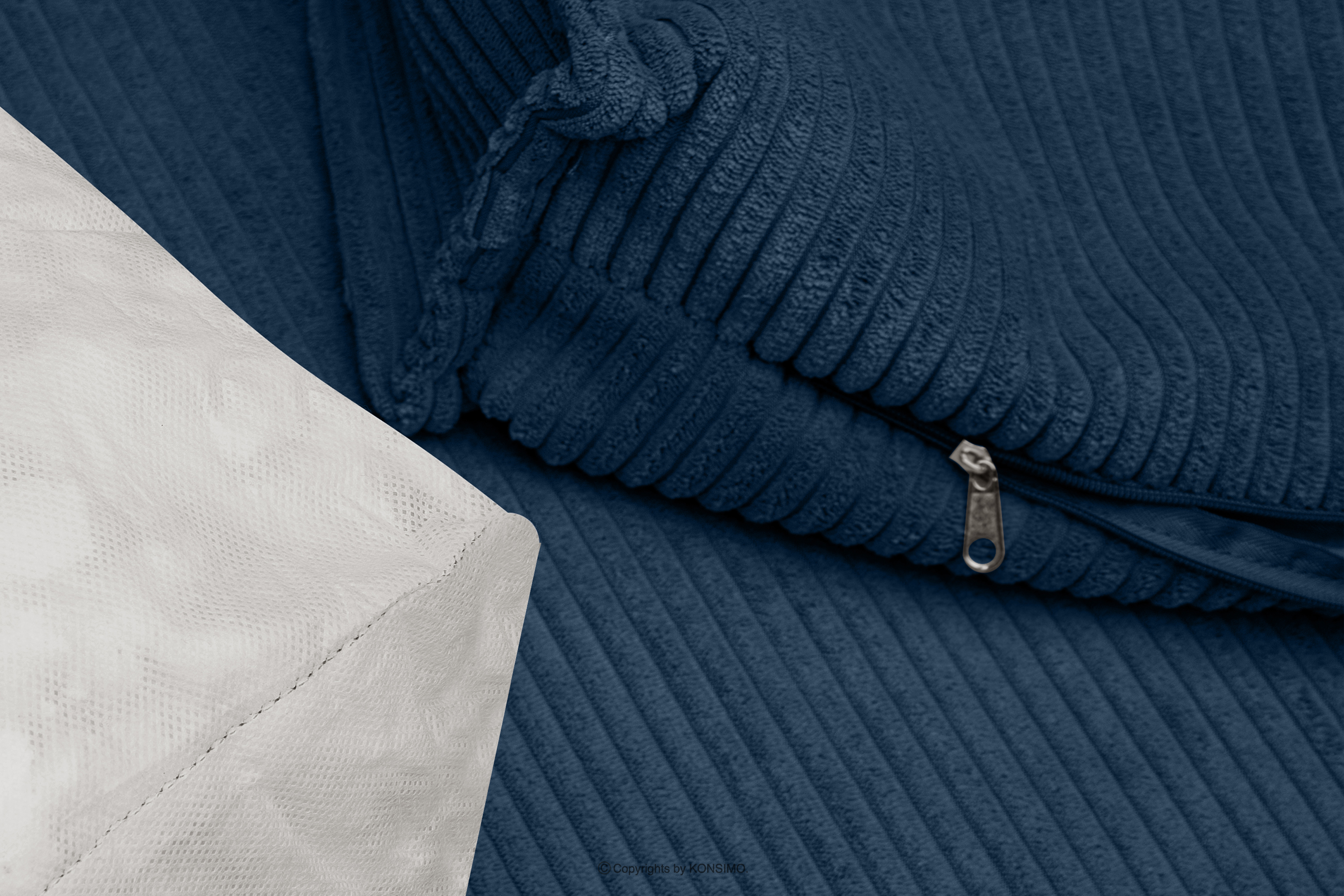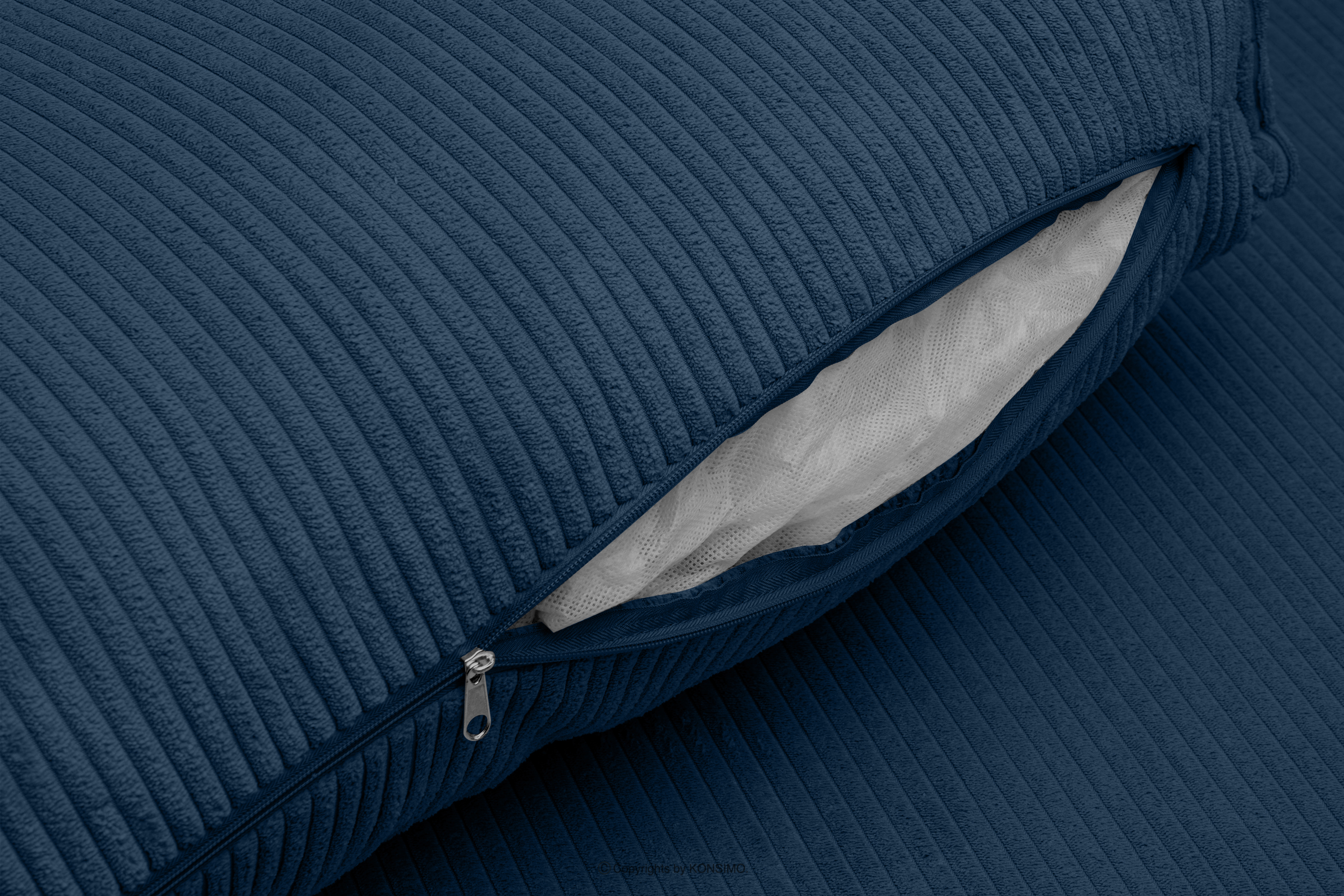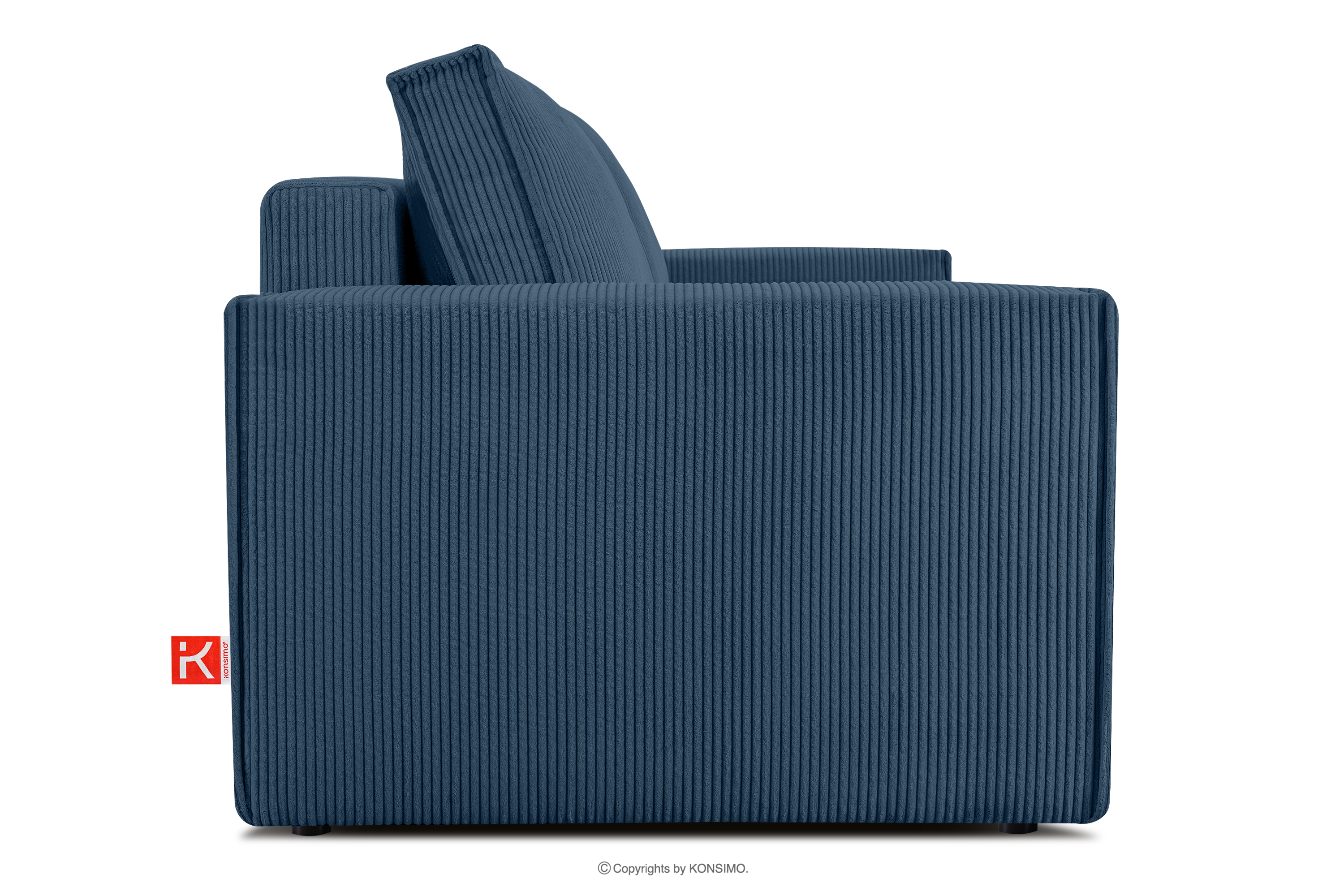 Trojmiestna pohovka s kontajnerom na posteľnú bielizeň námornícka modrá je kus nábytku v modernistickom štýle. Jej charakteristické široké boky ju vyčleňujú z radu štandardného nábytku. To je však len začiatok jej mimoriadnych možností. Opierkové vankúše sú dokonalou oporou pre váš chrbát a vďaka svojim veľkým rozmerom aj skvele vyzerajú. Celé čalúnenie tohto výnimočného kusu nábytku je vyrobené z manšestrovej látky, ktorá je nielen príjemná na dotyk, ale aj si dlho zachováva neporušený vzhľad.