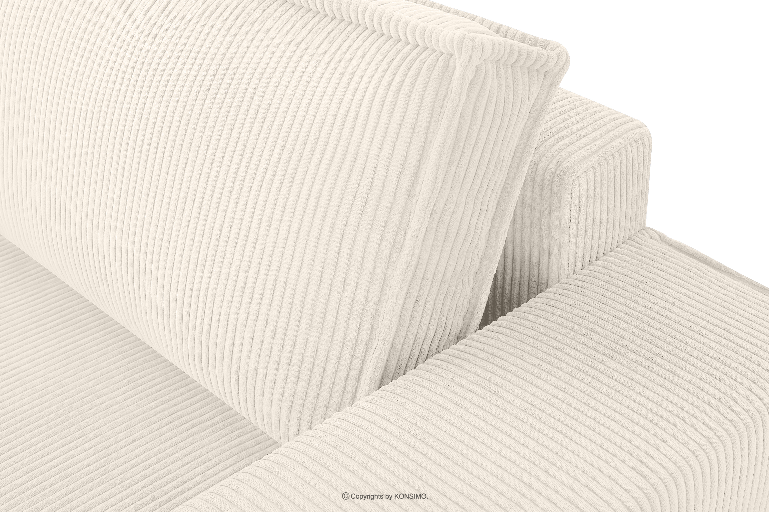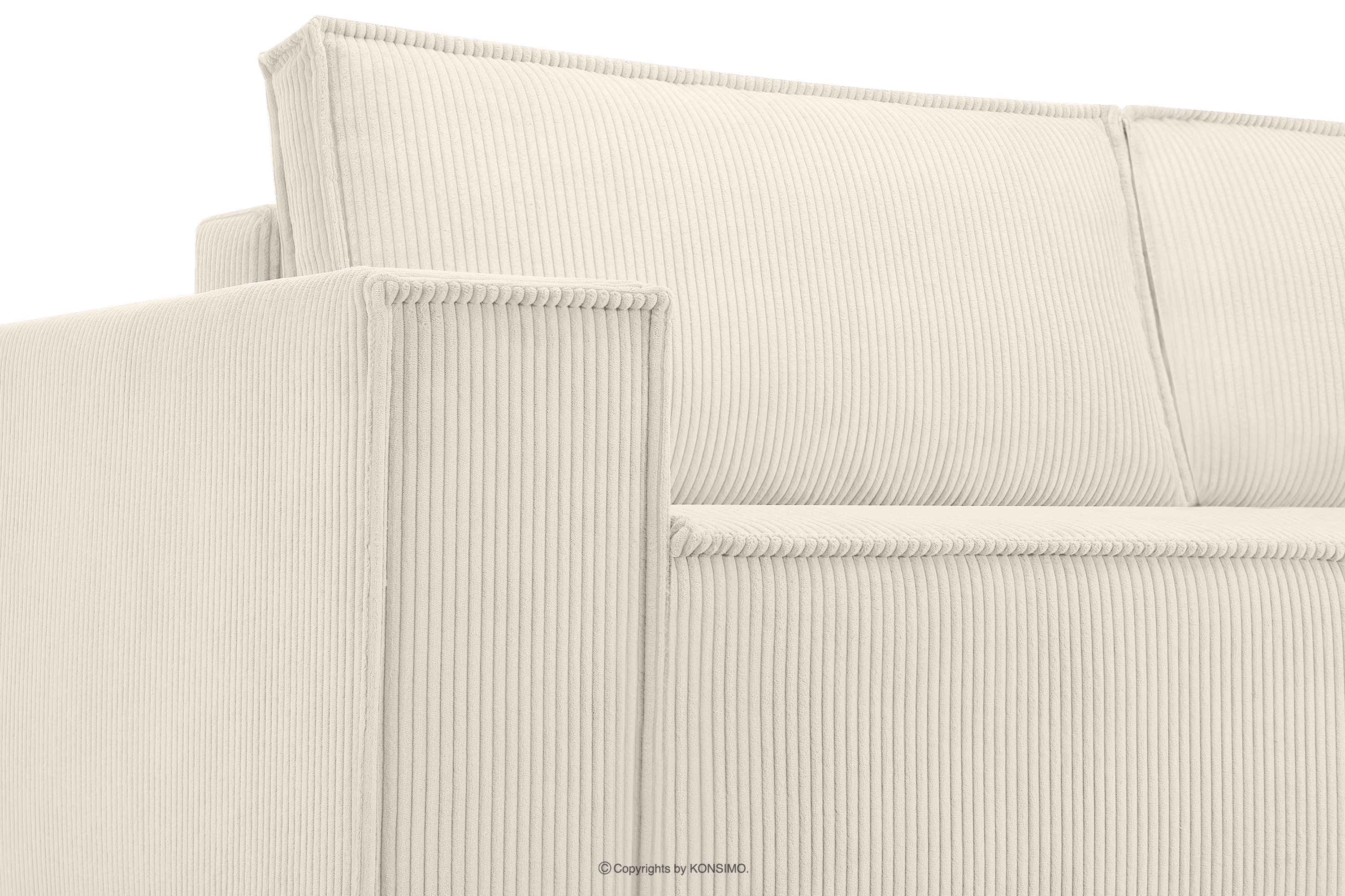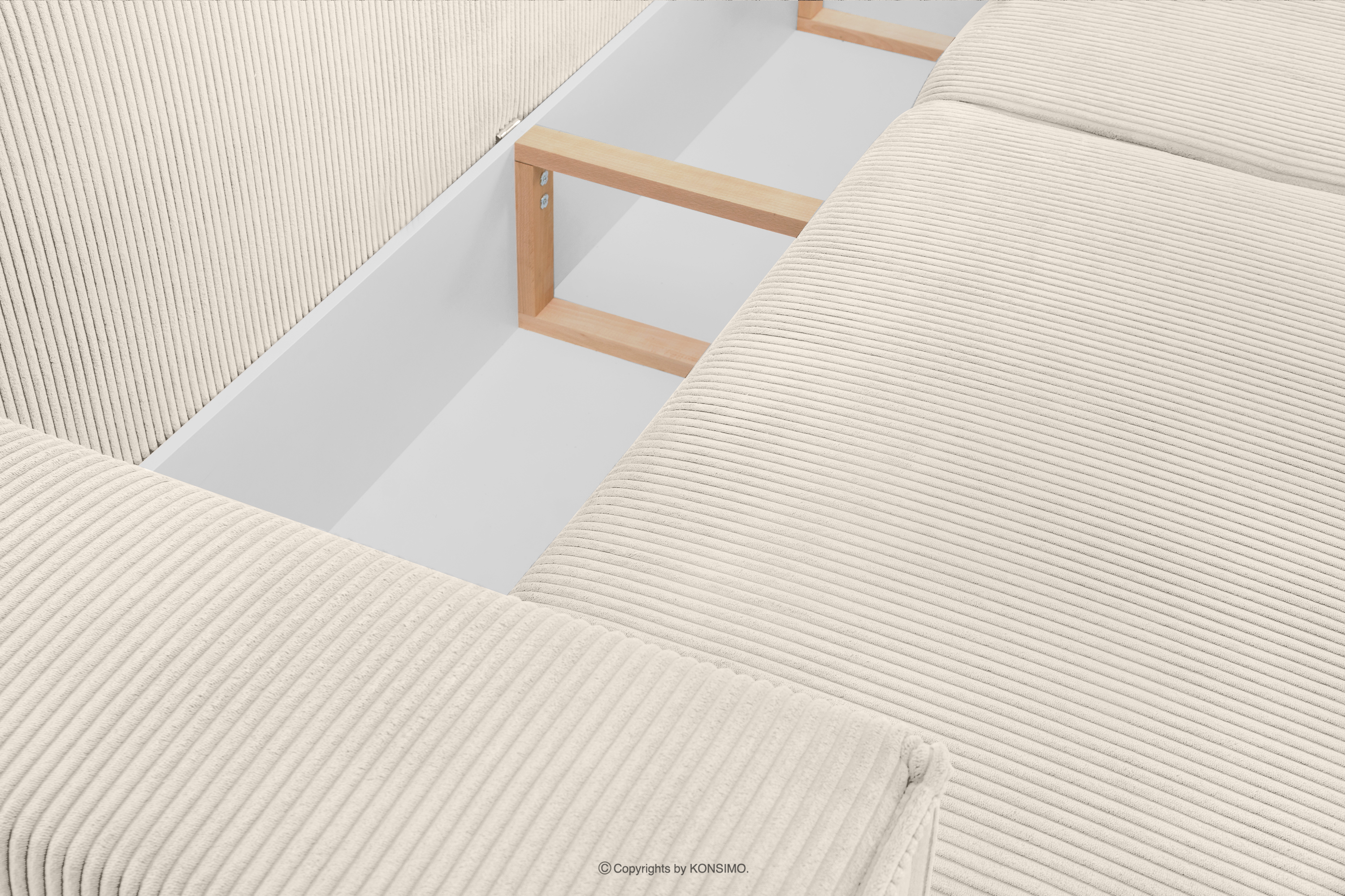 Trojmiestna pohovka s kontajnerom na lôžkoviny ecru je kus nábytku v modernistickom štýle. Jej charakteristické široké boky ju vyčleňujú z radu štandardného nábytku. To je však len začiatok jej mimoriadnych možností. Opierkové vankúše poskytujú ideálnu oporu pre váš chrbát a vďaka svojim veľkým rozmerom aj skvele vyzerajú. Celé čalúnenie tohto výnimočného kusu nábytku je vyrobené z manšestrovej látky, ktorá je nielen príjemná na dotyk, ale aj si dlho zachováva neporušený vzhľad.