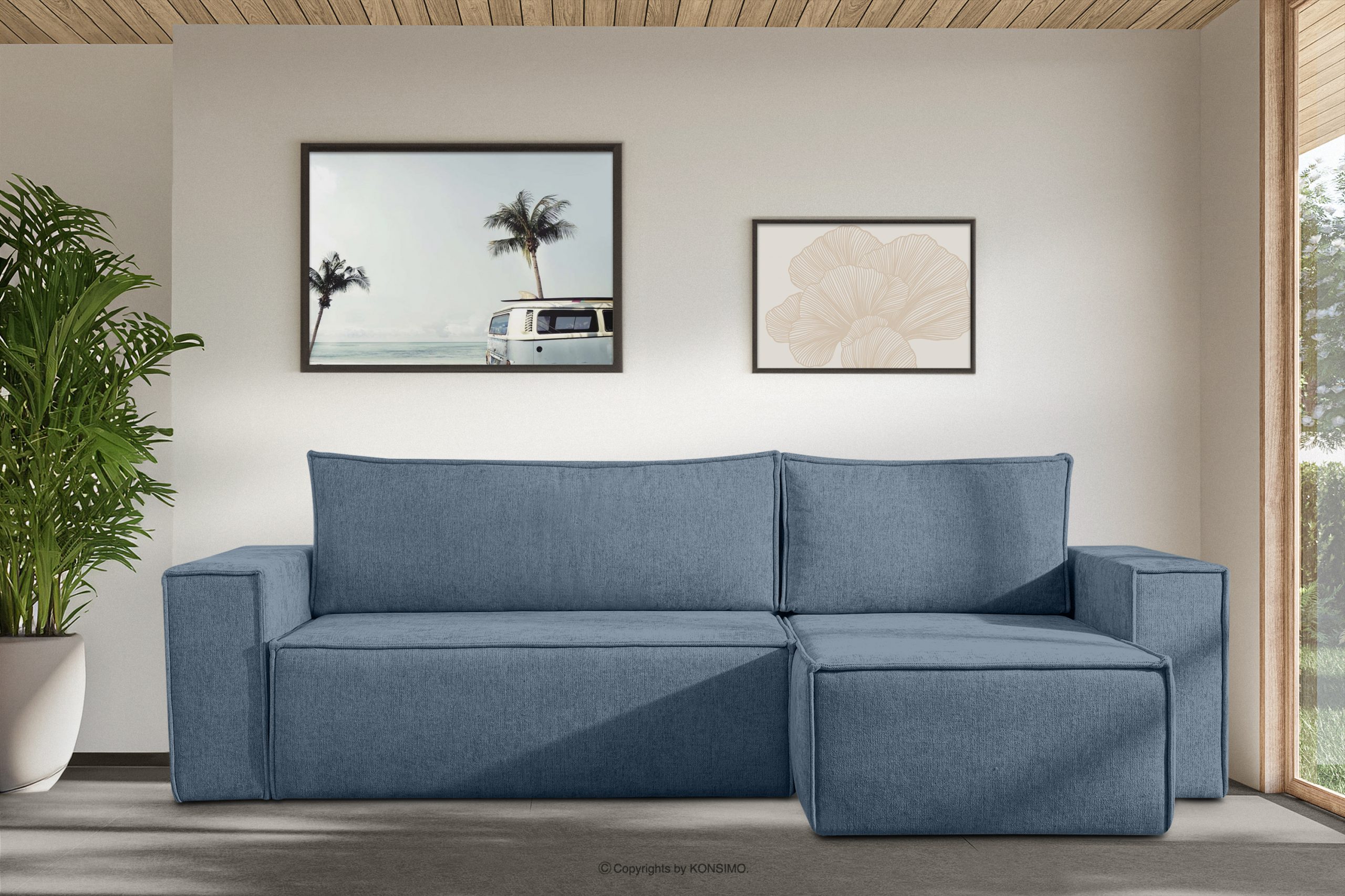 Rohová sedacia súprava v tkanej látke s funkciou spania svetlo modrá ľavá/pravá je kus nábytku v modernistickom štýle. Má široké bočnice typu HAWAI, vďaka čomu je vhodnejšia do väčších miestností. Je to univerzálna rohová sedacia súprava, čo znamená, že si môžete vybrať stranu, na ktorej chcete mať sedačku. Stranu môžete časom zmeniť aj sami.