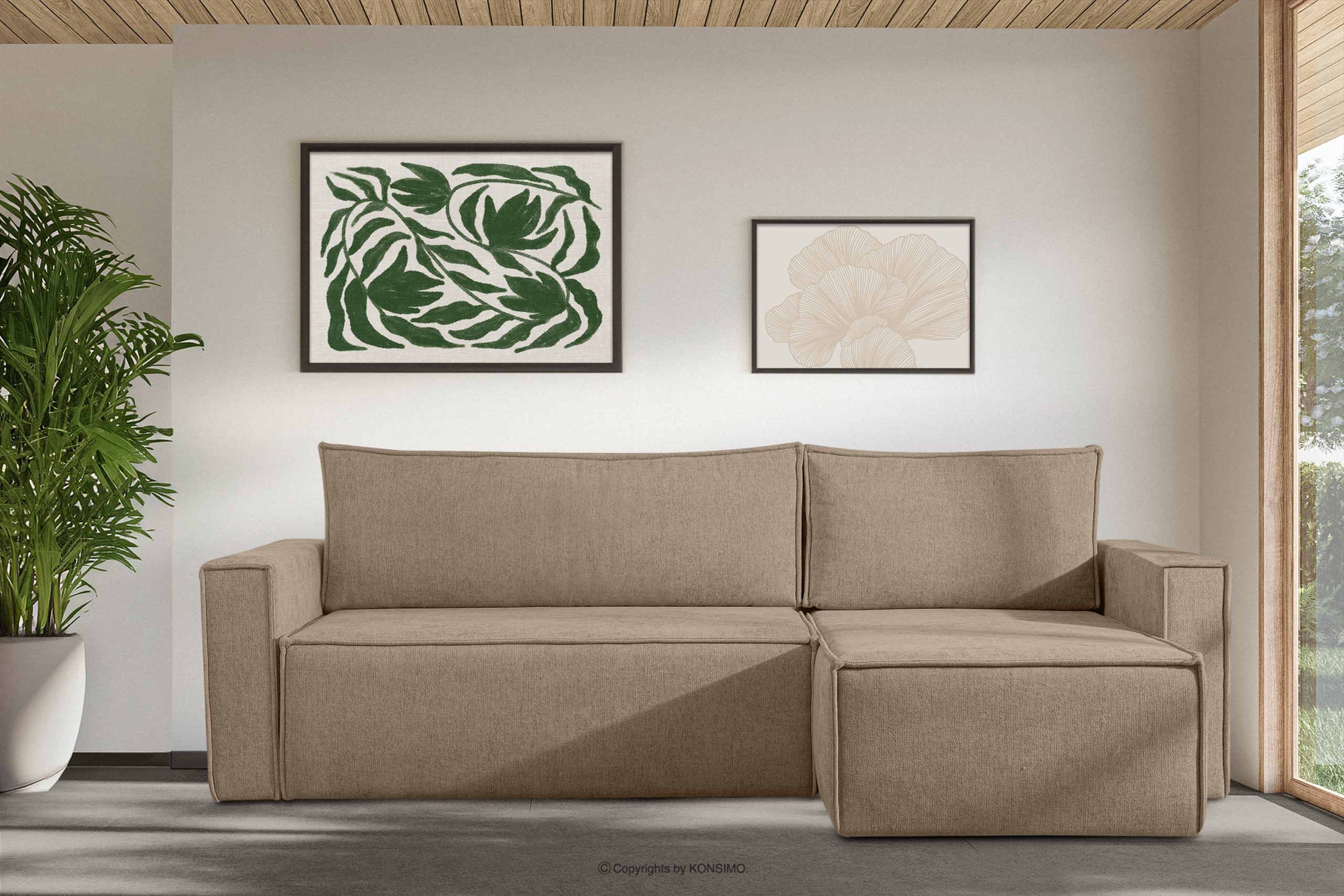 Rohová pohovka s funkciou spania v kockovanej látke svetlohnedej farby vľavo/vpravo je kus nábytku v modernistickom štýle. Má široké bočnice typu HAWAI, vďaka čomu je vhodnejšia do väčších miestností. Je to univerzálna rohová pohovka, čo znamená, že si môžete vybrať stranu, na ktorej chcete pohovku mať. Stranu môžete časom zmeniť aj sami.