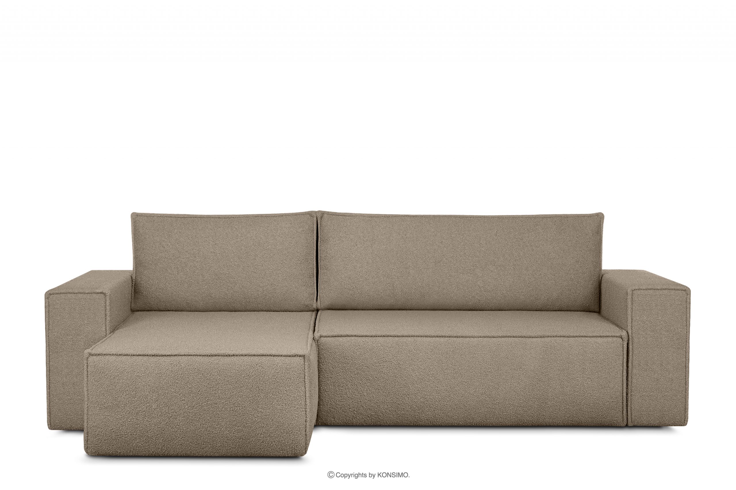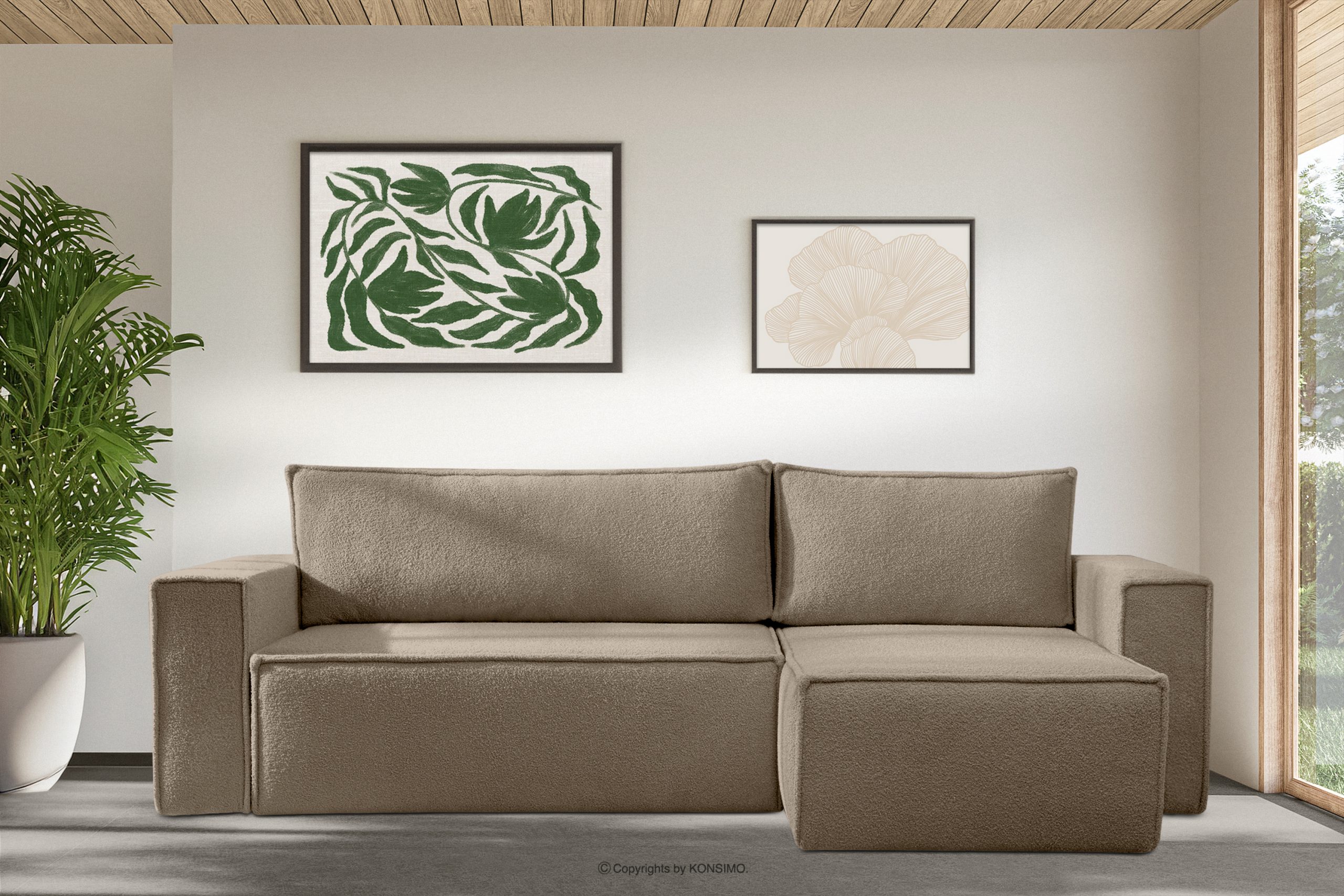 Stranu rohovej pohovky určíte tak, že sa postavíte pred posteľ čelom k pohovke. Čalúnenie je vyrobené z látky boucle, ktorá je príjemná na dotyk, ľahko sa čistí a dlho si zachováva svoj vzhľad.