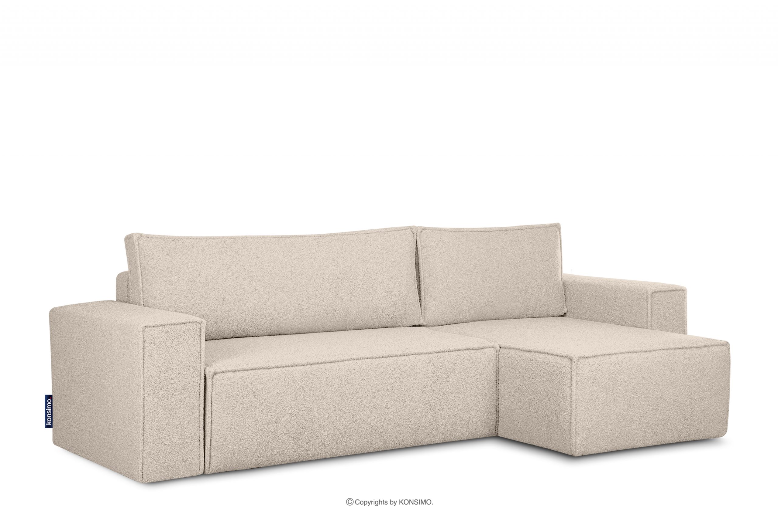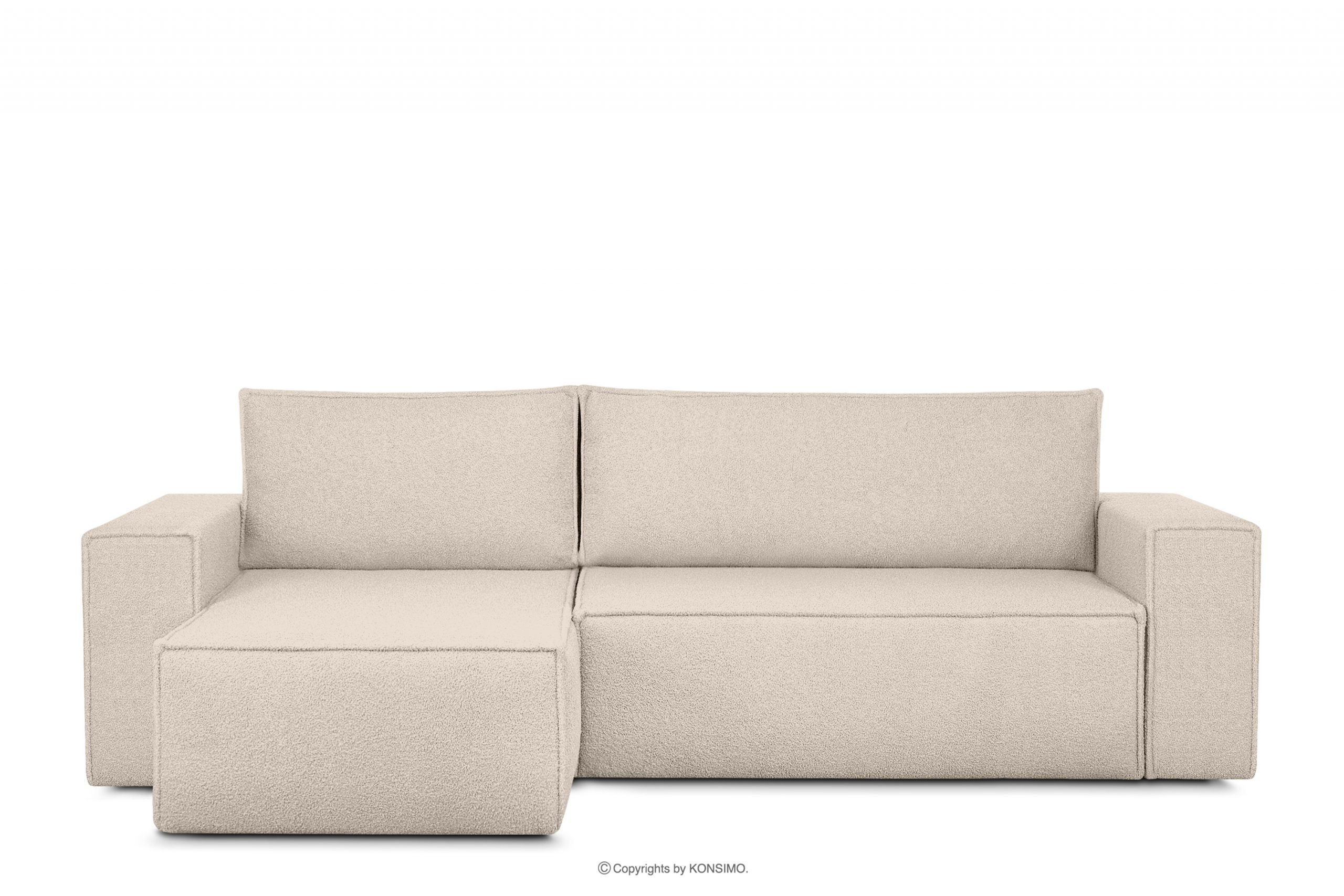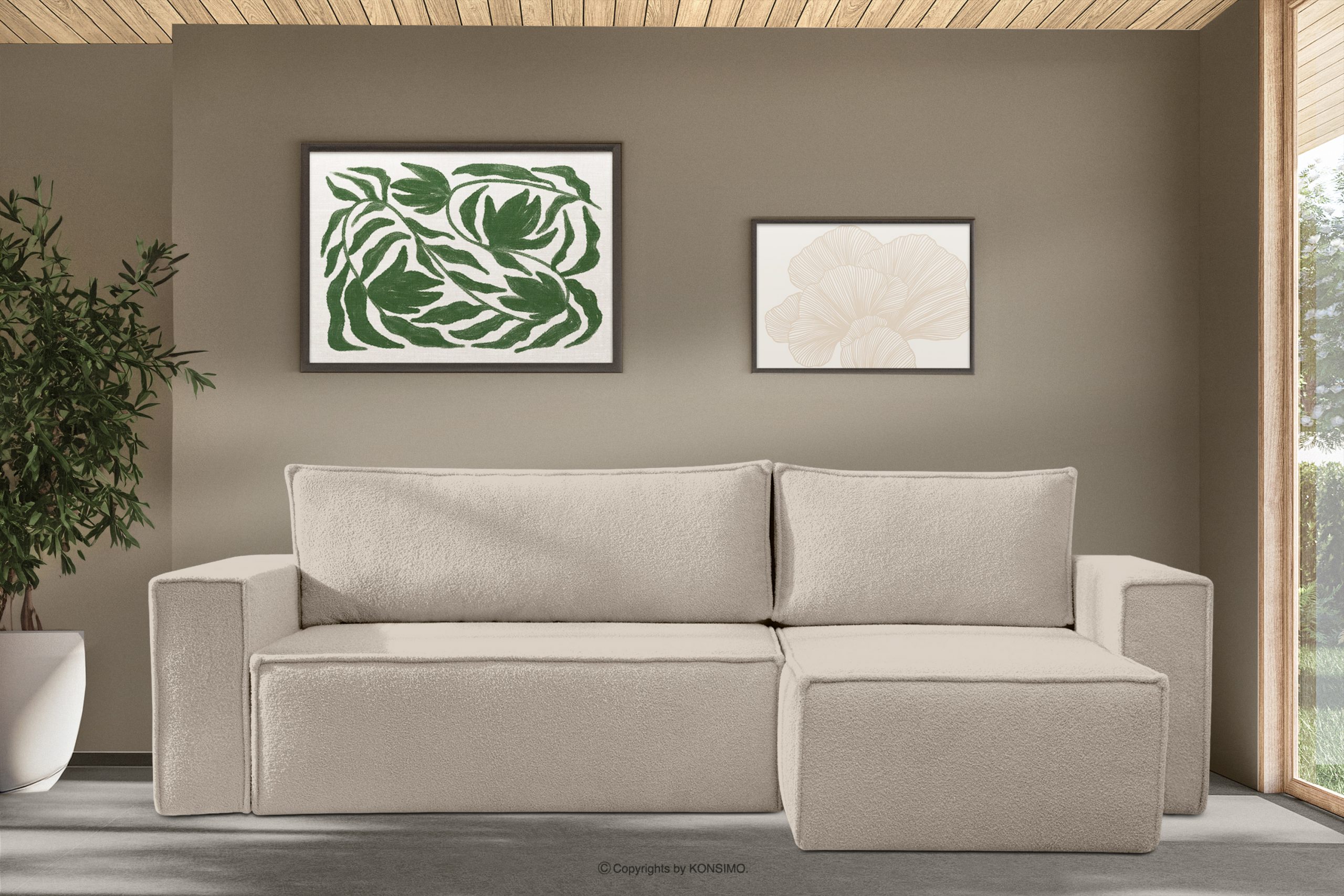 Rohová pohovka boucle s funkciou spania vľavo/vpravo v tvare slonoviny je kus nábytku v modernistickom štýle. Má široké bočné strany typu HAWAI, vďaka čomu je vhodnejšia do väčších miestností. Je to univerzálna rohová pohovka, čo znamená, že má ďalšiu funkciu, a to, že si môžete vybrať, na ktorej strane chcete mať sedačku.