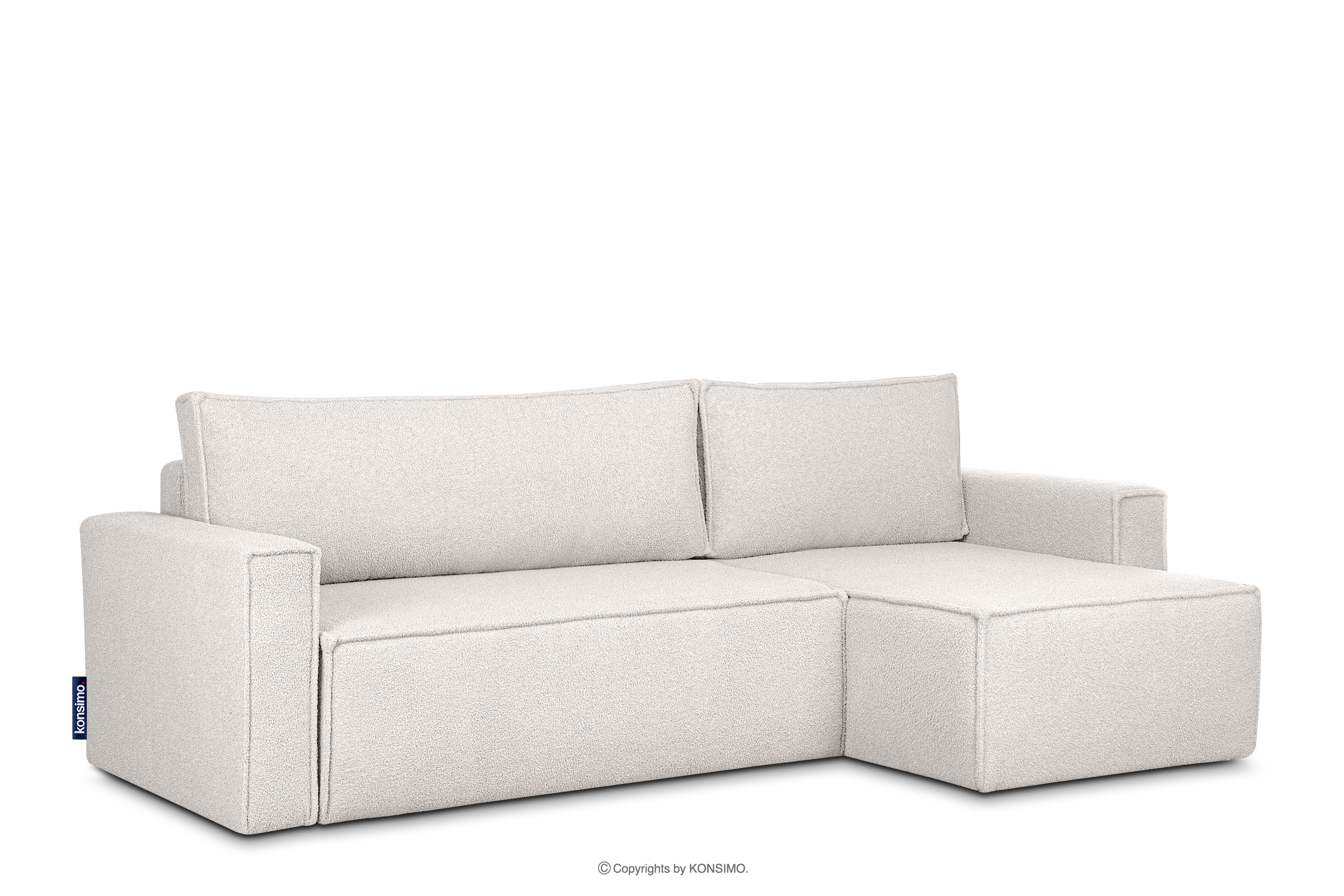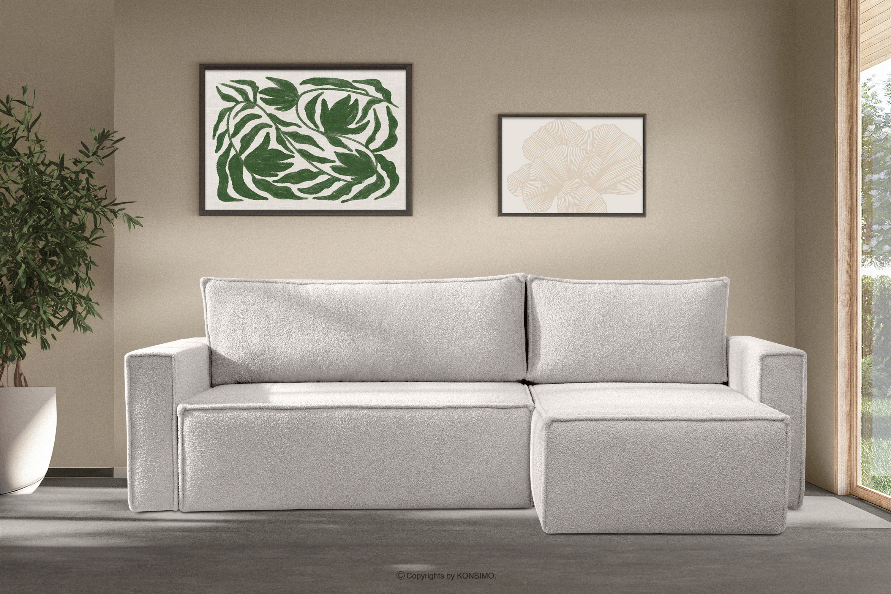 Rohová pohovka Boucle s funkciou spania biela ľavá/pravá je kus nábytku v modernistickom štýle. Má široké bočnice typu HAWAI, vďaka čomu je vhodnejšia do väčších miestností. Je to univerzálna rohová pohovka, čo znamená, že má ďalšiu funkciu, a to, že si môžete vybrať, na ktorej strane chcete pohovku mať. Stranu si môžete po čase zmeniť aj sami.