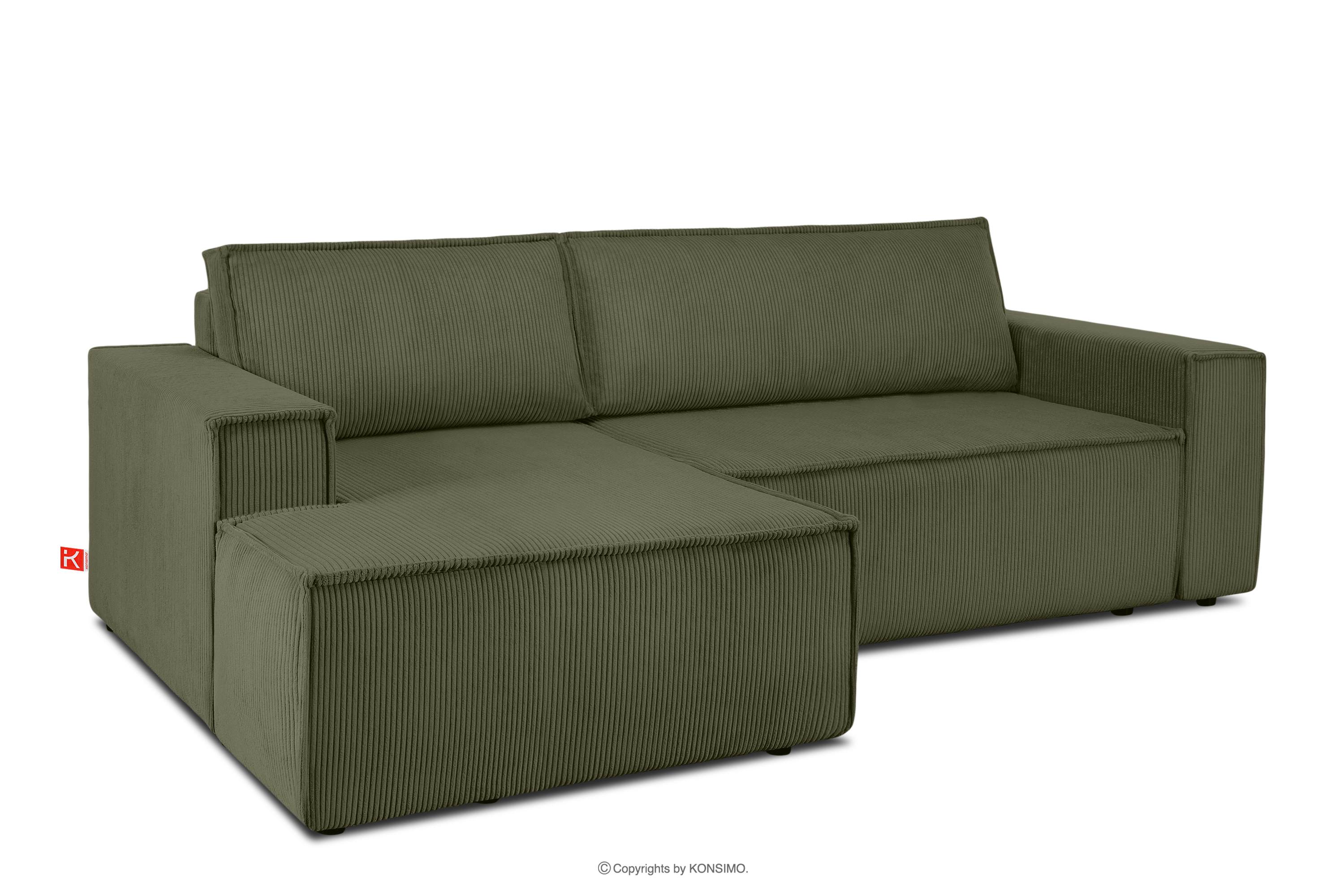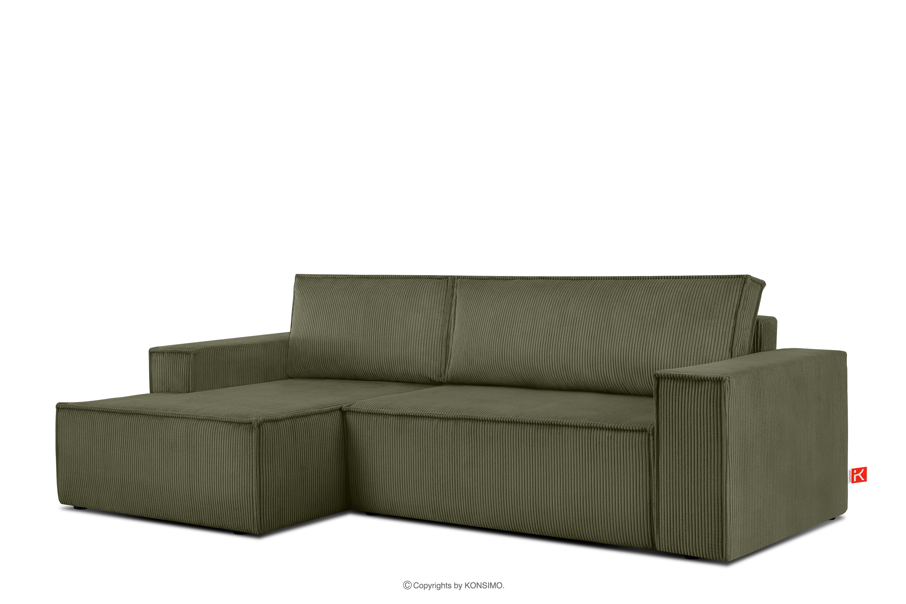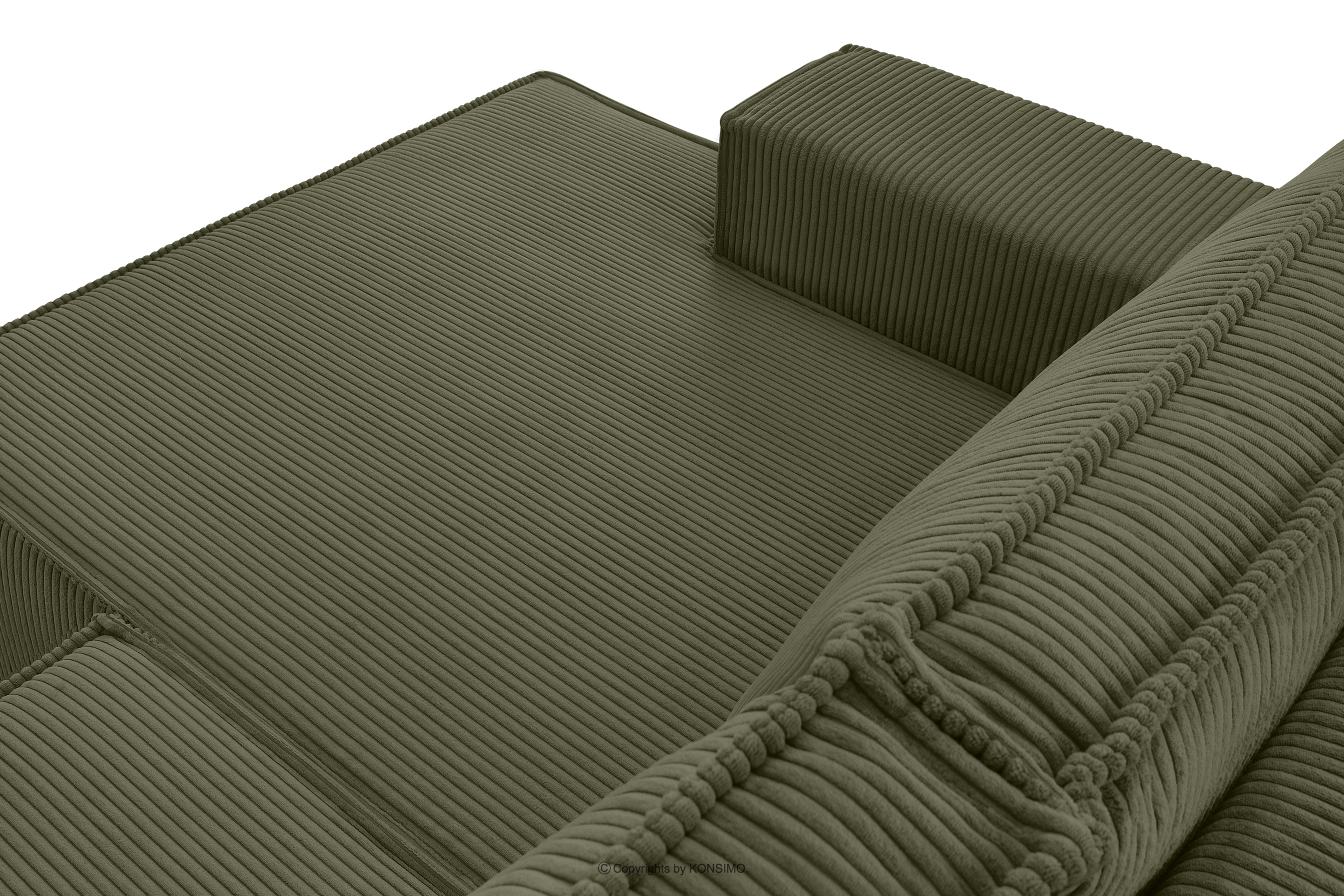Olivový manšestrový ľavý rozkladací gauč do obývačky priťahuje pozornosť, čím sa odlišuje od ostatného nábytku. Celé čalúnenie tohto výnimočného kusu nábytku je vyrobené z jemnej manšestrovej látky, ktorá zaručuje nielen príjemný komfort na dotyk, ale aj dlhotrvajúcu dokonalú estetiku. Vďaka tejto látke bude váš roh NAPI vždy vyzerať dokonale bez ohľadu na čas alebo podmienky používania.