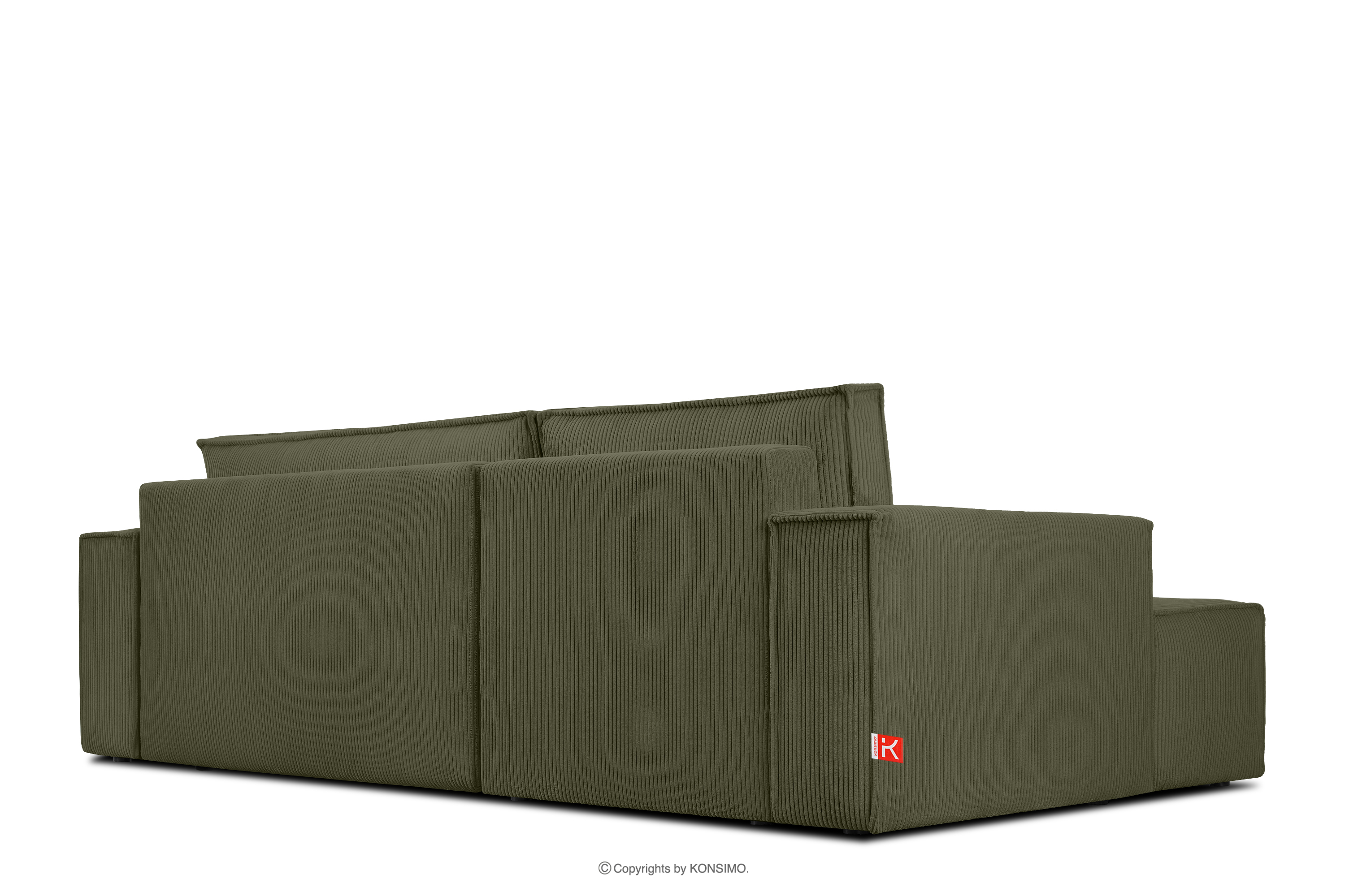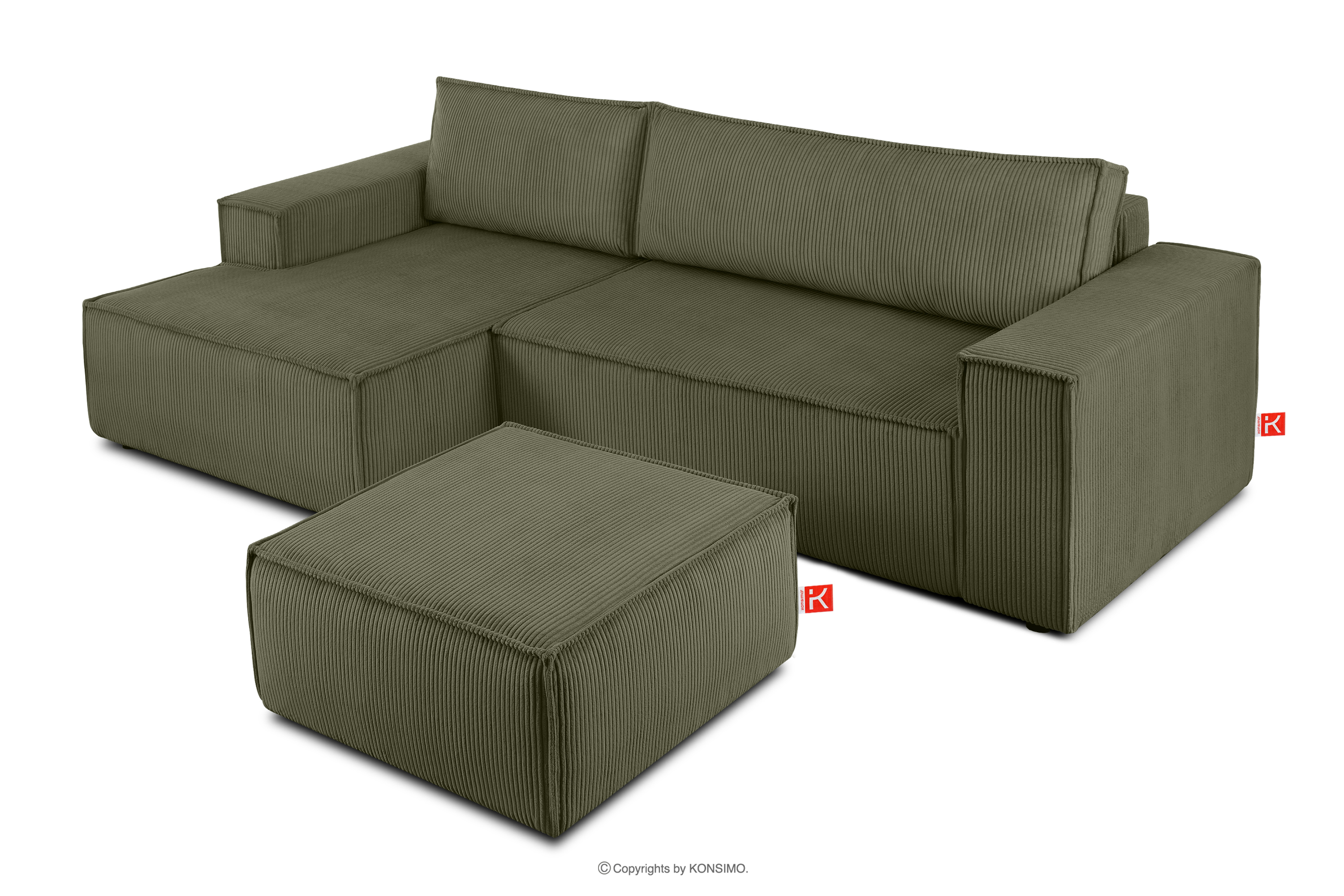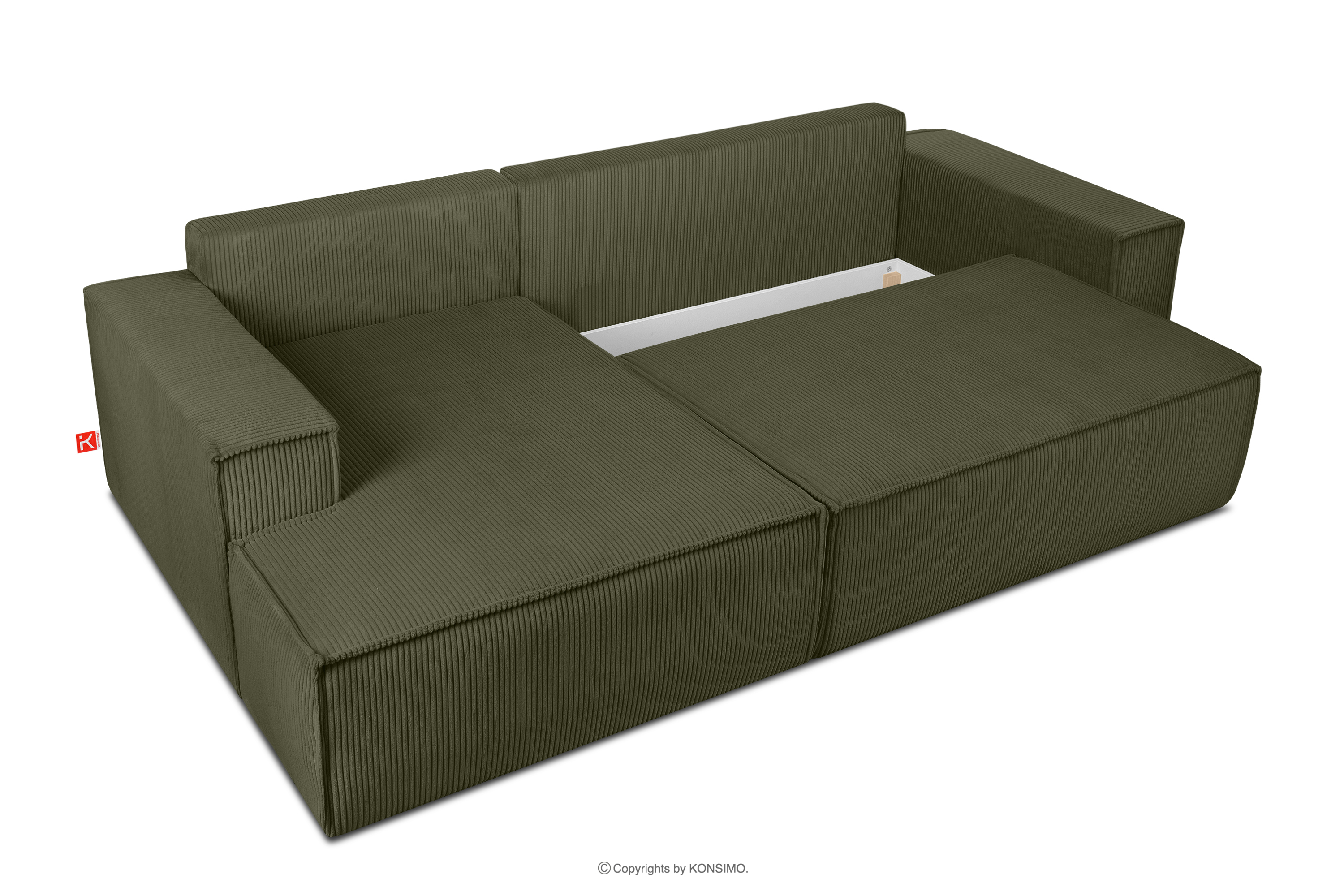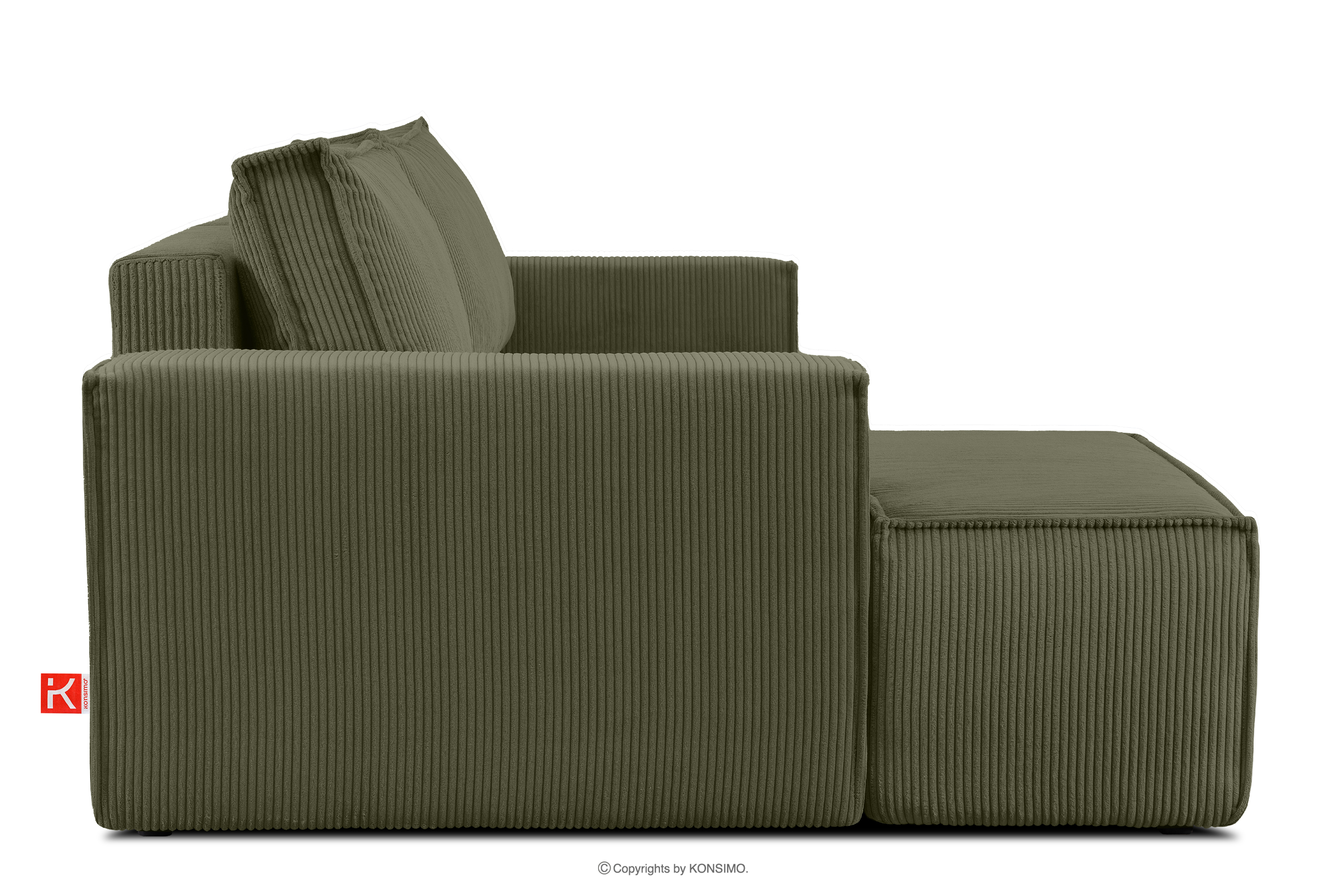 Olivový manšestrový ľavý rozkladací gauč do obývačky priťahuje pozornosť, čím sa odlišuje od ostatného nábytku. Celé čalúnenie tohto výnimočného kusu nábytku je vyrobené z jemnej manšestrovej látky, ktorá zaručuje nielen príjemný komfort na dotyk, ale aj dlhotrvajúcu dokonalú estetiku. Vďaka tejto látke bude váš roh NAPI vždy vyzerať dokonale bez ohľadu na čas alebo podmienky používania.