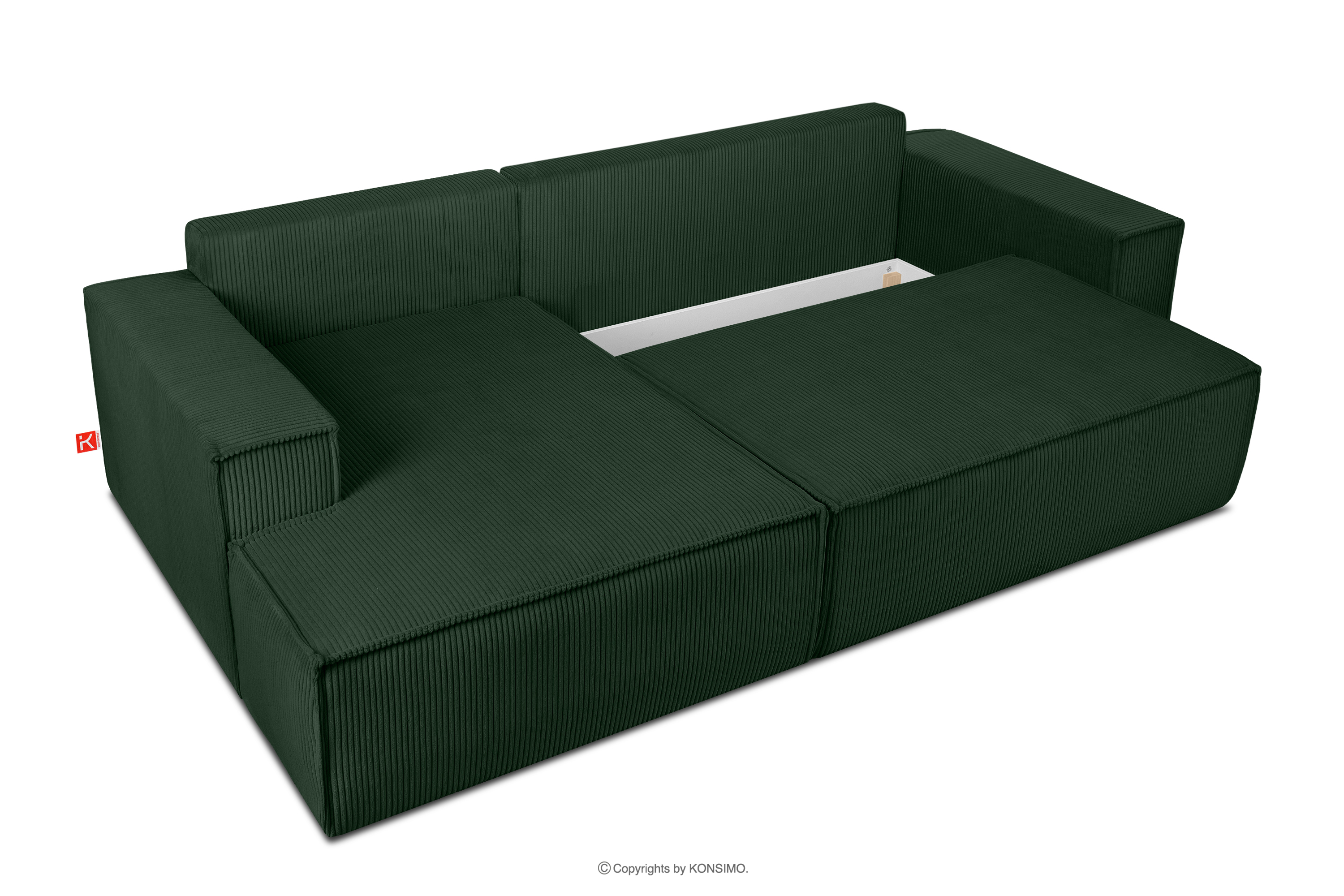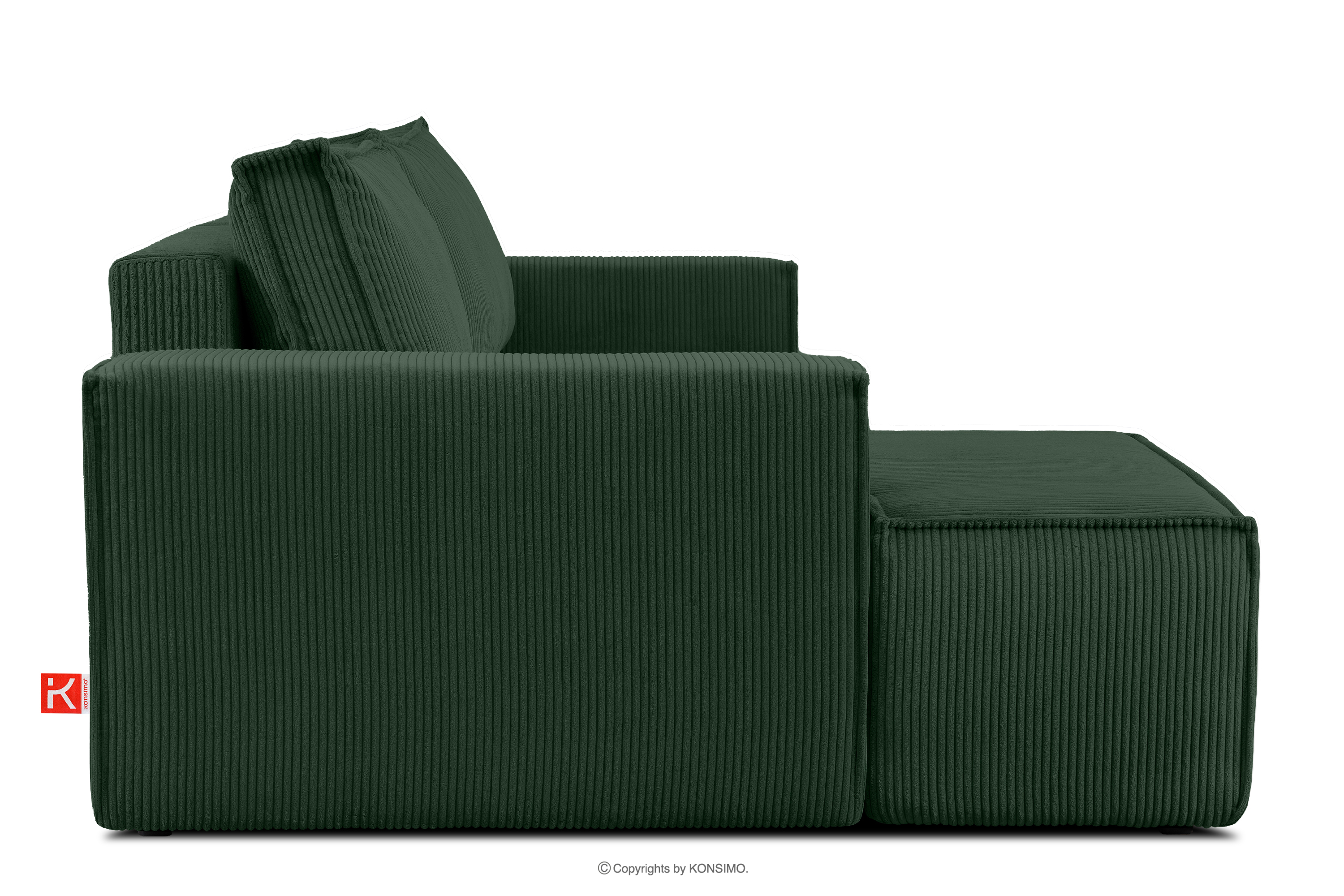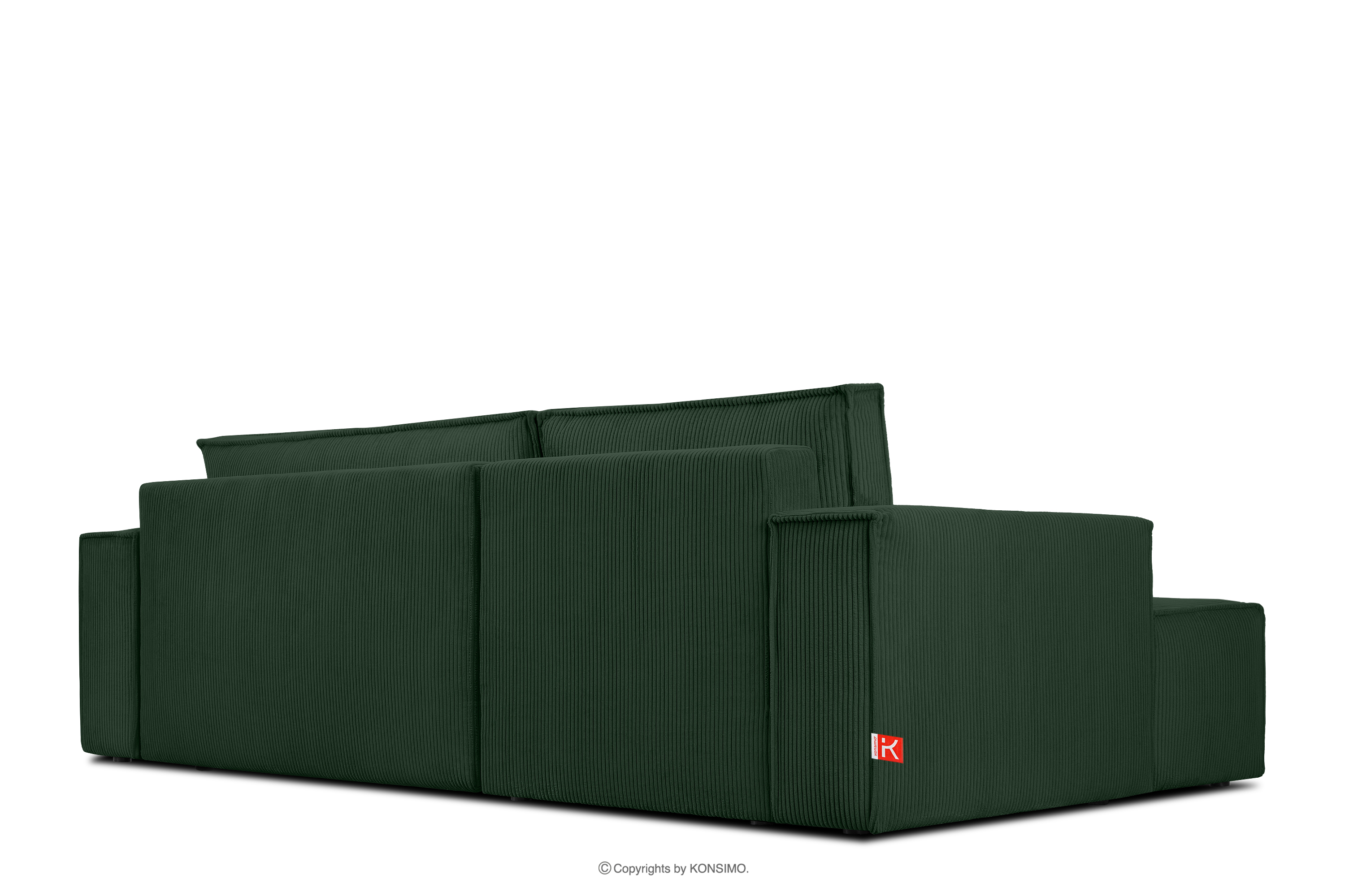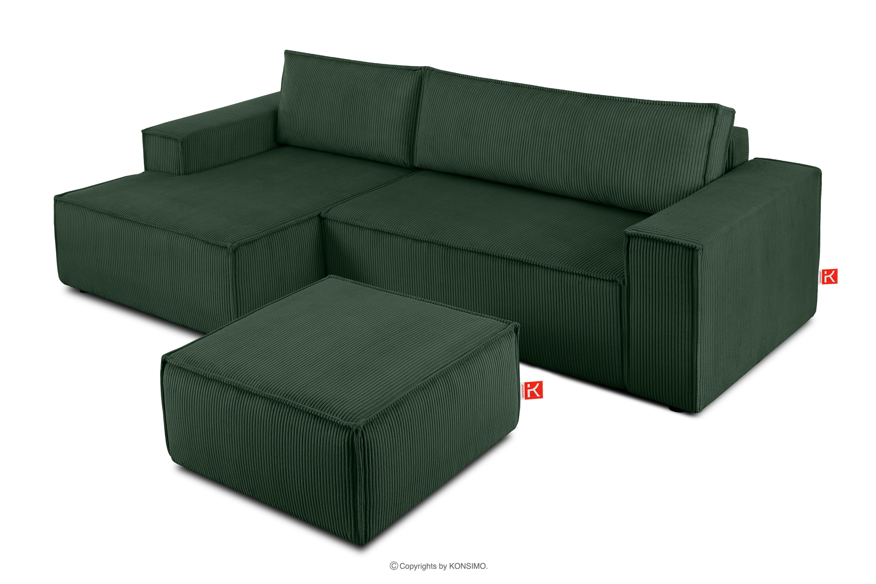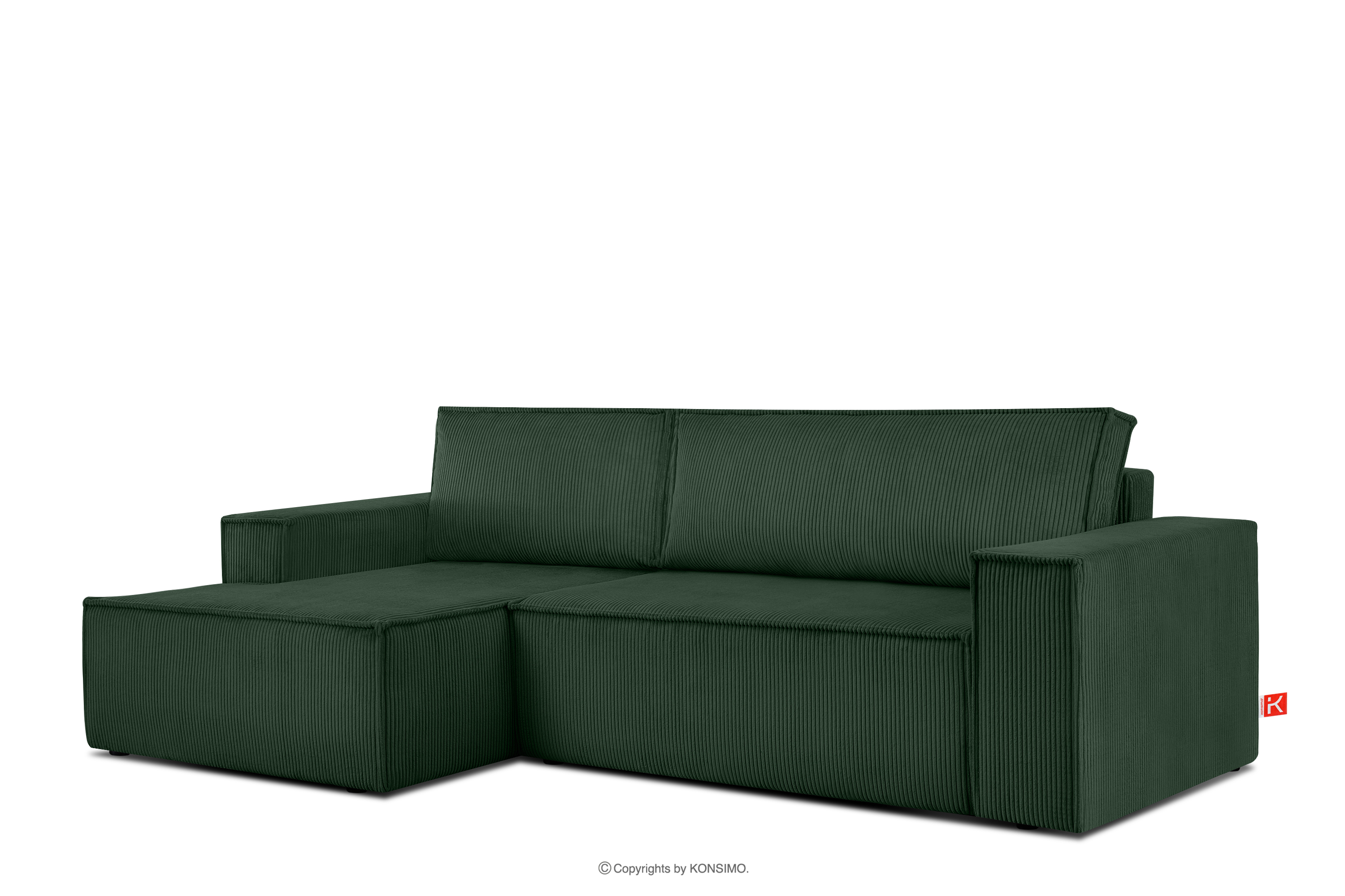 Tmavozelená manšestrová ľavá rozkladacia pohovka do obývačky priťahuje pozornosť, čím sa odlišuje od ostatného nábytku. Celé čalúnenie tohto výnimočného kusu nábytku je vyrobené z jemnej manšestrovej látky, ktorá zaručuje nielen príjemný komfort na dotyk, ale aj dlhotrvajúcu dokonalú estetiku. Vďaka tejto látke bude váš roh NAPI vždy vyzerať dokonale bez ohľadu na čas alebo podmienky používania.