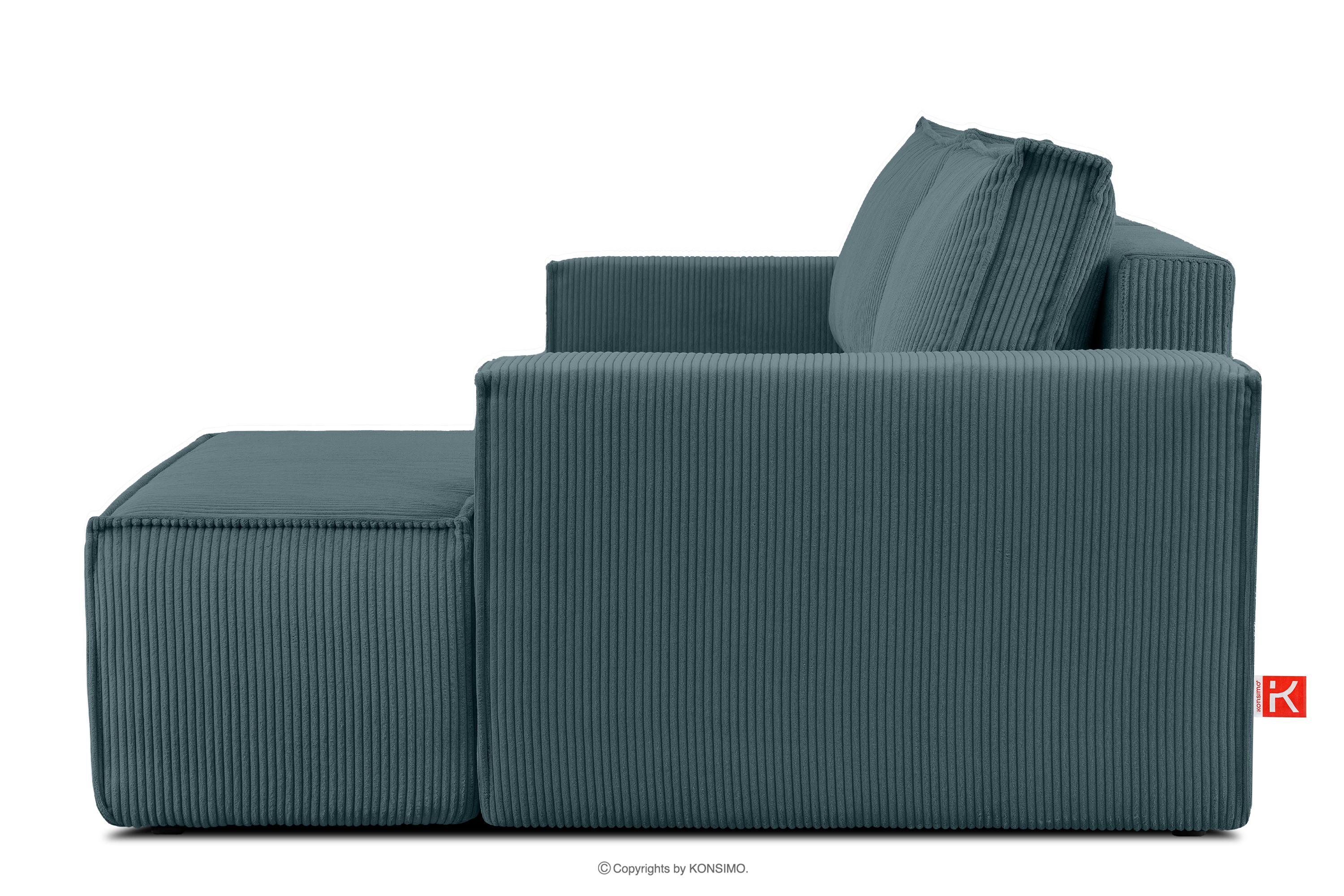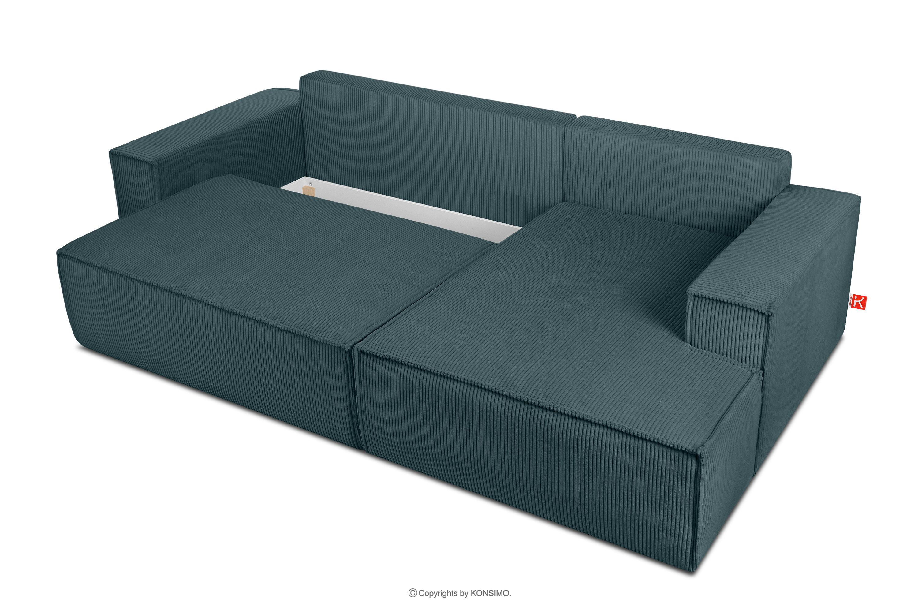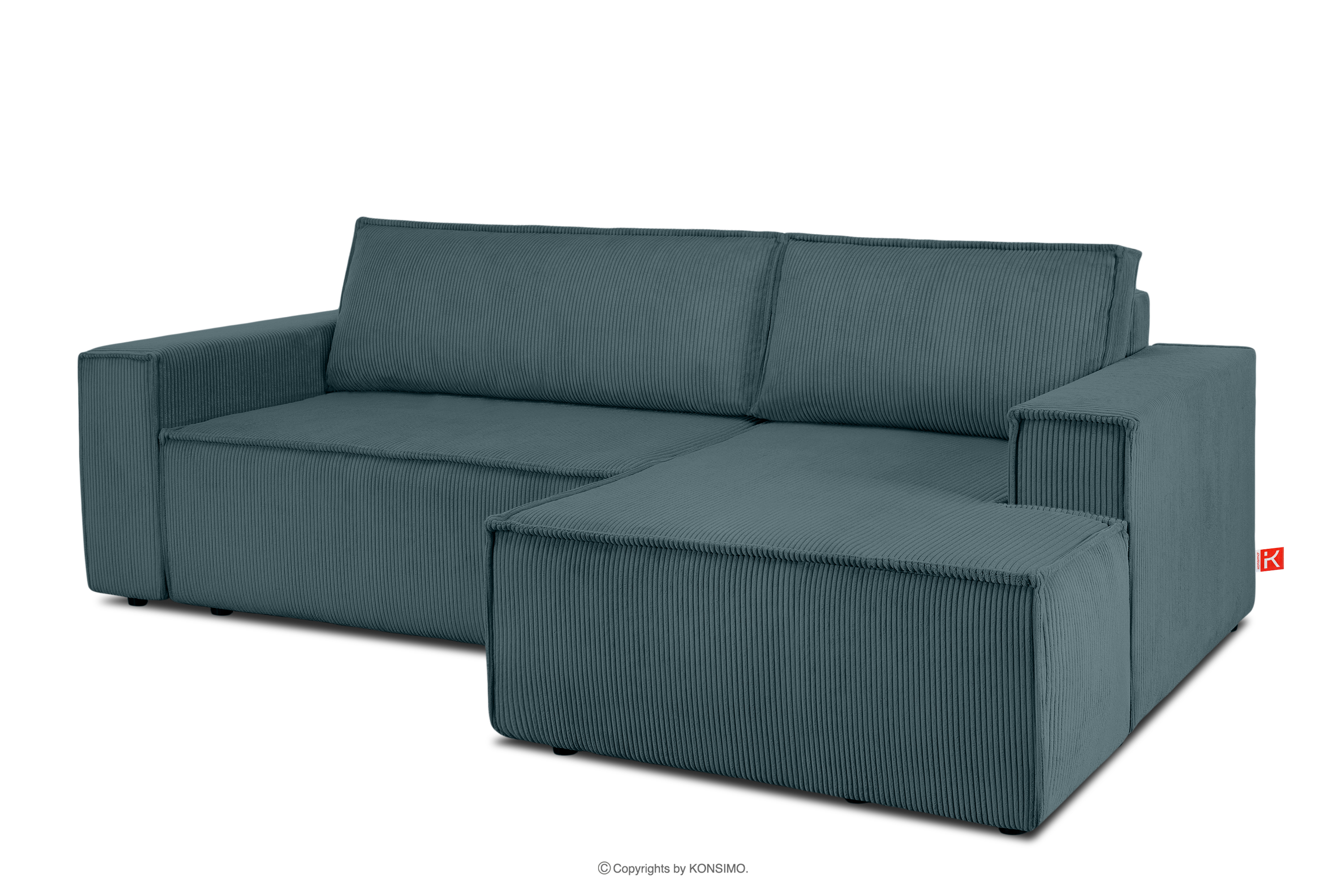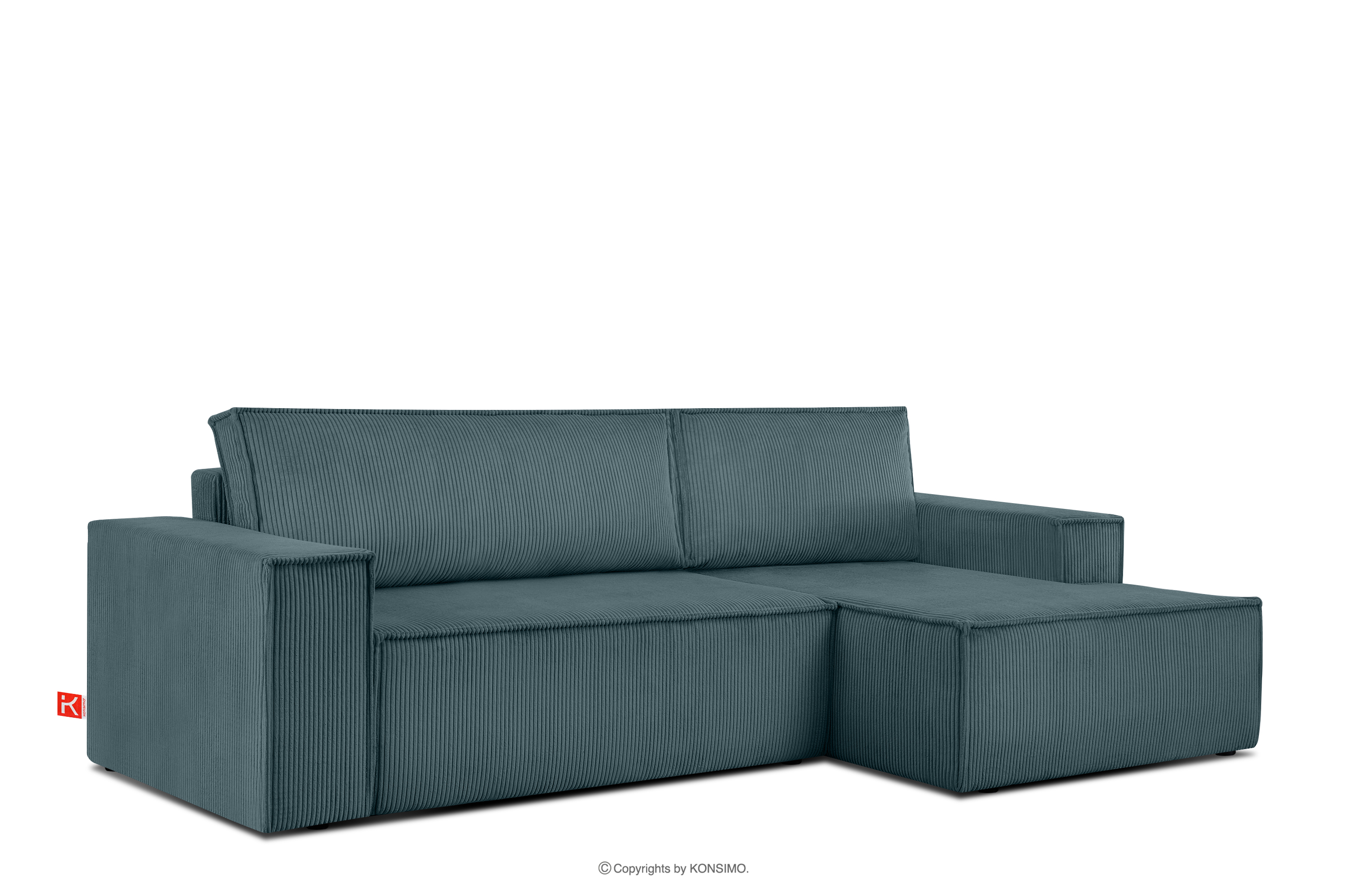 NAPI Rozkladacia rohová pohovka s truhlicou na lôžkoviny modrá manšestrová vpravo