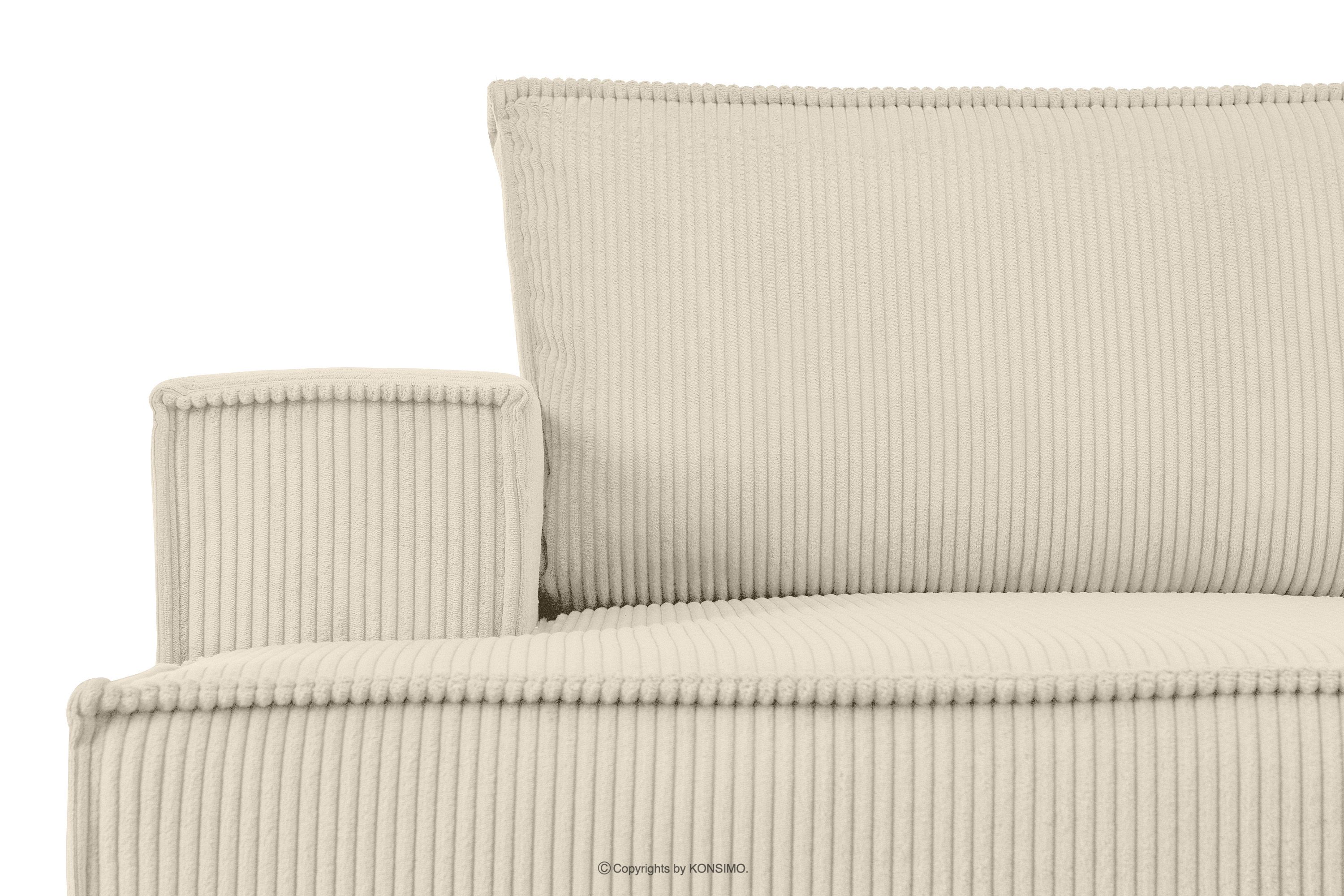 Rozkladacia rohová sedacia súprava s posteľným boxom krémovej farby z manšestru vpravo upúta pozornosť, vďaka čomu vynikne medzi ostatným nábytkom. Celé čalúnenie tohto výnimočného kusu nábytku je vyrobené z jemnej manšestrovej látky, ktorá zaručuje nielen príjemný komfort na dotyk, ale aj dlhotrvajúcu dokonalú estetiku. Vďaka tejto látke bude váš roh NAPI vždy vyzerať dokonale bez ohľadu na čas alebo podmienky používania.