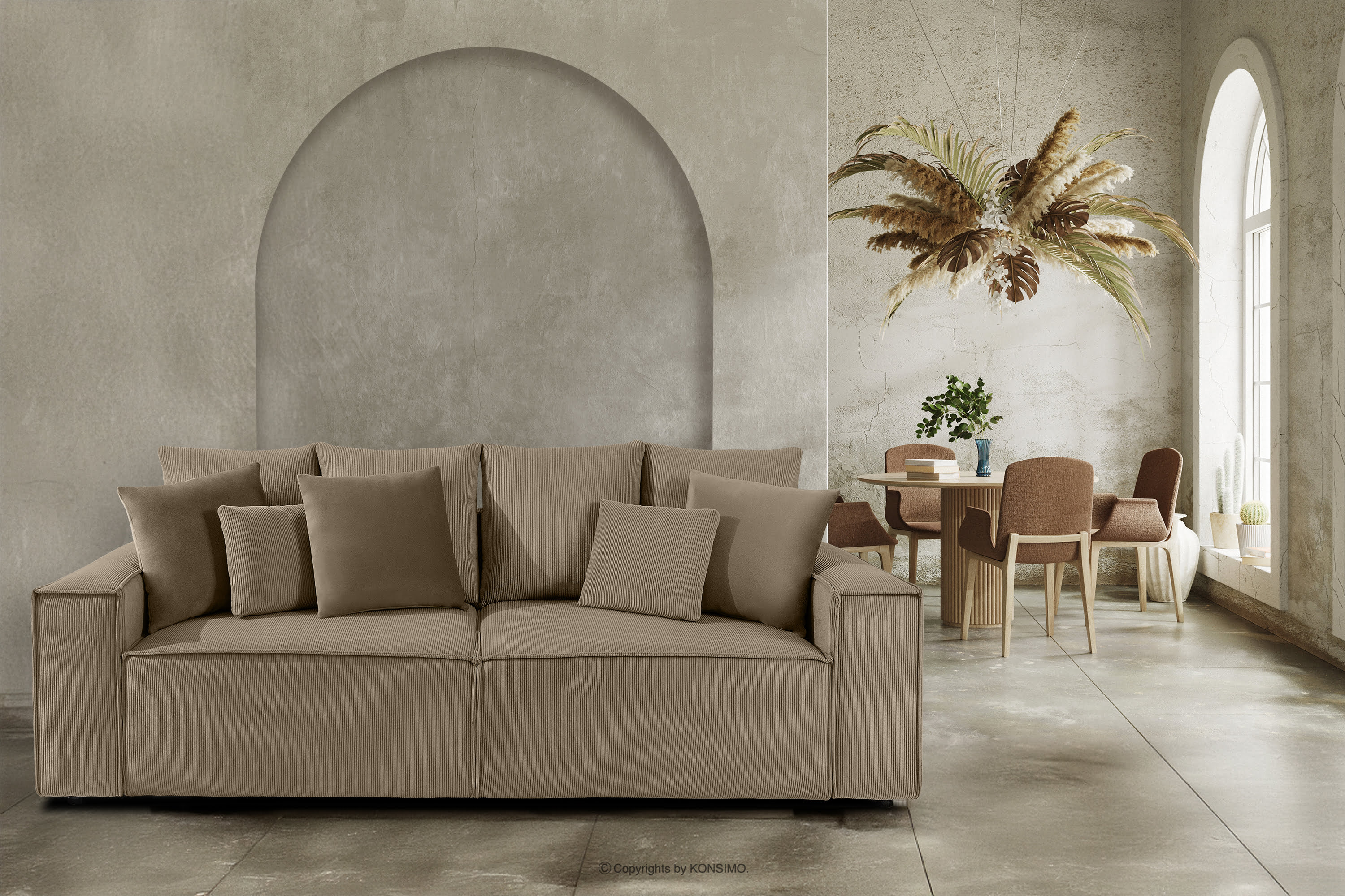 Trojmiestna pohovka s vankúšmi manšestrová/velúrová béžová je kus nábytku v modernistickom štýle.Vďaka charakteristickým širokým bočniciam vyčnieva z radu štandardného nábytku. To je však len začiatok jej mimoriadnych možností. Opierkové vankúše sú dokonalou oporou pre váš chrbát a vďaka veľkým rozmerom aj skvele vyzerajú. Okrem toho je k dispozícii niekoľko dekoračných vankúšov v rôznych veľkostiach a látkach, ktoré pohovku zdobia.
