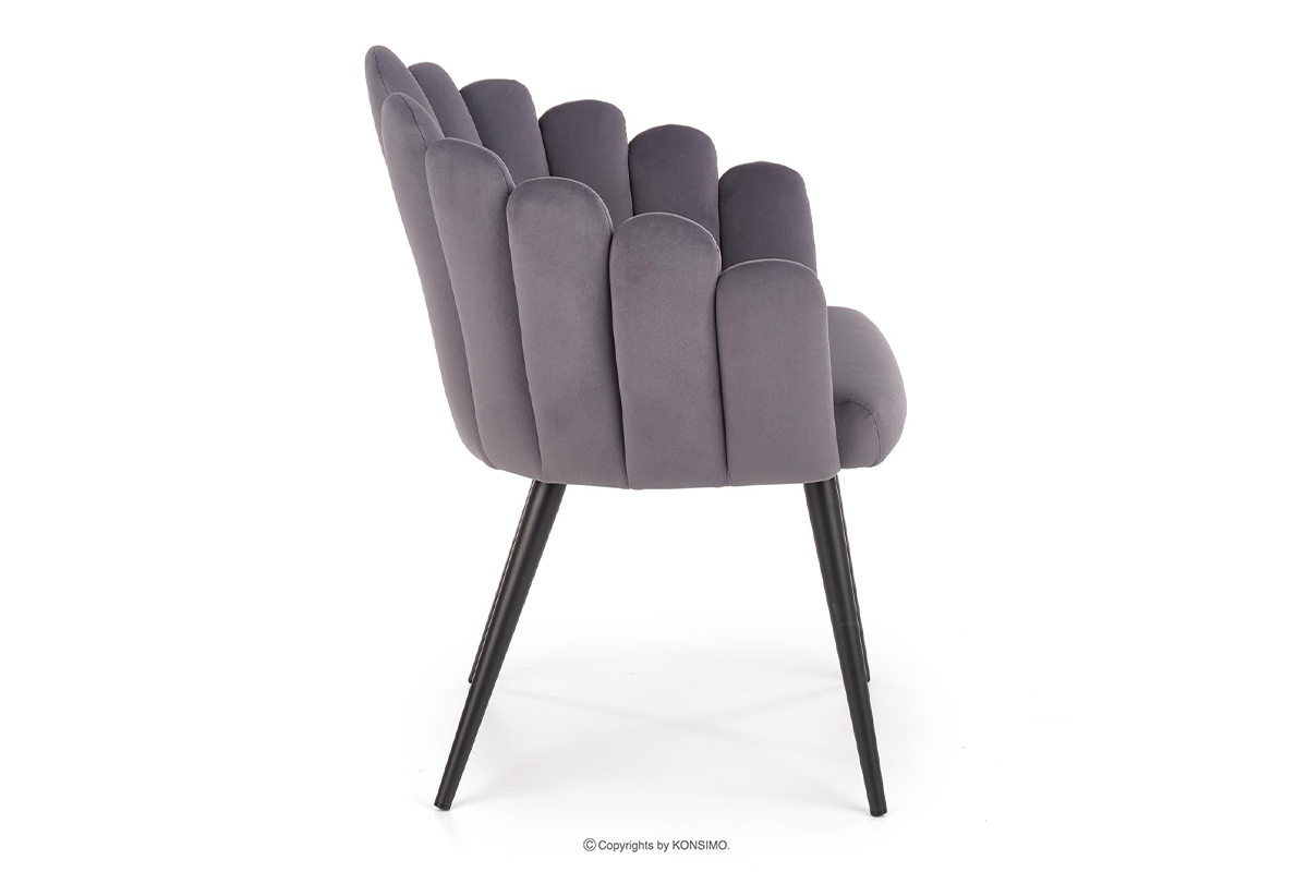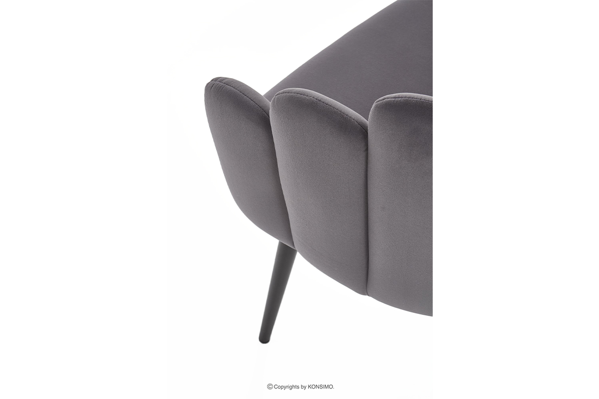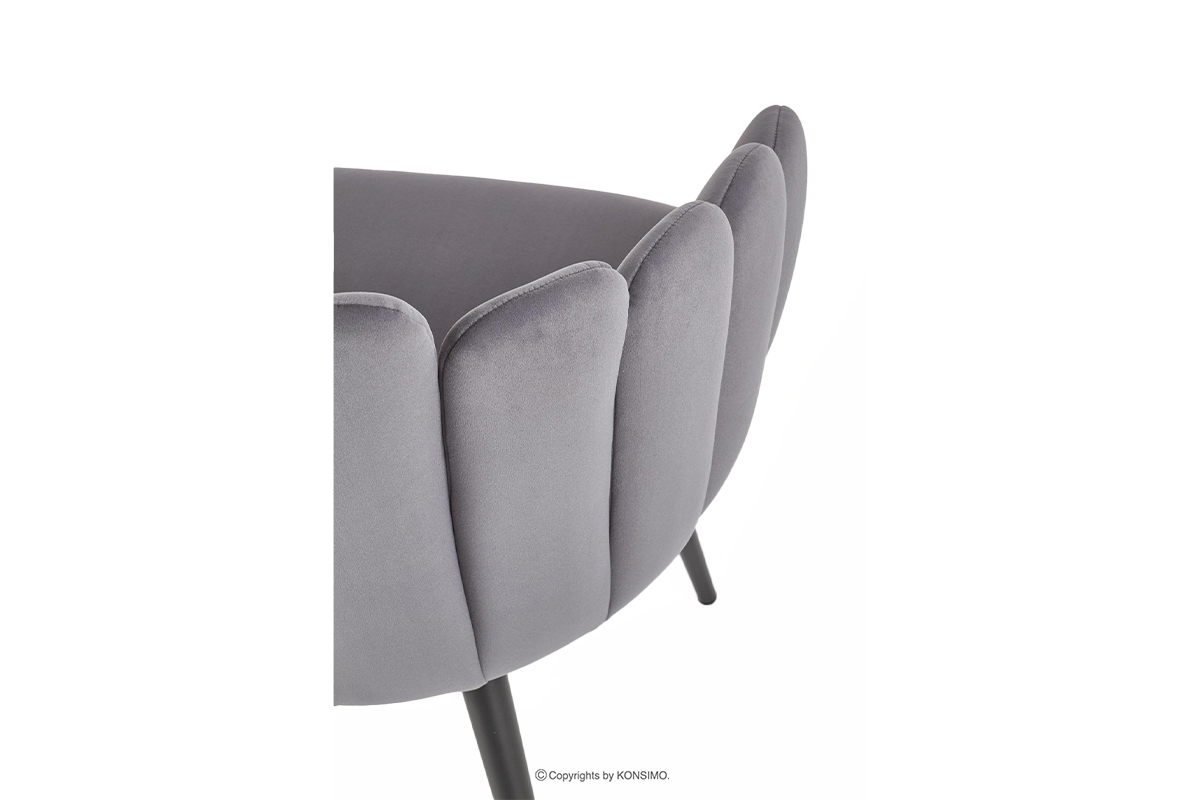 Jedinečná čalúnená stolička s originálnym tvarom pripomínajúcim mušľu, ktorá okamžite upúta pozornosť. Moderná konštrukcia založená na štíhlom kovovom ráme s práškovou povrchovou úpravou zaručuje stabilitu a zároveň ľahký, dizajnový vzhľad. Velúrové čalúnenie je mimoriadne príjemné na dotyk a ľahko sa čistí Starostlivé prešívanie nielen zdôrazňuje jedinečný tvar sedadla, ale zároveň dodáva nábytku exkluzívny charakter.