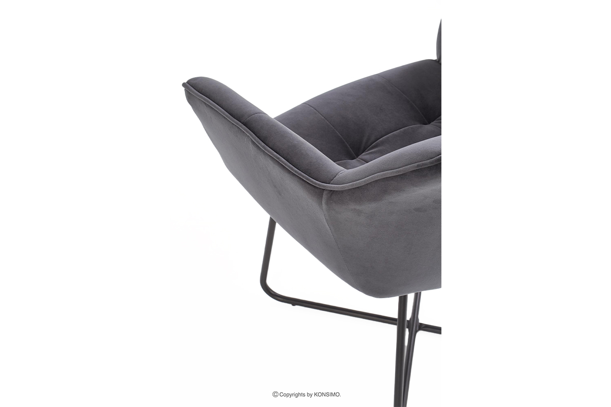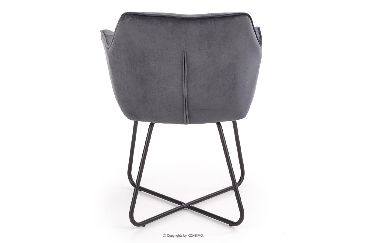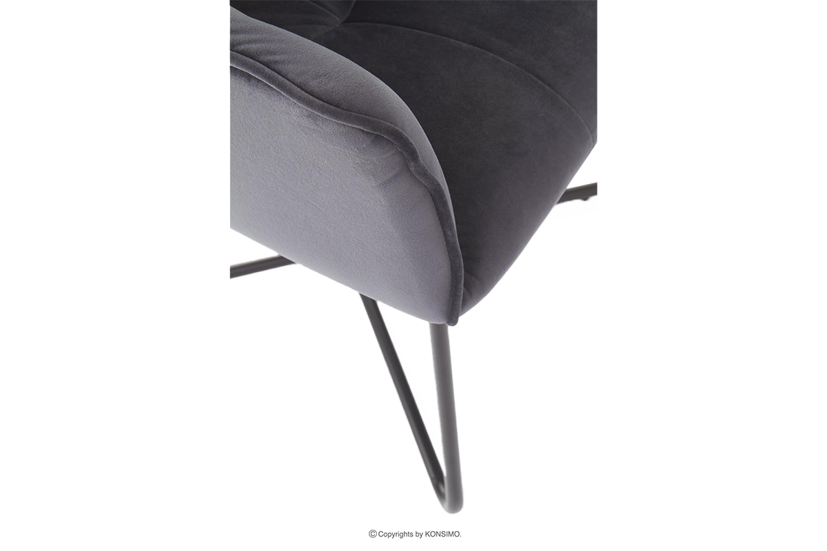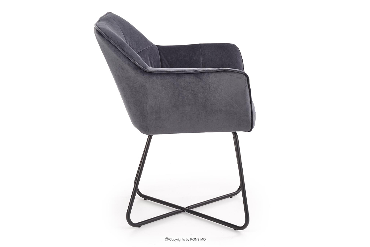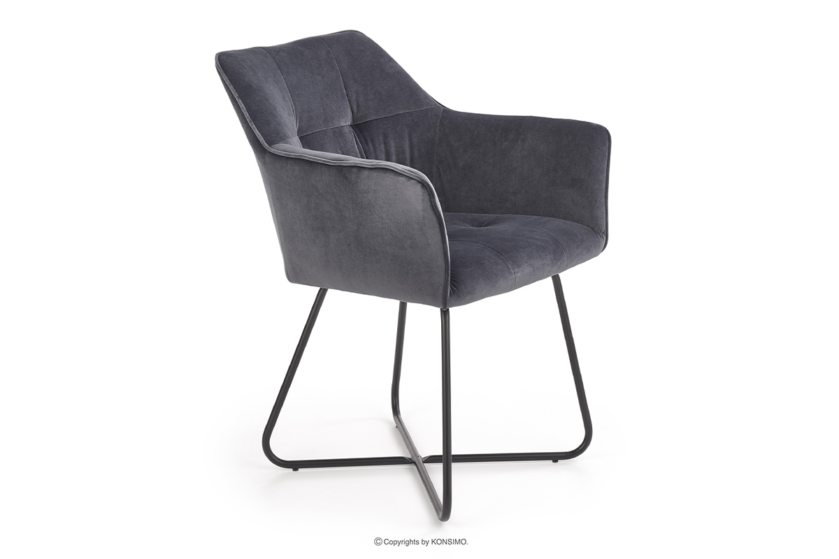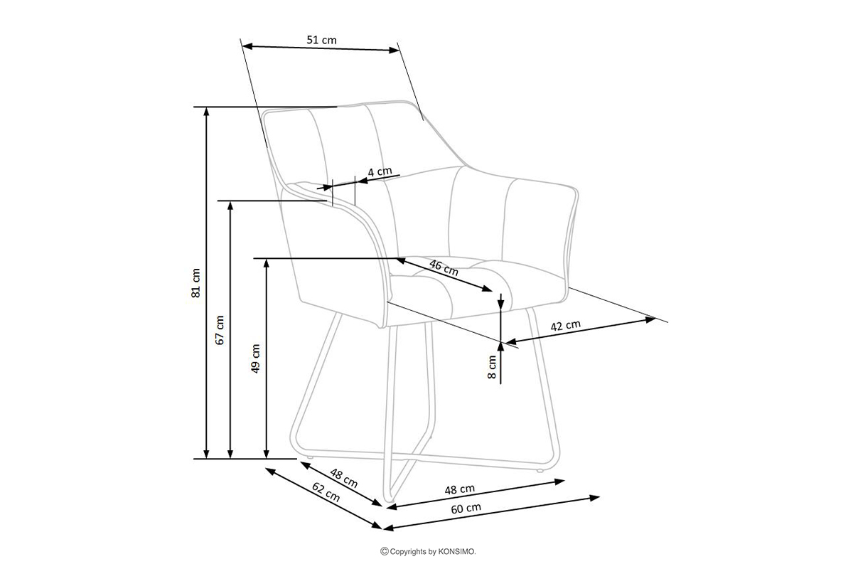 Výnimočná stolička s moderným tvarom, ideálna do elegantnej jedálne. Vybavená pohodlnými podrúčkami, ktoré zvyšujú komfort sedenia počas dlhých stretnutí pri stole. Oceľová konštrukcia s práškovou povrchovou úpravou zaručuje stabilitu a odolnosť a zároveň dodáva nábytku ľahký, moderný vzhľad. Velúrové čalúnenie je príjemné na dotyk a ľahko sa čistí. Nápadné prešívanie dodáva stoličke exkluzívny charakter a demonštruje pozornosť venovanú detailom.