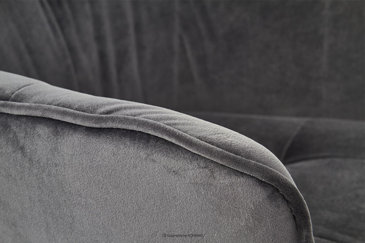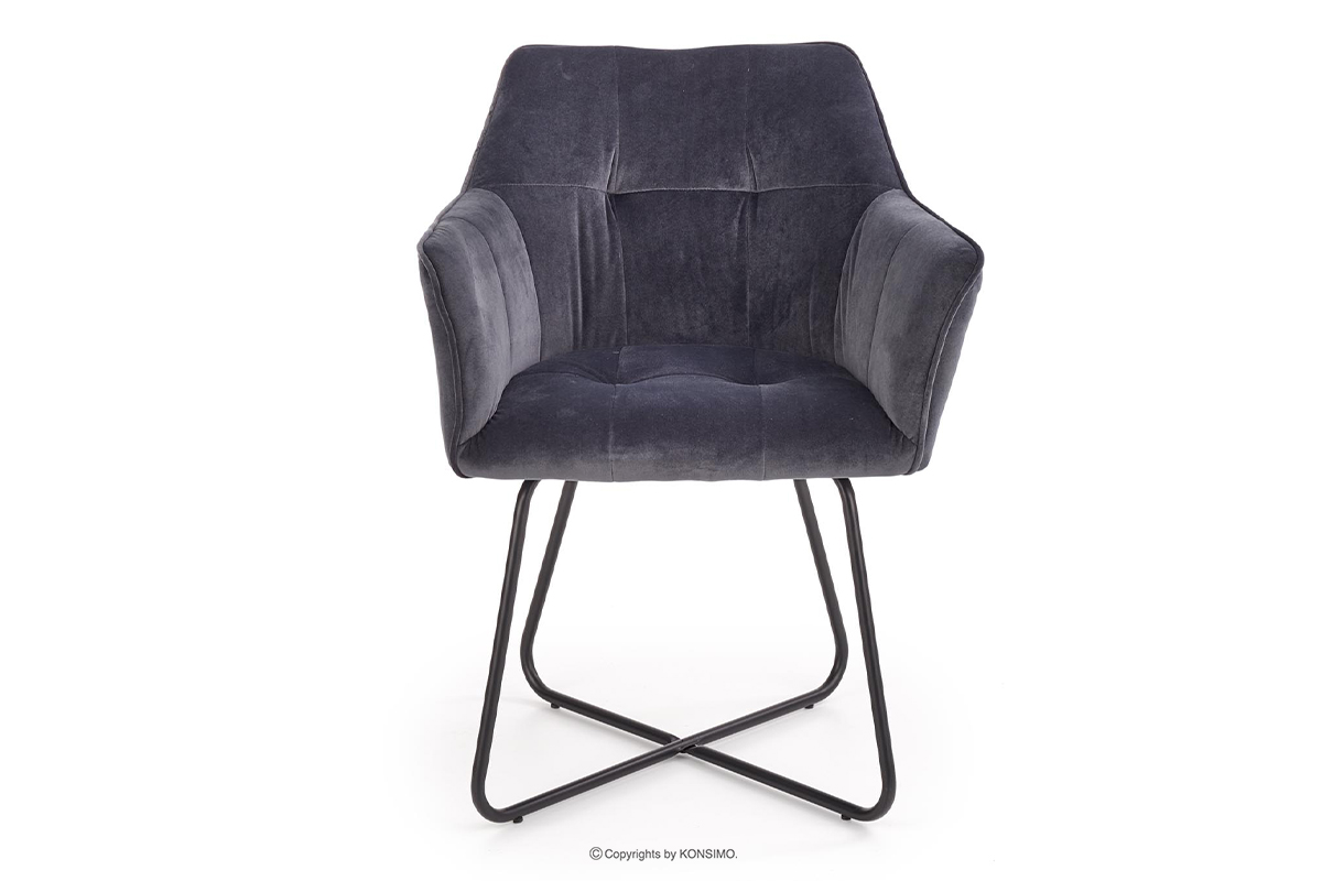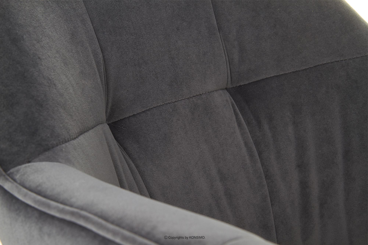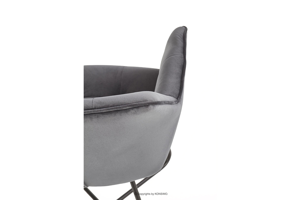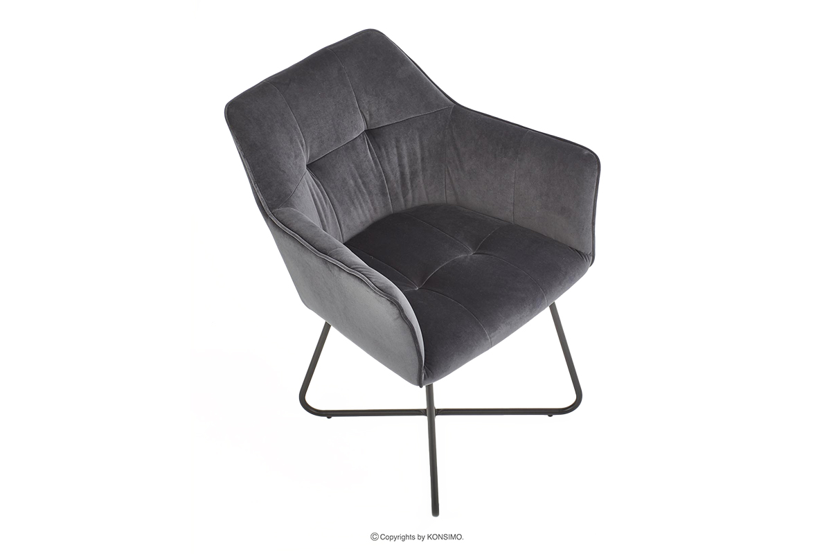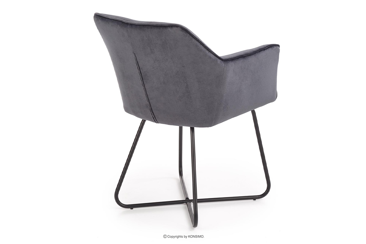 Výnimočná stolička s moderným tvarom, ideálna do elegantnej jedálne. Vybavená pohodlnými podrúčkami, ktoré zvyšujú komfort sedenia počas dlhých stretnutí pri stole. Oceľová konštrukcia s práškovou povrchovou úpravou zaručuje stabilitu a odolnosť a zároveň dodáva nábytku ľahký, moderný vzhľad. Velúrové čalúnenie je príjemné na dotyk a ľahko sa čistí. Nápadné prešívanie dodáva stoličke exkluzívny charakter a demonštruje pozornosť venovanú detailom.