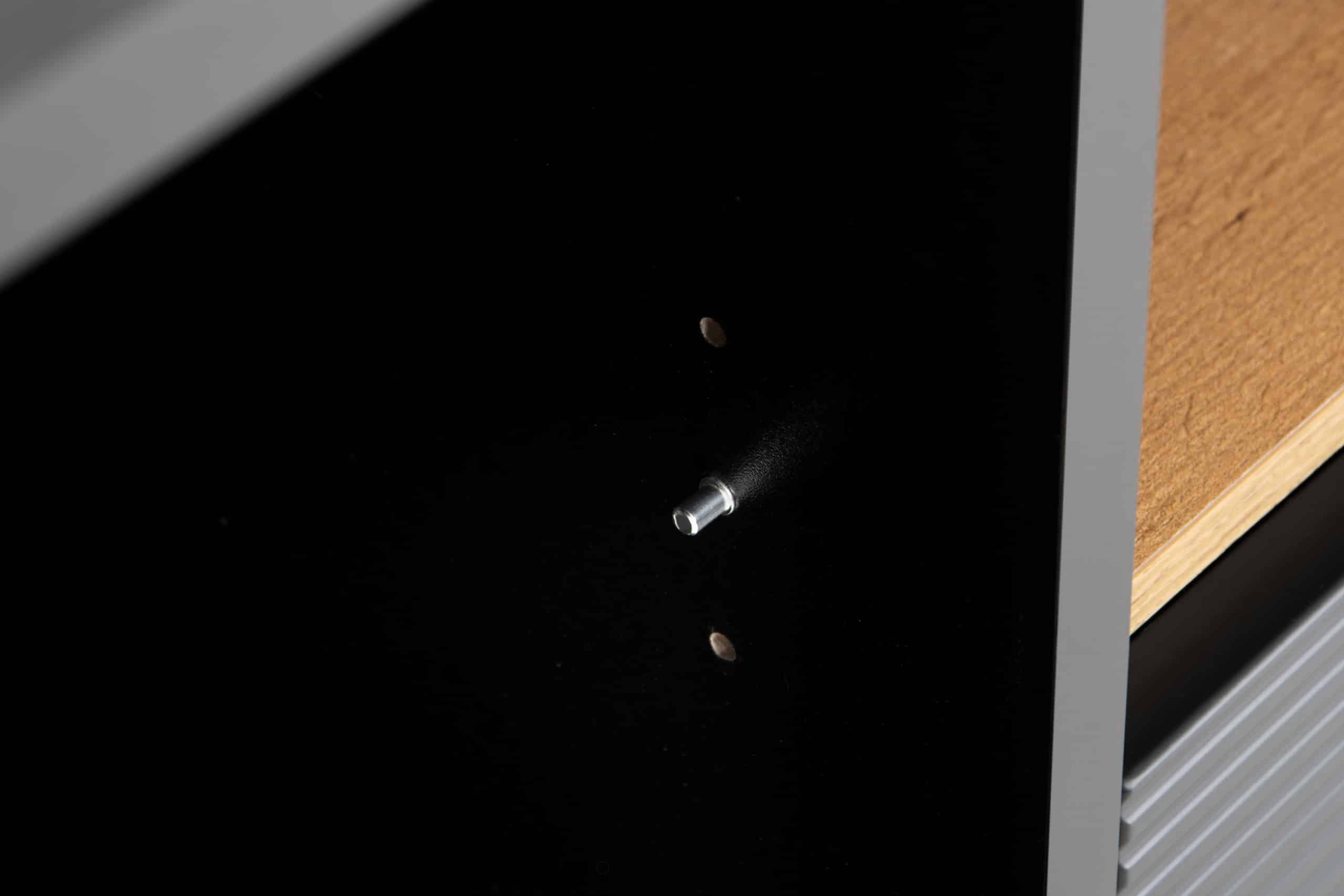 Tělo a horní deska jsou vyrobeny z 18 mm silné laminované desky, která je vysoce odolná proti poškrábání a snadno se čistí. Přední prvky jsou naopak vyrobeny z MDF a PVC, které jsou drážkované. Zadní stěna byla speciálně vyztužena, aby byla zajištěna stabilita. Okraje jsou vyrobeny z 1mm materiálu ABS, který má vysokou odolnost proti mechanickému poškození a odolnost proti slunečnímu záření. Skříň RTV stojí na vysokých lakovaných nohách z masivního dřeva, které odkazují na loftový styl. Zásuvky mají kuličkové výsuvy, které zajišťují plynulé vysouvání a zavírání zásuvek. Dveře jsou naopak vybaveny plechovými závěsy, které lze nastavit ve třech rovinách.