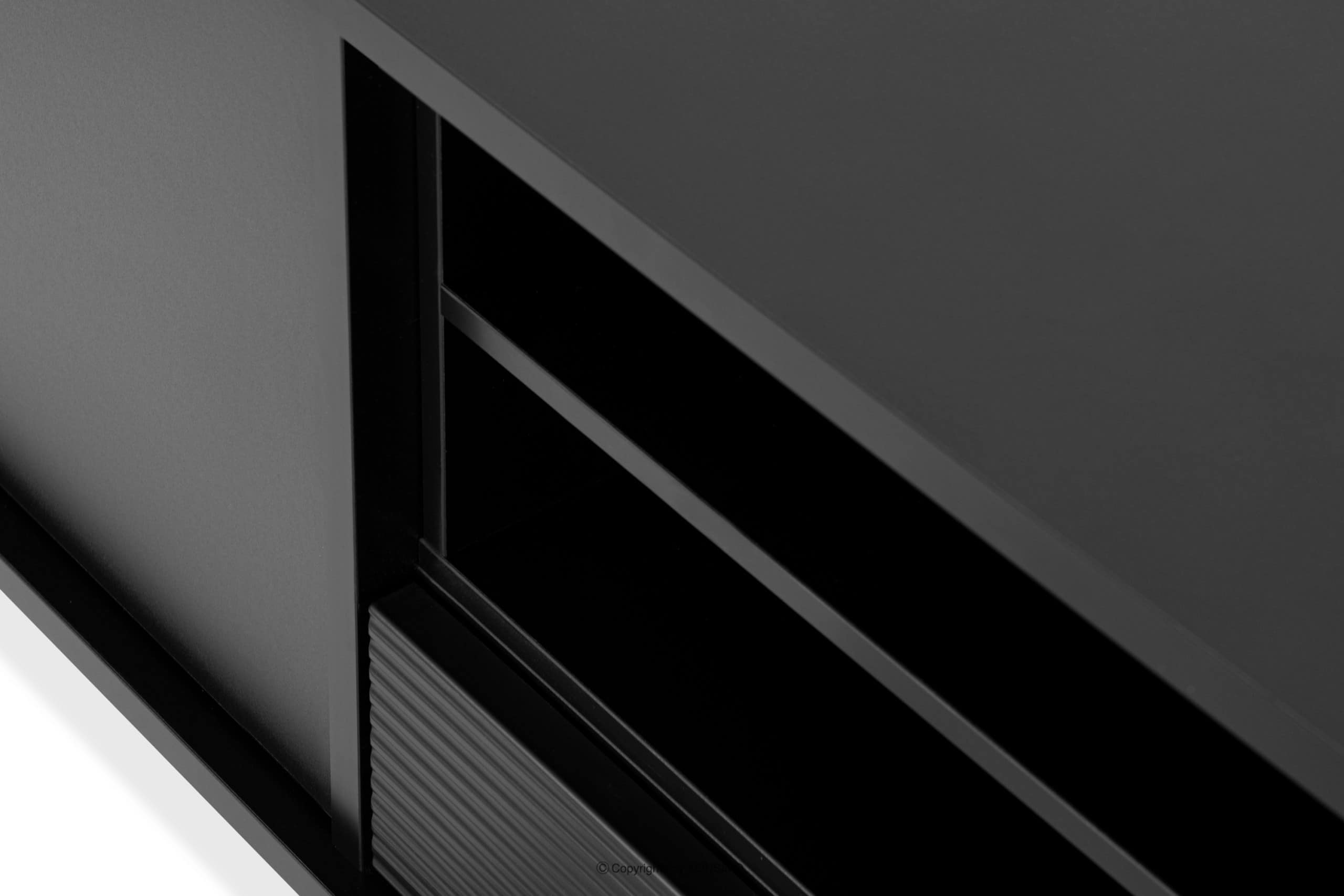 Telo a vrchná doska sú vyrobené z 18 mm hrubej laminovanej dosky, ktorá je vysoko odolná proti poškriabaniu a ľahko sa čistí. Predné prvky sú naopak vyrobené z MDF a PVC, ktoré sú vlnité. Zadná stena bola špeciálne vystužená, aby sa zabezpečila stabilita. Hrany sú vyrobené z 1 mm materiálu ABS, ktorý má vysokú odolnosť proti mechanickému poškodeniu a odolnosť voči slnečnému žiareniu. Skriňa RTV stojí na vysokých lakovaných nohách z masívneho dreva, ktoré odkazujú na štýl loftu. Zásuvky majú guličkové výsuvy, ktoré zabezpečujú plynulé vysúvanie a zatváranie zásuviek. Dvierka majú zasa kovové pánty, ktoré sa dajú nastaviť v troch rovinách.