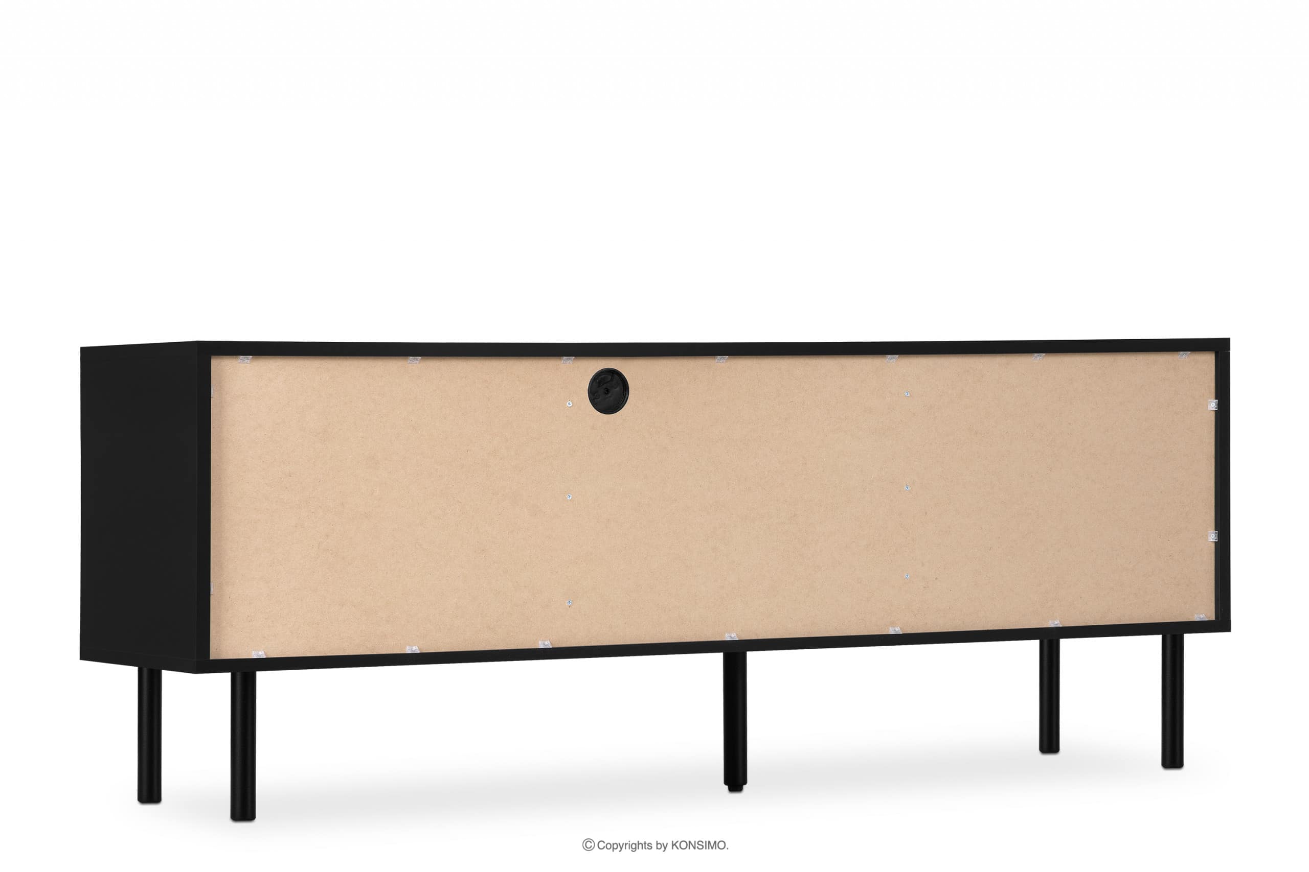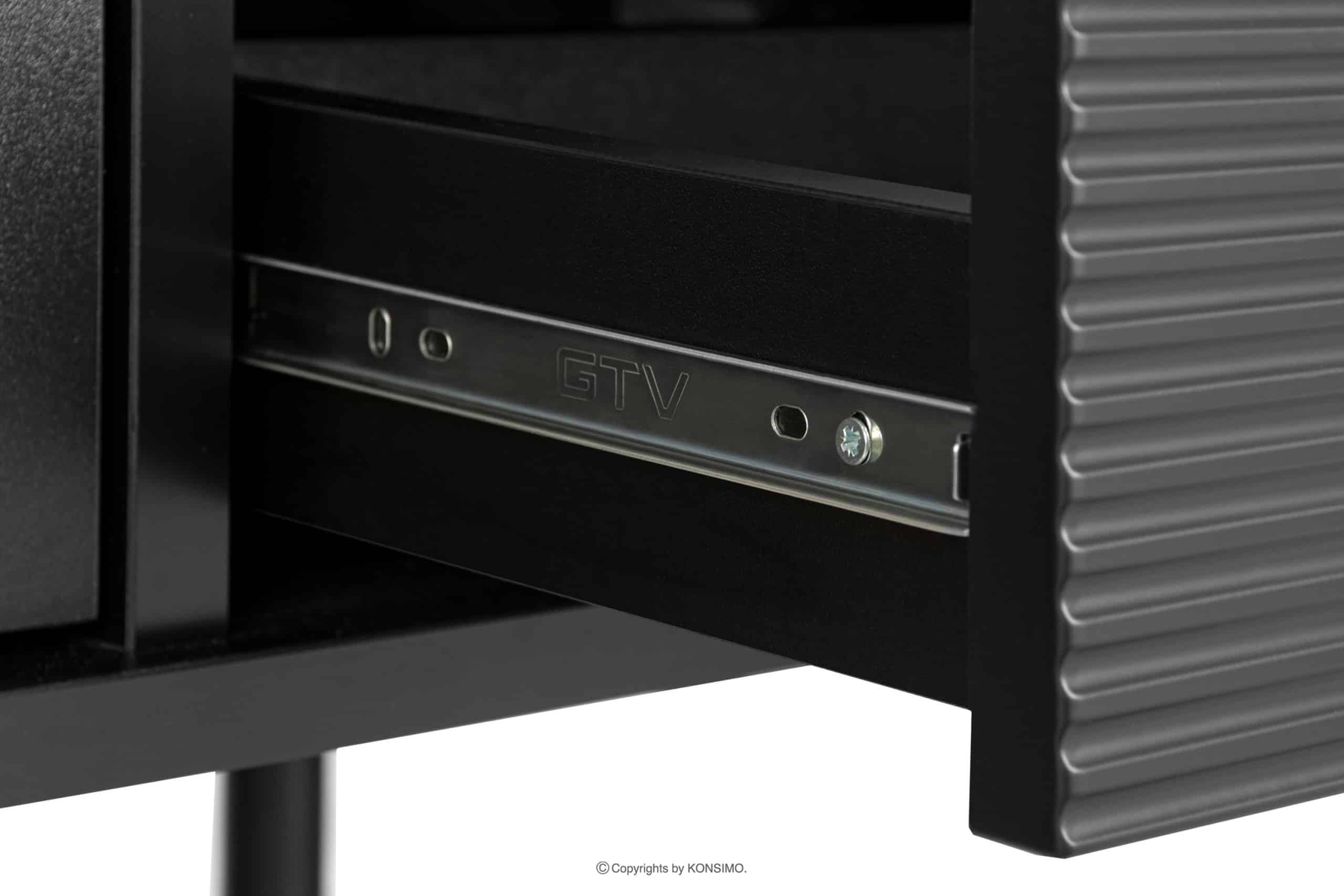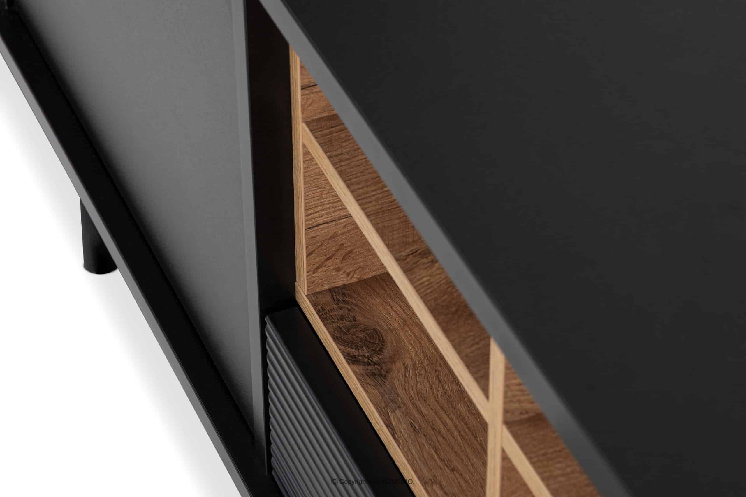 Telo a vrchná doska sú vyrobené z 18 mm hrubého laminátu, ktorý je vysoko odolný proti poškriabaniu a ľahko sa čistí. Drážkovaný predný prvok je naopak vyrobený z MDF a PVC. Zadná stena je špeciálne vystužená, aby sa zabezpečila stabilita. Hrana je vyrobená z 1 mm hrubého ABS plastu, ktorý je vysoko odolný voči mechanickému poškodeniu a slnečnému žiareniu. Skrinka RTV stojí na vysokých lakovaných nohách z masívneho dreva, ktoré odkazujú na loftový štýl. Zásuvky majú výsuvy s guličkovými ložiskami na plynulé vysúvanie a zatváranie. Dvierka majú zasa kovové pánty, ktoré sa dajú nastaviť v troch rovinách.