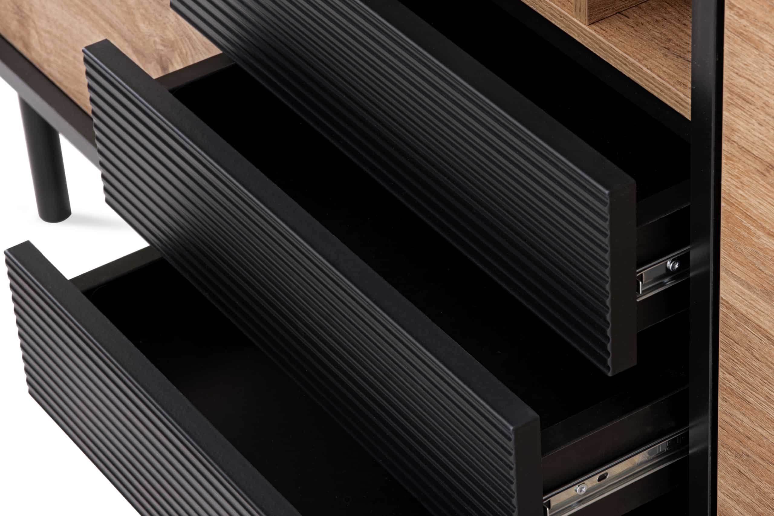Komoda a skrine v štýle loftu boli vytvorené pre používateľov, ktorí dbajú na detaily a vysokú kvalitu. Zmestí sa do nej veľa užitočných vecí, napríklad dokumenty, oblečenie a knihy. Má dve veľké skrine, tri zásuvky a poličku. Systém otvárania dvierok je push open, vďaka čomu si komoda zachováva hladký vzhľad bez zbytočných ozdôb.