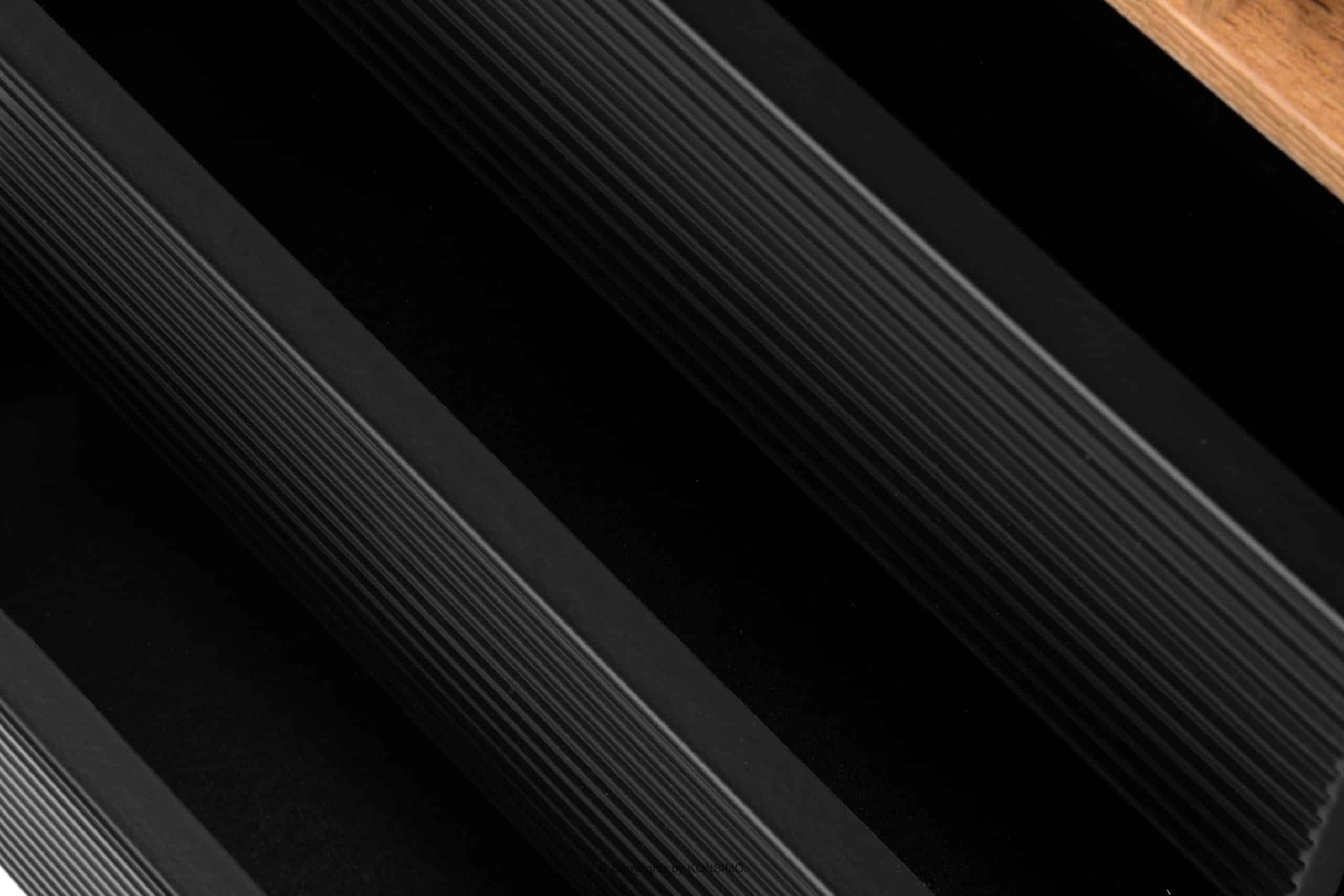 Telo a vrchná doska sú vyrobené z 18 mm hrubého laminátu, ktorý je vysoko odolný proti poškriabaniu a ľahko sa čistí. Drážkované zásuvky komody sú vyrobené z MDF a PVC. Zadná stena je špeciálne vystužená, aby sa zabezpečila stabilita. Hrany sú vyrobené z 1 mm hrubého ABS plastu, ktorý je vysoko odolný voči mechanickému poškodeniu a slnečnému žiareniu. Komoda má vysoké nohy z masívneho dreva, ktoré odkazujú na loftový štýl. Dvierka majú kovové pánty nastaviteľné v troch rovinách a zásuvky majú guľôčkové výsuvy pre plynulé vysúvanie a zatváranie.
