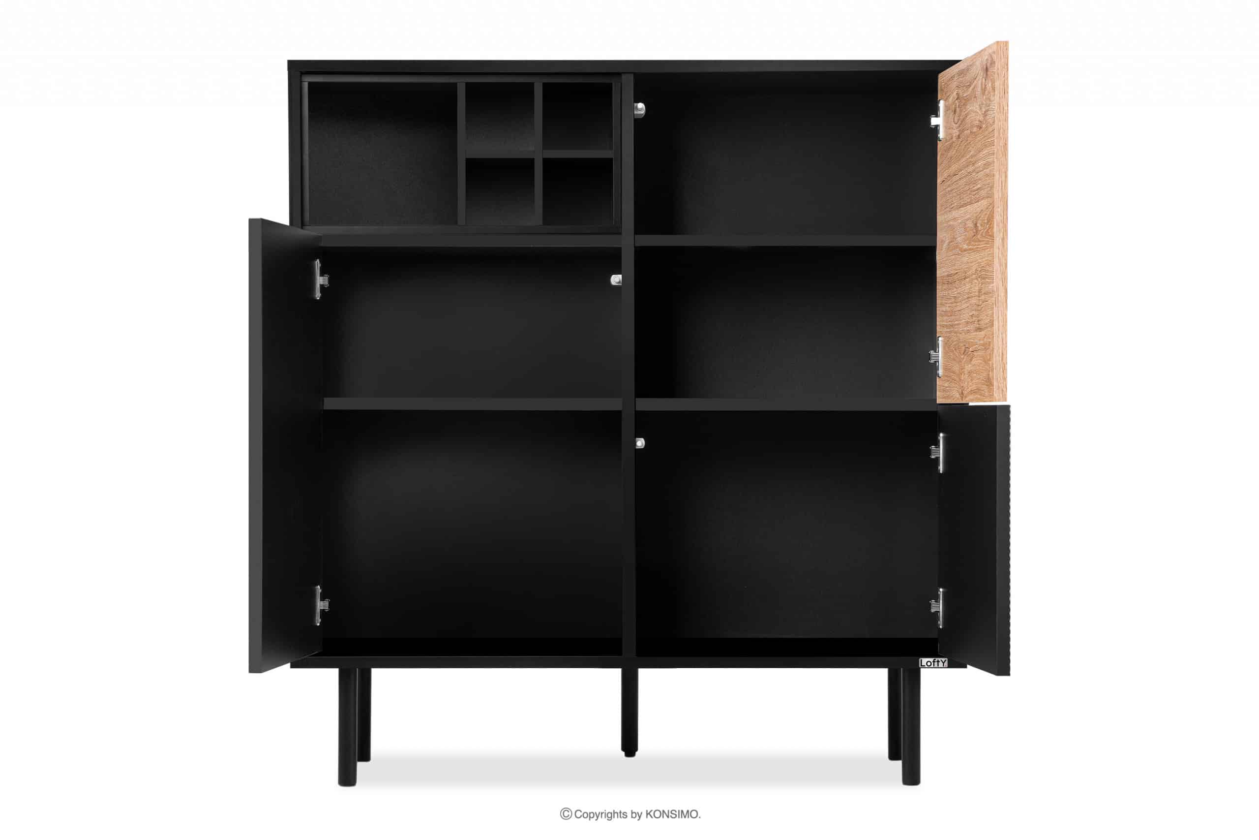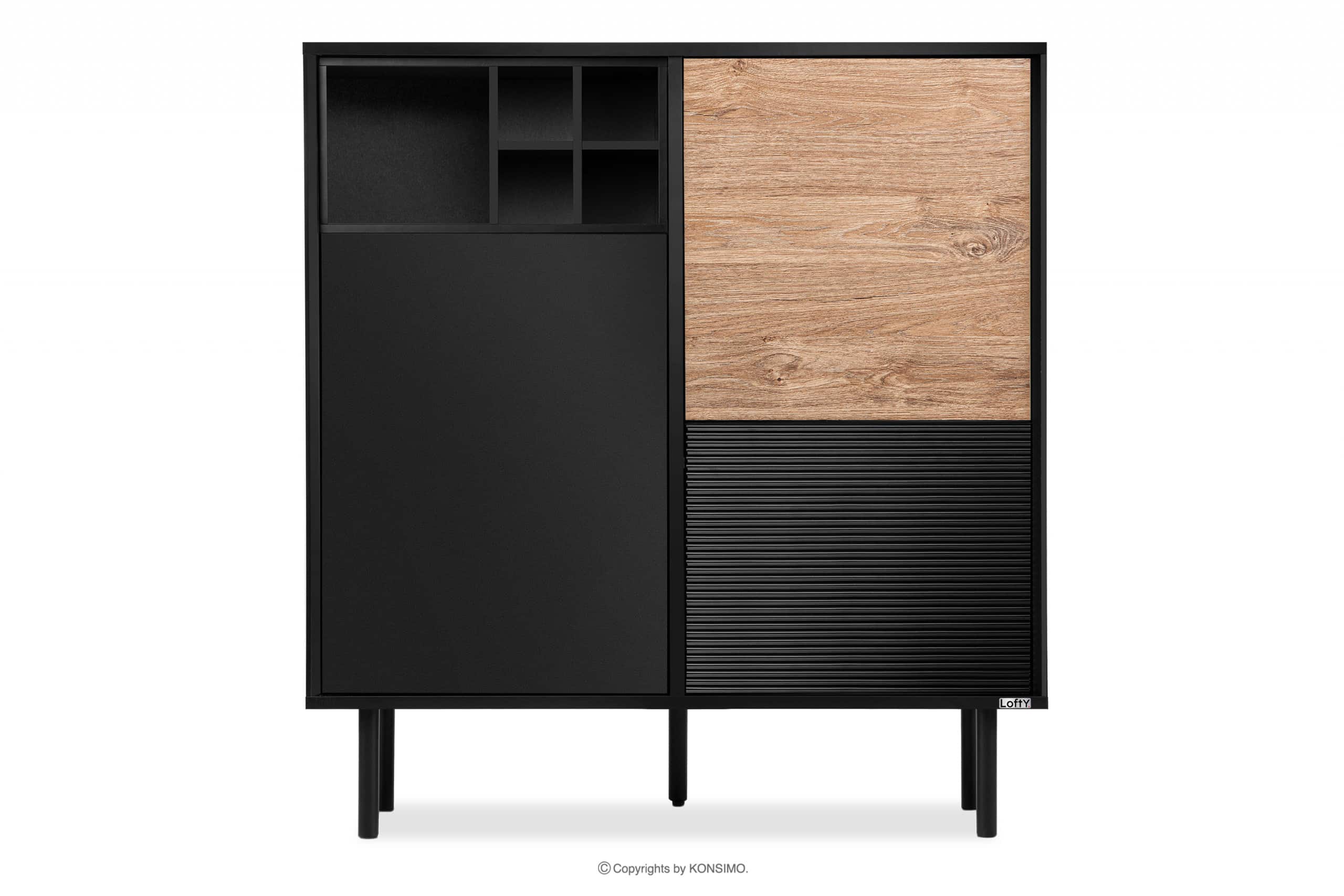 Komoda Loft na čiernych vysokých nohách bola navrhnutá s veľkým dôrazom na detail. Vďaka svojmu dizajnu pojme množstvo každodenných vecí, ako sú oblečenie, dokumenty alebo knihy. Má tri veľké skrinky a police. Vďaka systému otvárania dvierok push-to-open si komoda zachováva elegantný vzhľad bez zbytočných ozdôb, a pritom je vysoko funkčná. Kombinácia čiernej farby s laminátom v prírodnom odtieni dreva dodáva miestnosti teplo a jedinečný charakter.