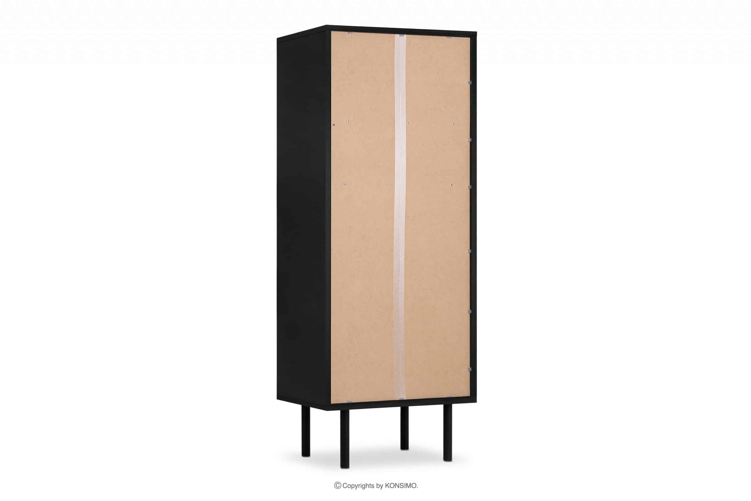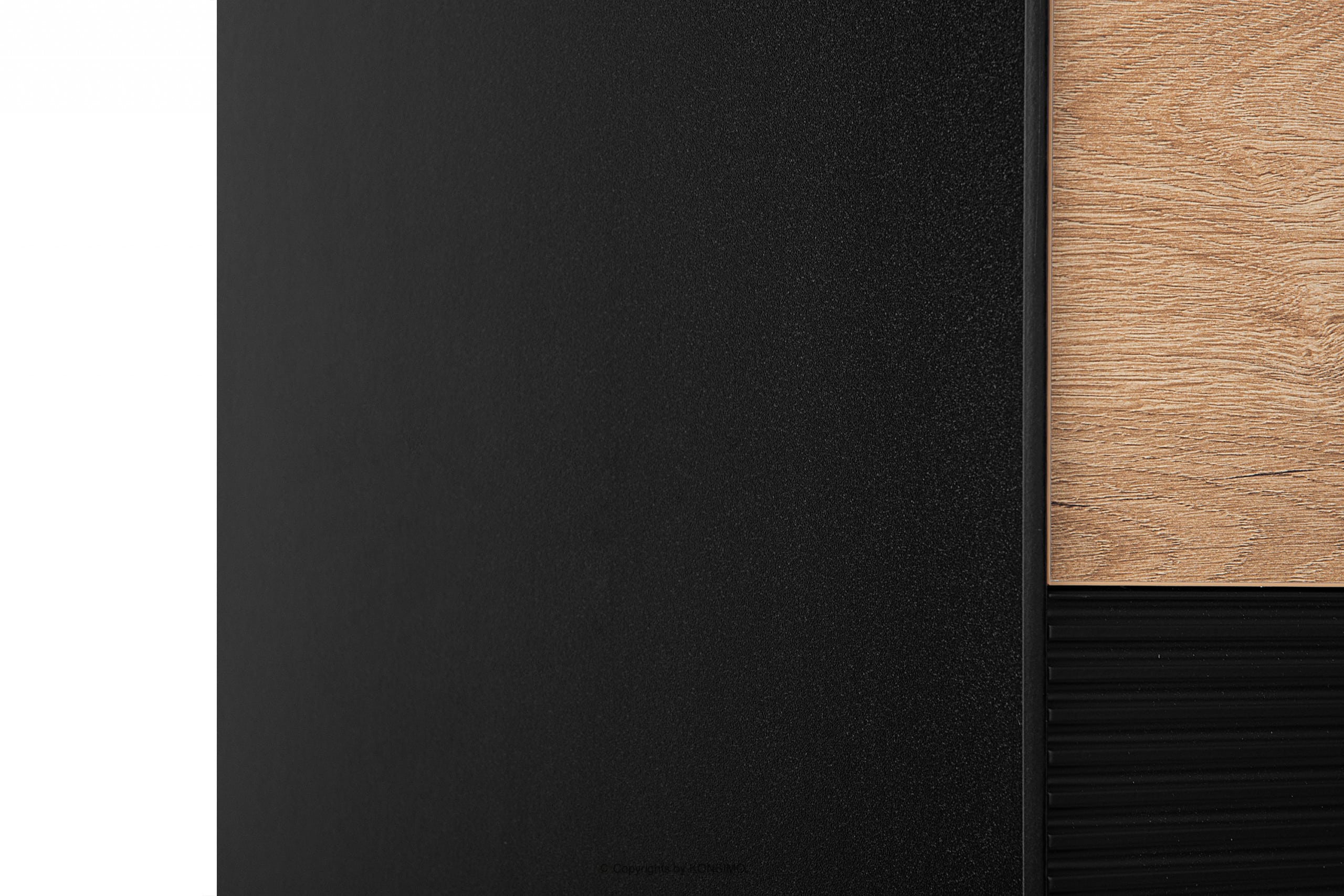 Regál je vyrobený z 18 mm hrubej laminovanej dosky, ktorá je vysoko odolná proti poškriabaniu a ľahko sa udržiava v čistote. Drážkované predné prvky sú vyrobené z MDF a PVC. Zadná stena bola špeciálne vystužená, aby sa zabezpečila stabilita. Hrany z ABS s hrúbkou 1 mm sú vysoko odolné voči mechanickému poškodeniu. Nohy sú vyrobené z dreva a odkazujú na štýl loft. Dvere používajú kovové pánty nastaviteľné v troch rovinách.