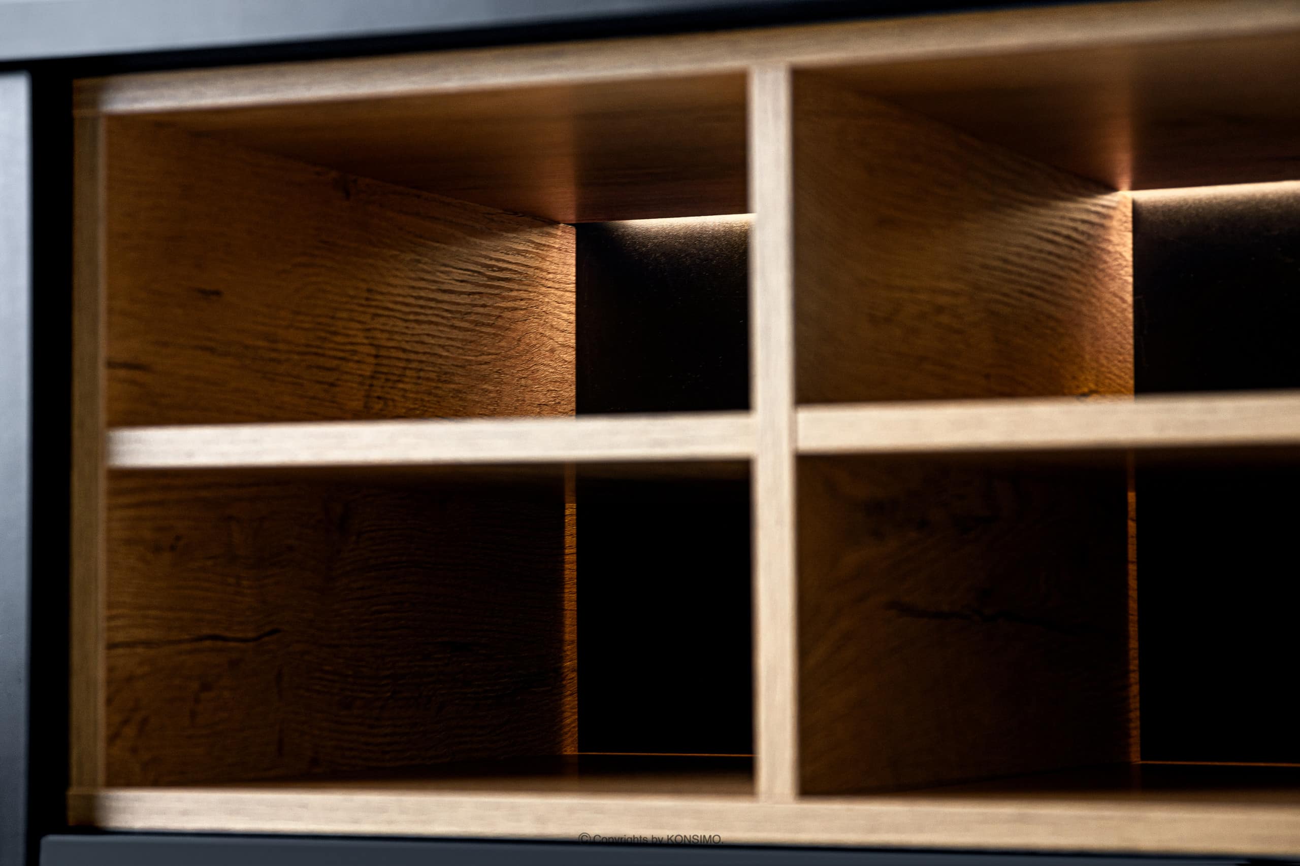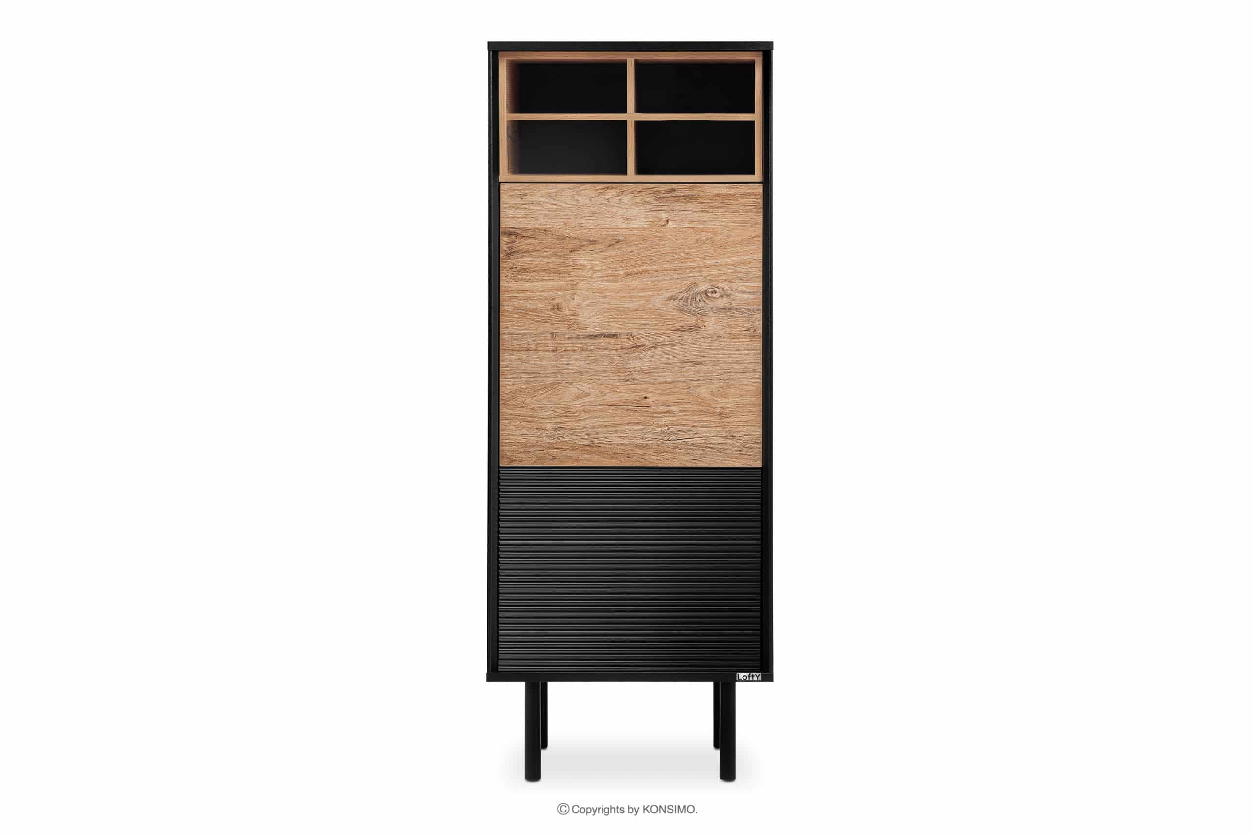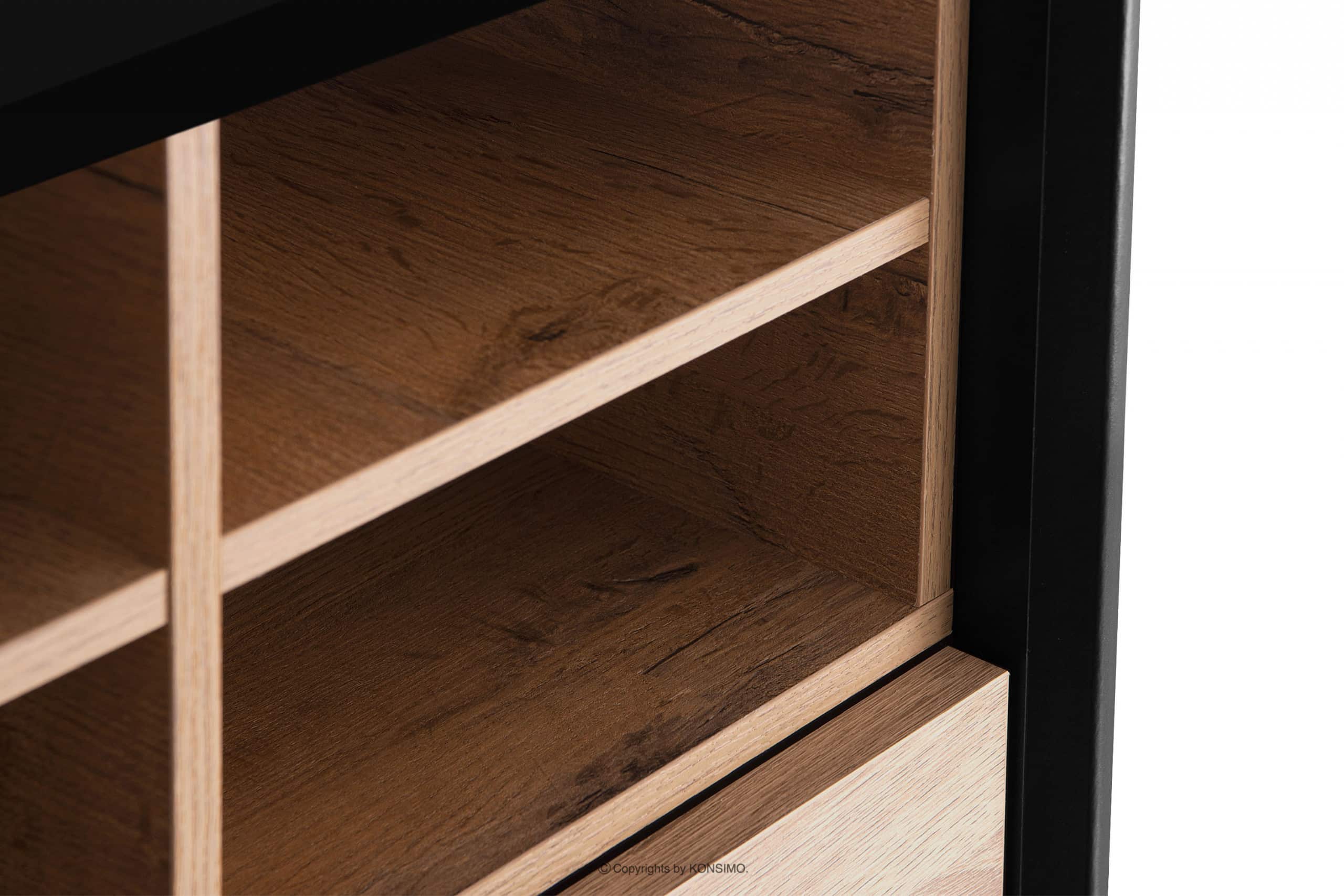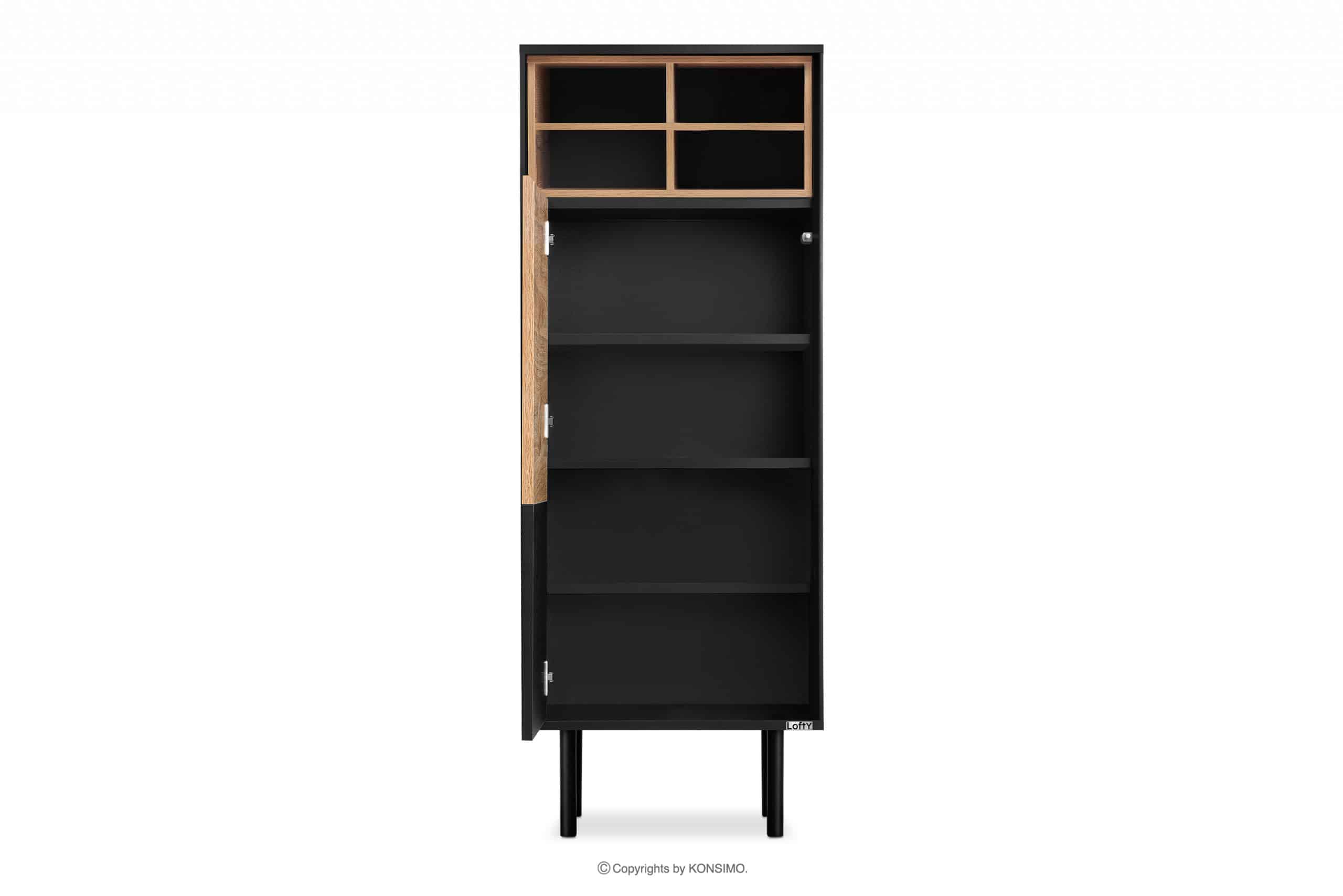 Knižnica na nožičkách v štýle loftu bola vyrobená tak, aby sa zabezpečila vysoká kvalita a odolnosť na dlhé roky. Má veľa políc za dvierkami na odkladanie predmetov dennej potreby. Nábytok je vhodný do moderných interiérov pripomínajúcich loftový štýl a vďaka neutrálnym farbám sa hodí k mnohým farbám stien a podláh. Dvierka majú systém push-to-open, ktorý uľahčuje ich používanie a zabezpečuje hladký vzhľad nábytku.