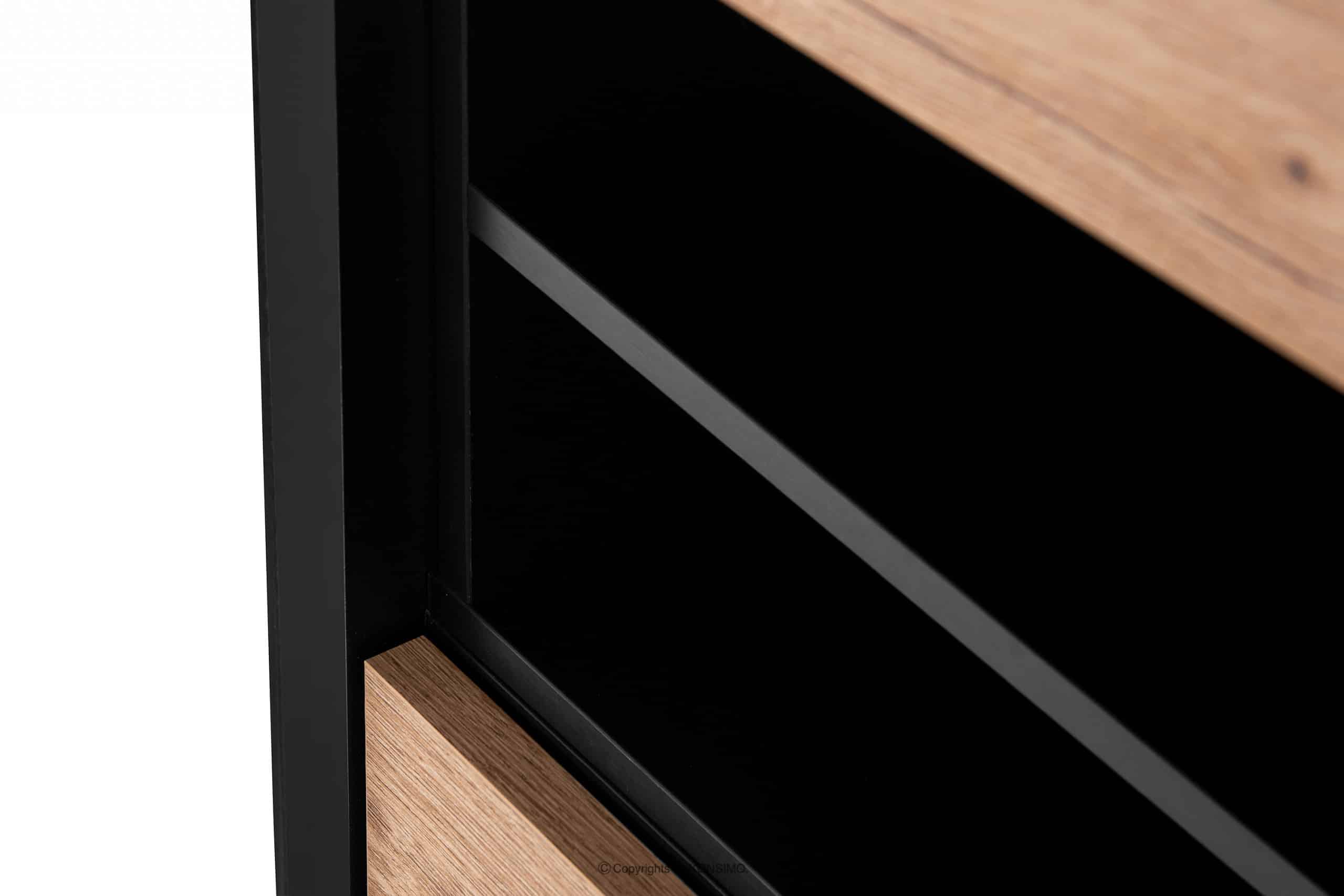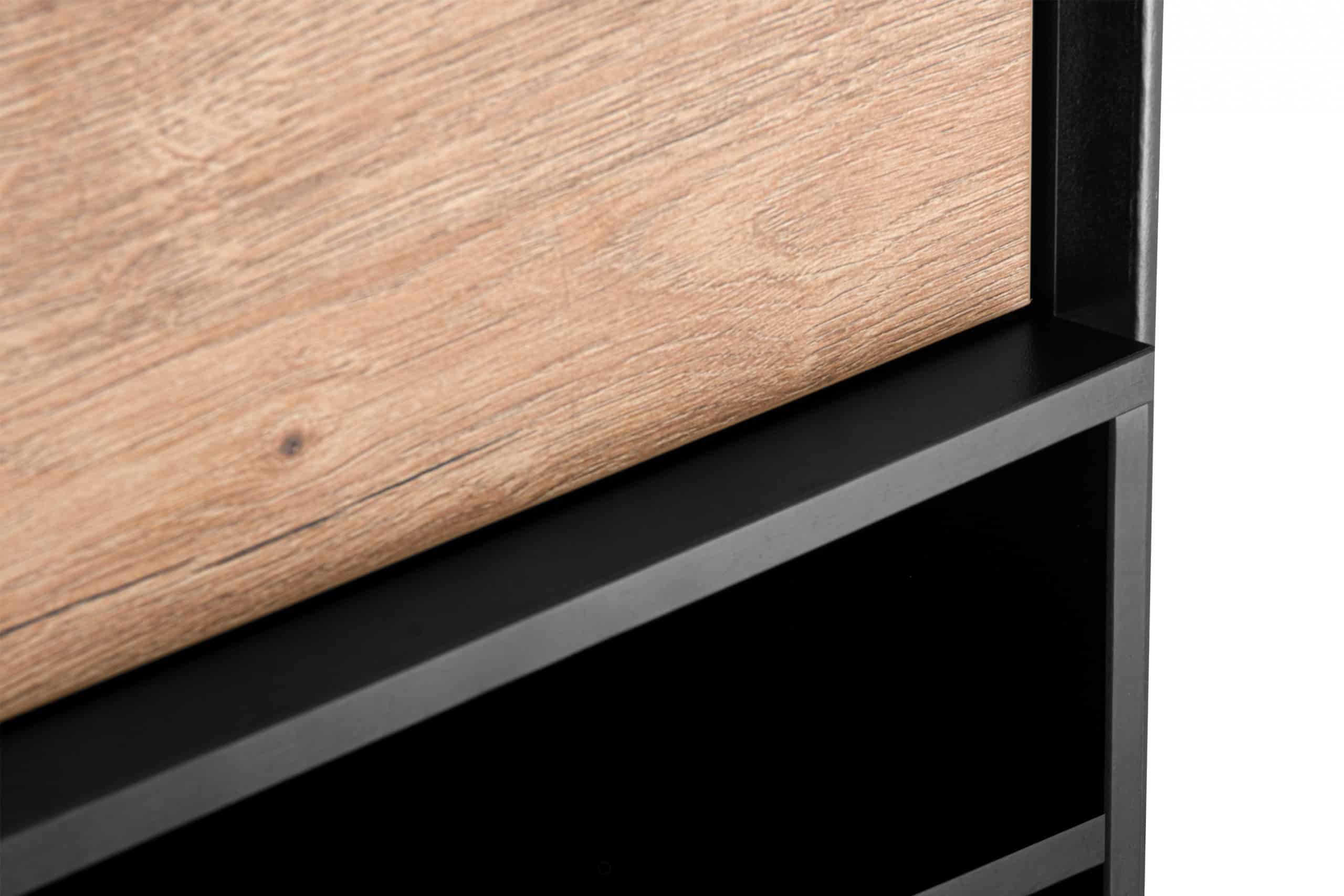 Regál je vyrobený z 18 mm hrubého laminátu, ktorý je vysoko odolný proti poškriabaniu a ľahko sa čistí. Drážkované prvky na prednej strane sú naopak vyrobené z MDF a PVC. Zadná stena je špeciálne vystužená, aby sa zabezpečila stabilita. Hrany sú vyrobené z 1 mm hrubého ABS plastu s vysokou odolnosťou proti mechanickému poškodeniu. Nohy sú vyrobené z dreva a odkazujú na štýl loft. Dvere majú skryté závesy, ktoré sa dajú nastaviť v troch rovinách.