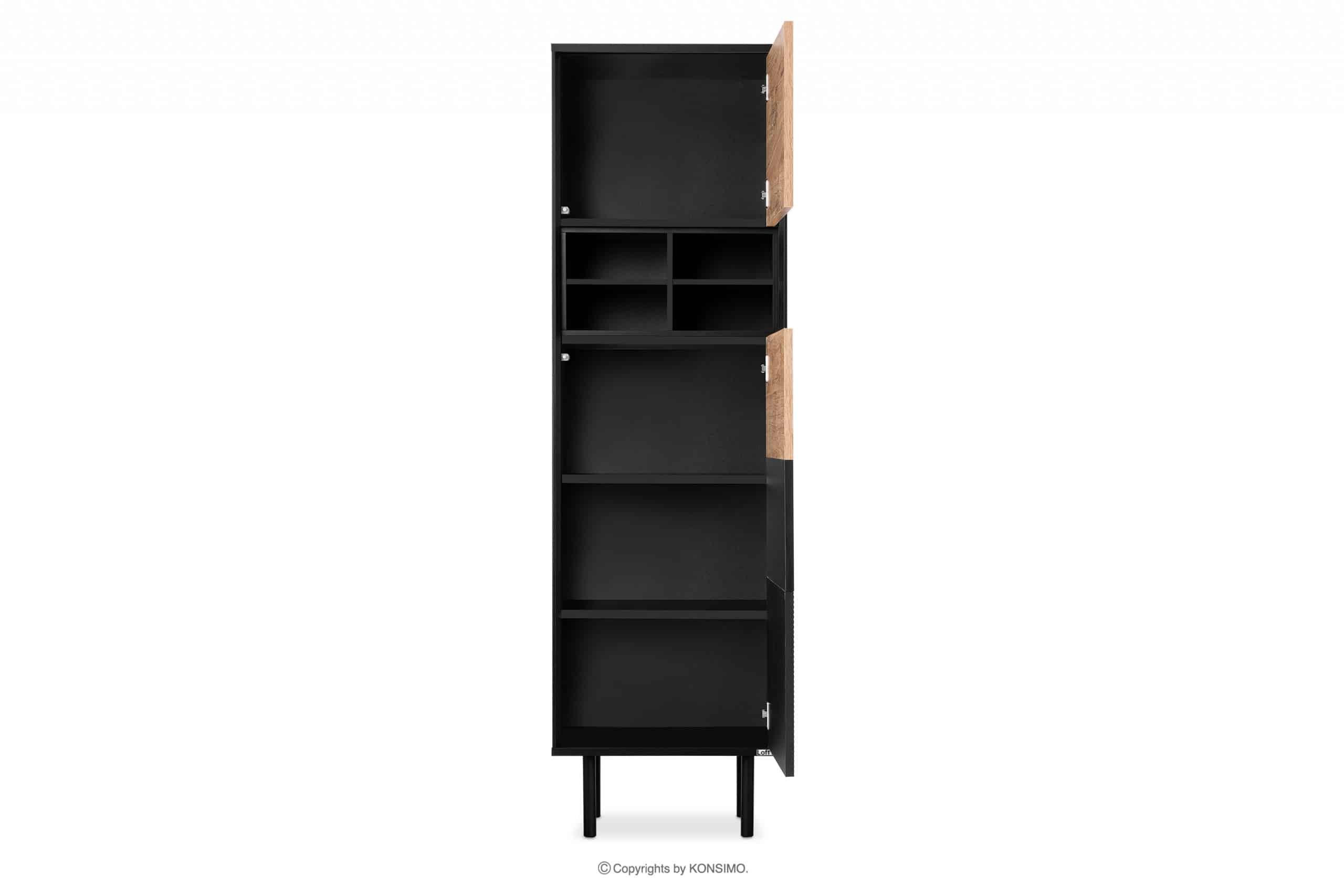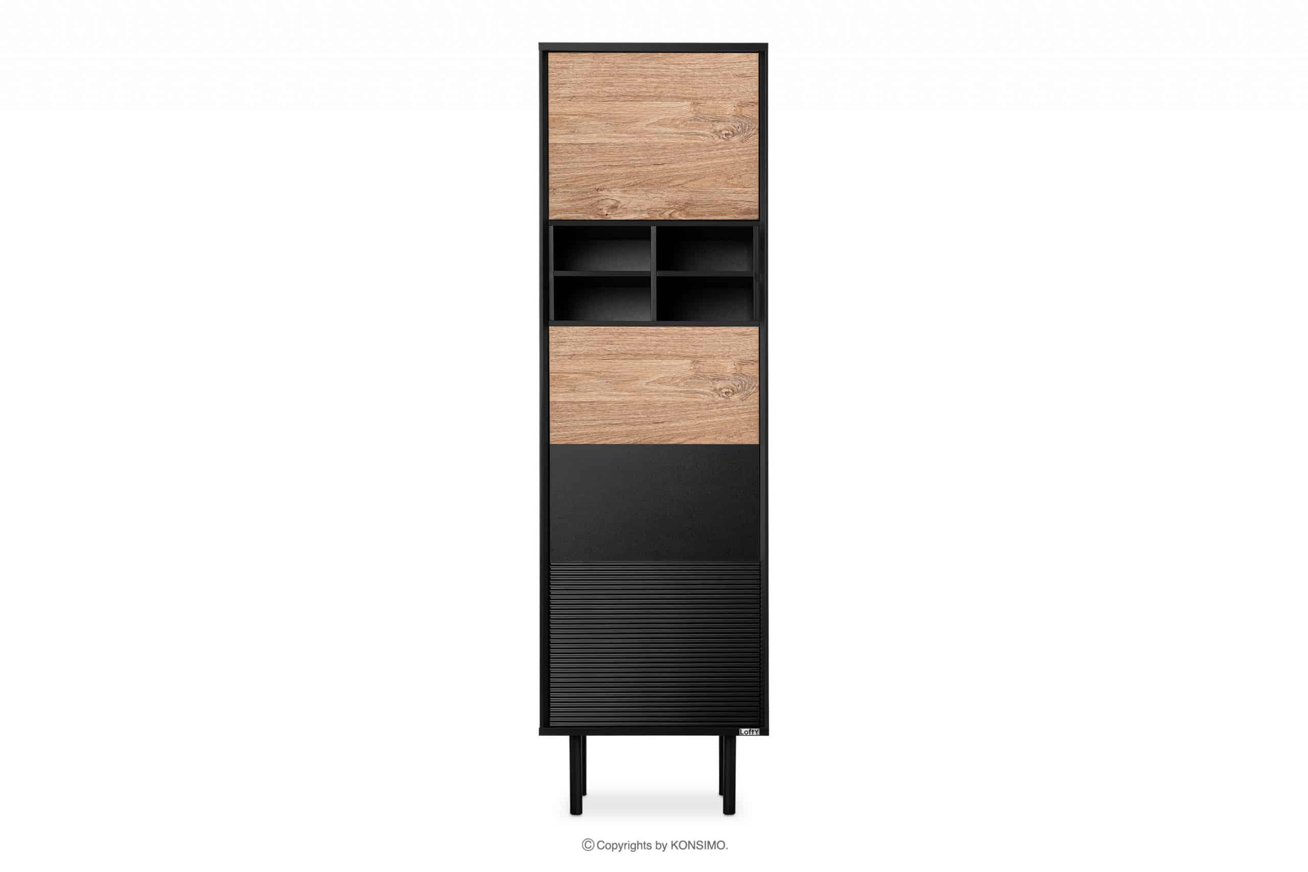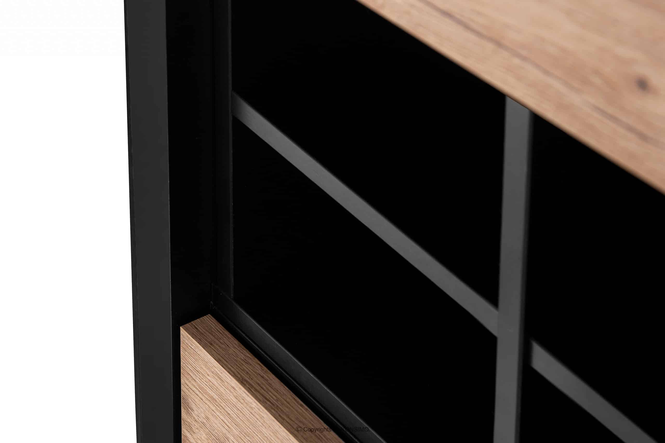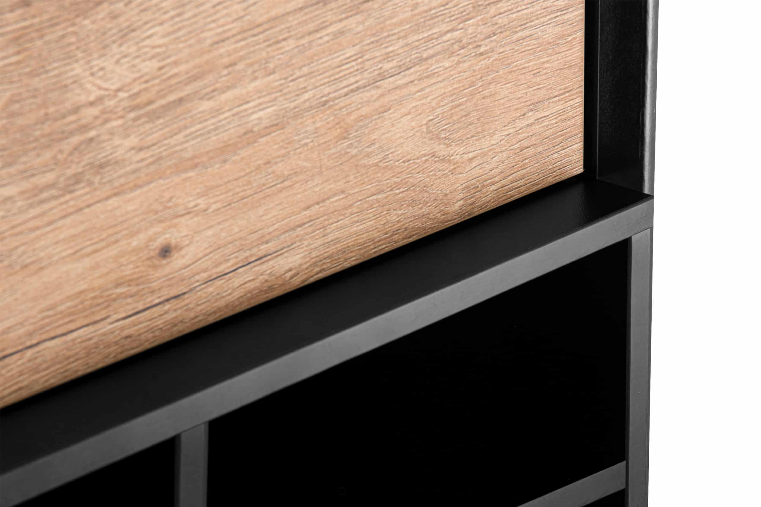 Priemyselná knižnica Loft je produkt, pri ktorom sme si dali záležať, aby bol čo najodolnejší. Má niekoľko políc na odkladanie predmetov dennej potreby. Nábytok je vhodný do industriálnych interiérov a čierne a prírodné dubové morenie sa hodí do mnohých farebných schém interiéru. Dvierka sú vybavené systémom push-to-open, ktorý je veľmi funkčný a zároveň knihovňu zbavuje zbytočných dekorácií.