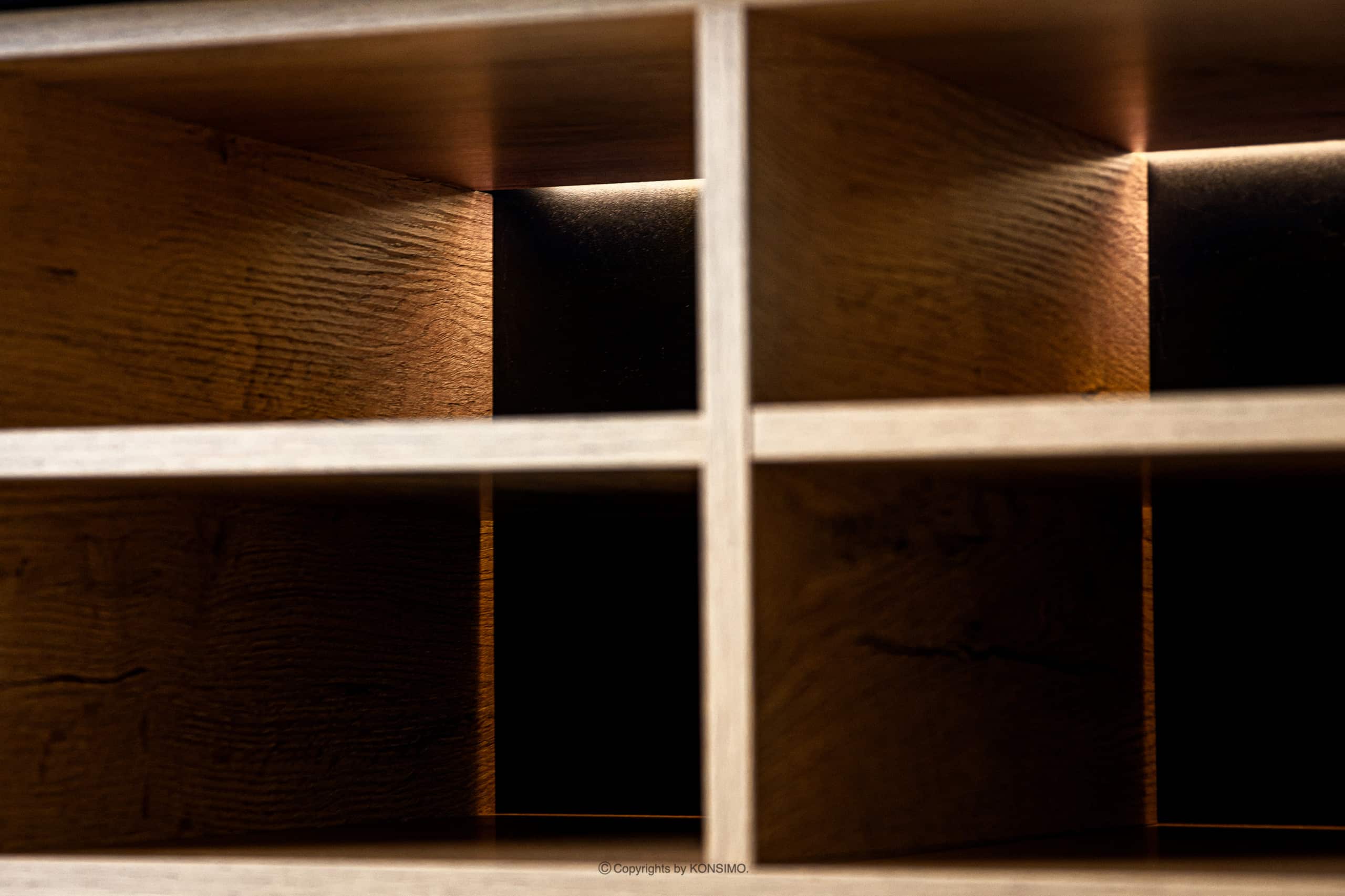 Regál je vyrobený z 18 mm hrubého laminátu, ktorý je odolný proti poškriabaniu a ľahko sa čistí (stačí utrieť handričkou). Na druhej strane sú predné drážkované prvky vyrobené z MDF a PVC. Hrany z ABS s hrúbkou 1 mm sú vysoko odolné voči mechanickému poškodeniu. Nohy regálu sú vyrobené z dreva a evokujú loftový štýl. Dvierka majú kovové pánty, ktoré sa dajú nastaviť v troch rovinách.
