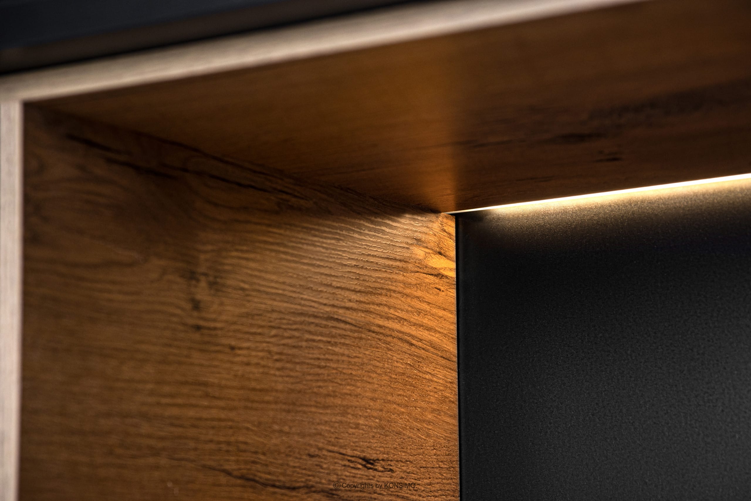 Nábytok je vhodný do industriálnych interiérov vďaka použitým farbám a vysokým dreveným nohám.Voliteľné osvetlenie LED 12607.16.147