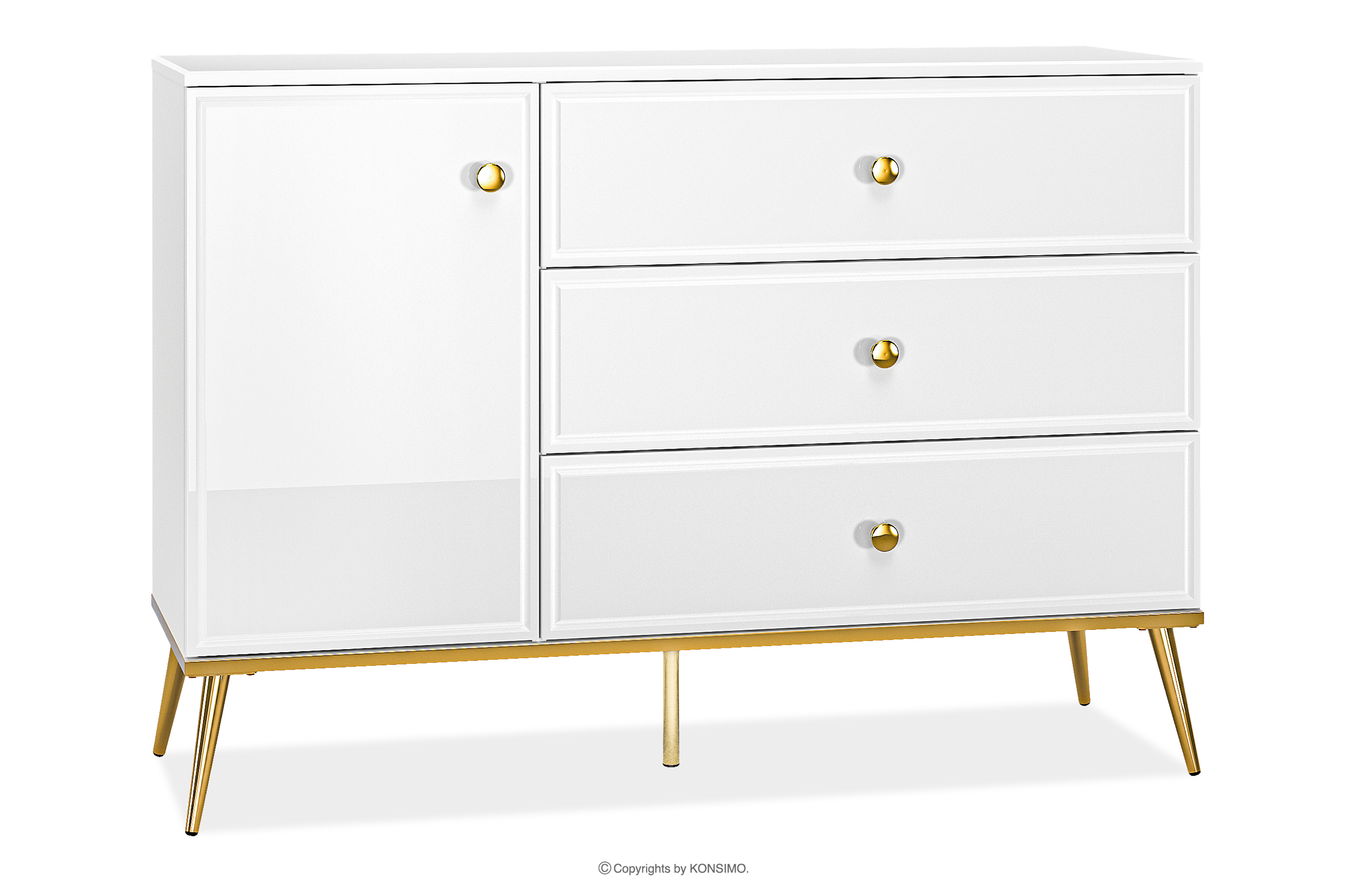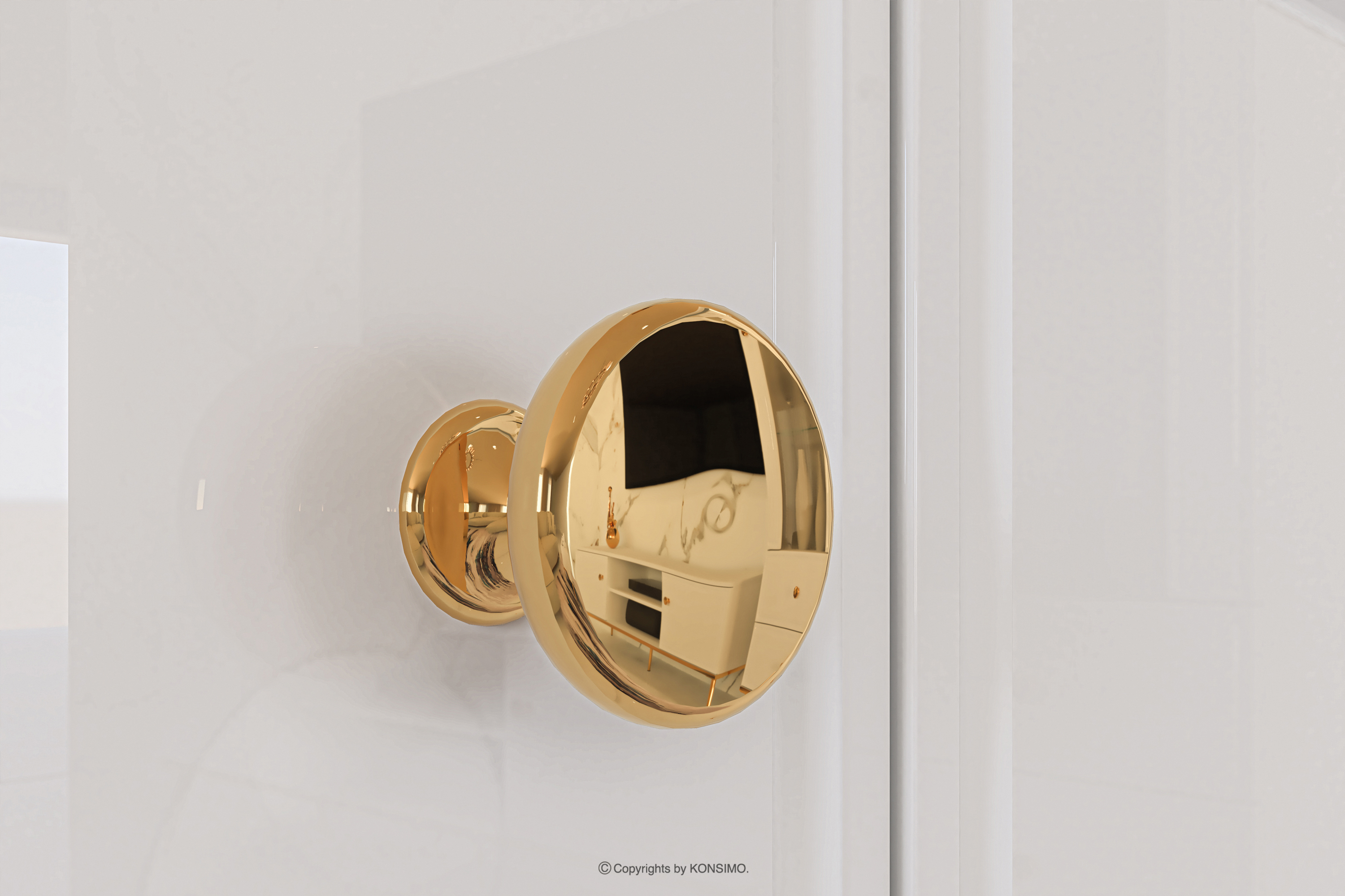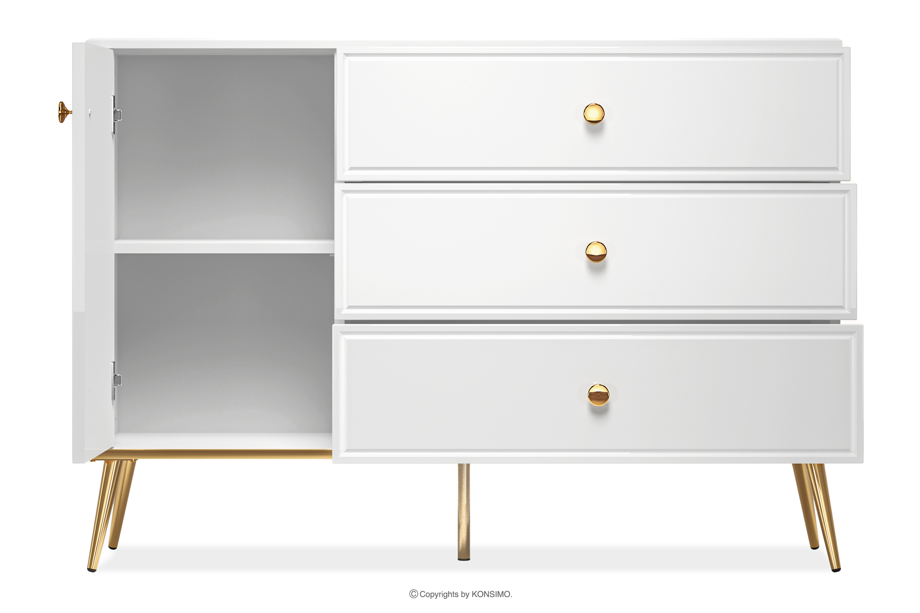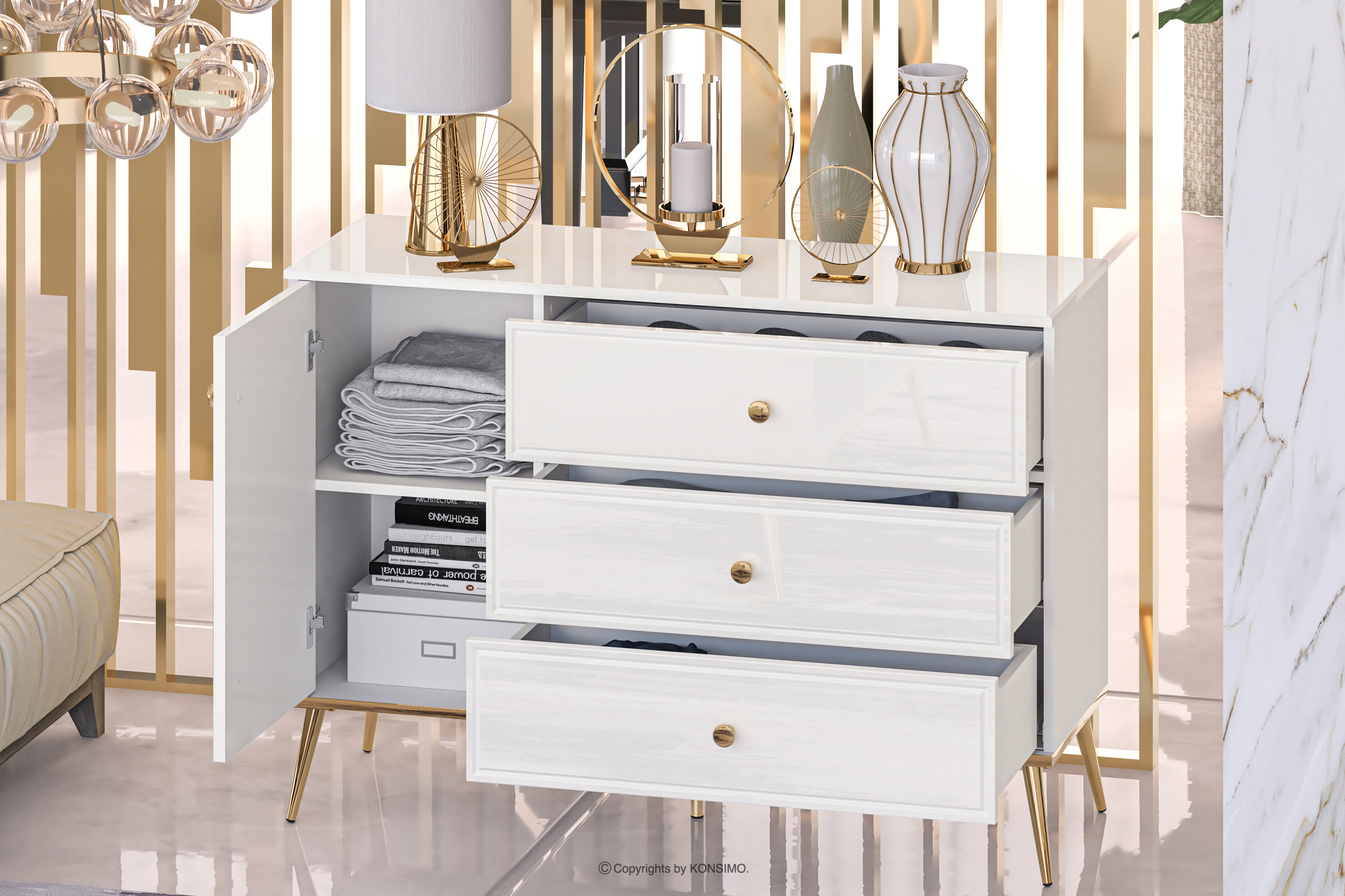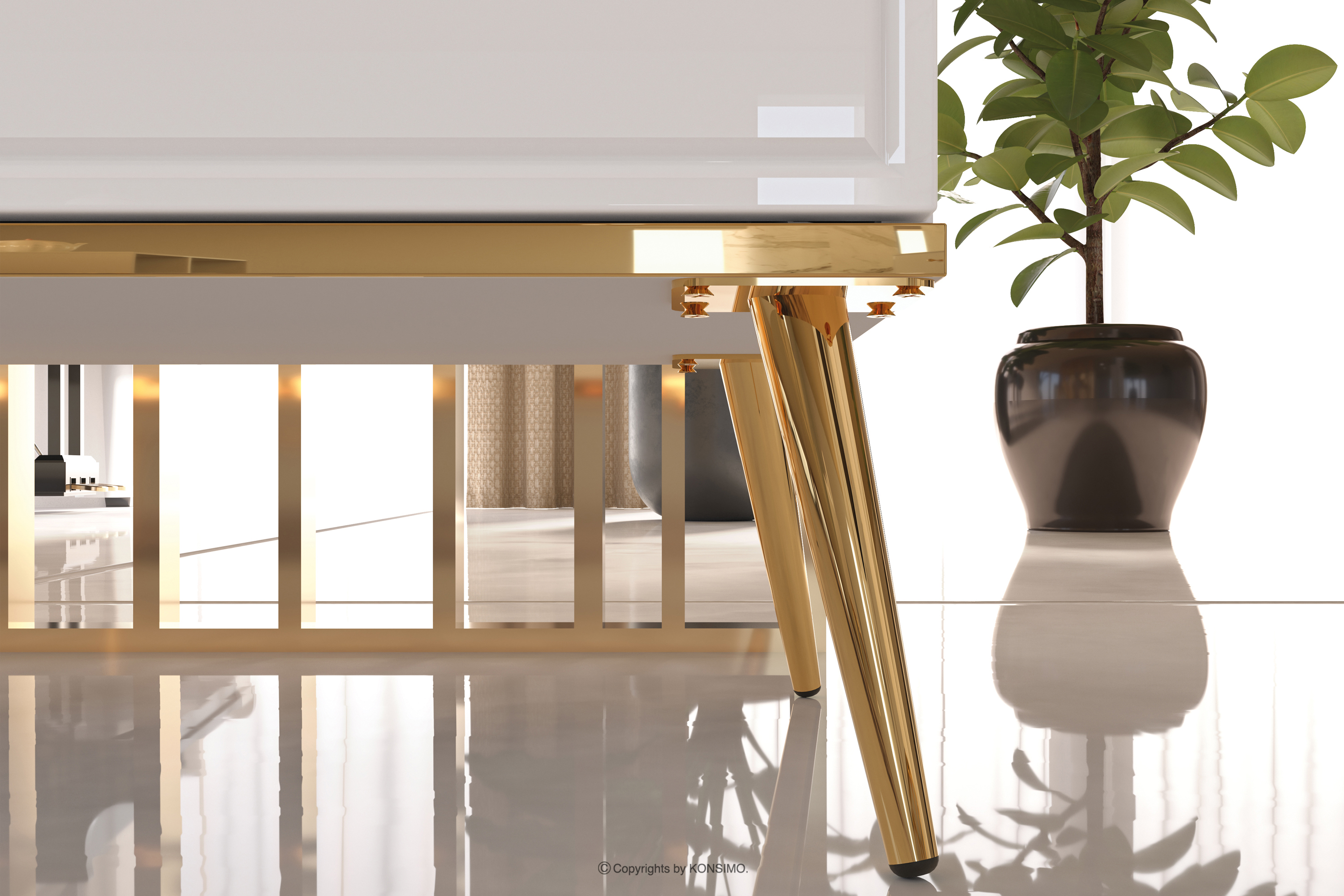 Elegantná lesklá komoda na vysokých nožičkách vnesie do vašej domácnosti prvky elegancie. Vytvorená pre tých, ktorí ocenia nielen štýl, ale aj pevnosť, korpus z laminovanej dosky/MDF je istým základom pre každý interiér. Vysoký lesk dodáva nezameniteľný lesk, zatiaľ čo zlaté kónické nožičky a úchyty sú ako bodka nad "i". To však nie je všetko!