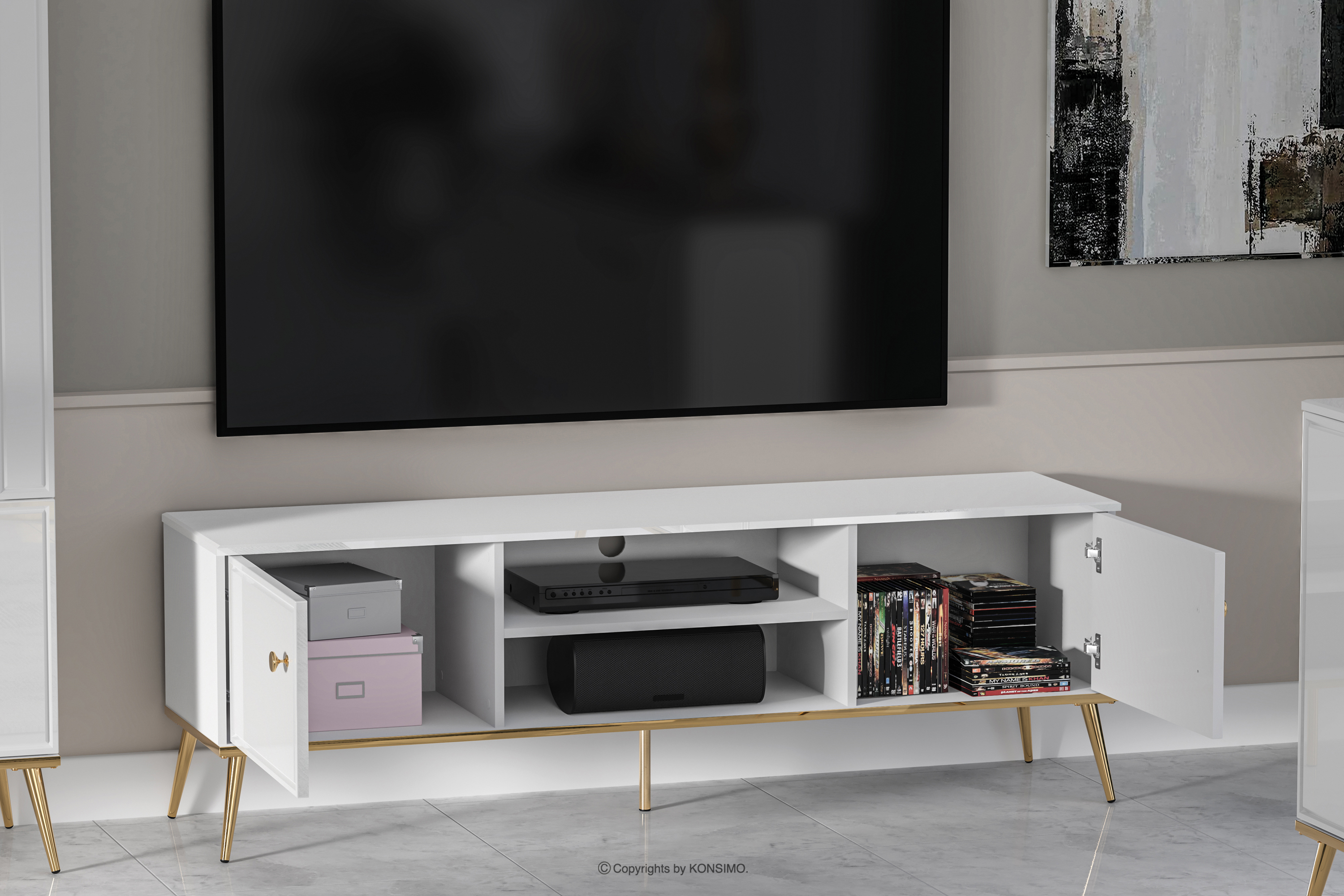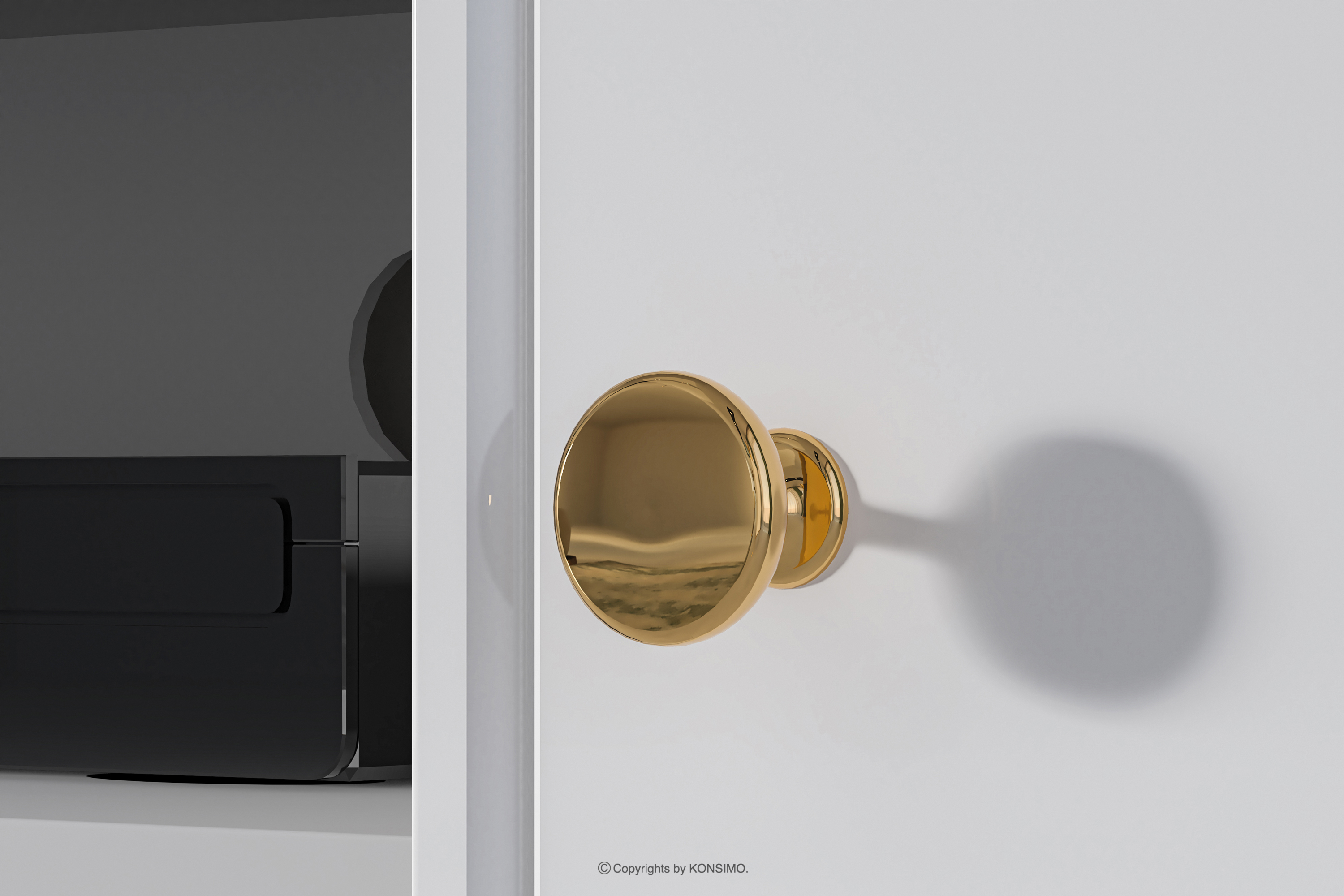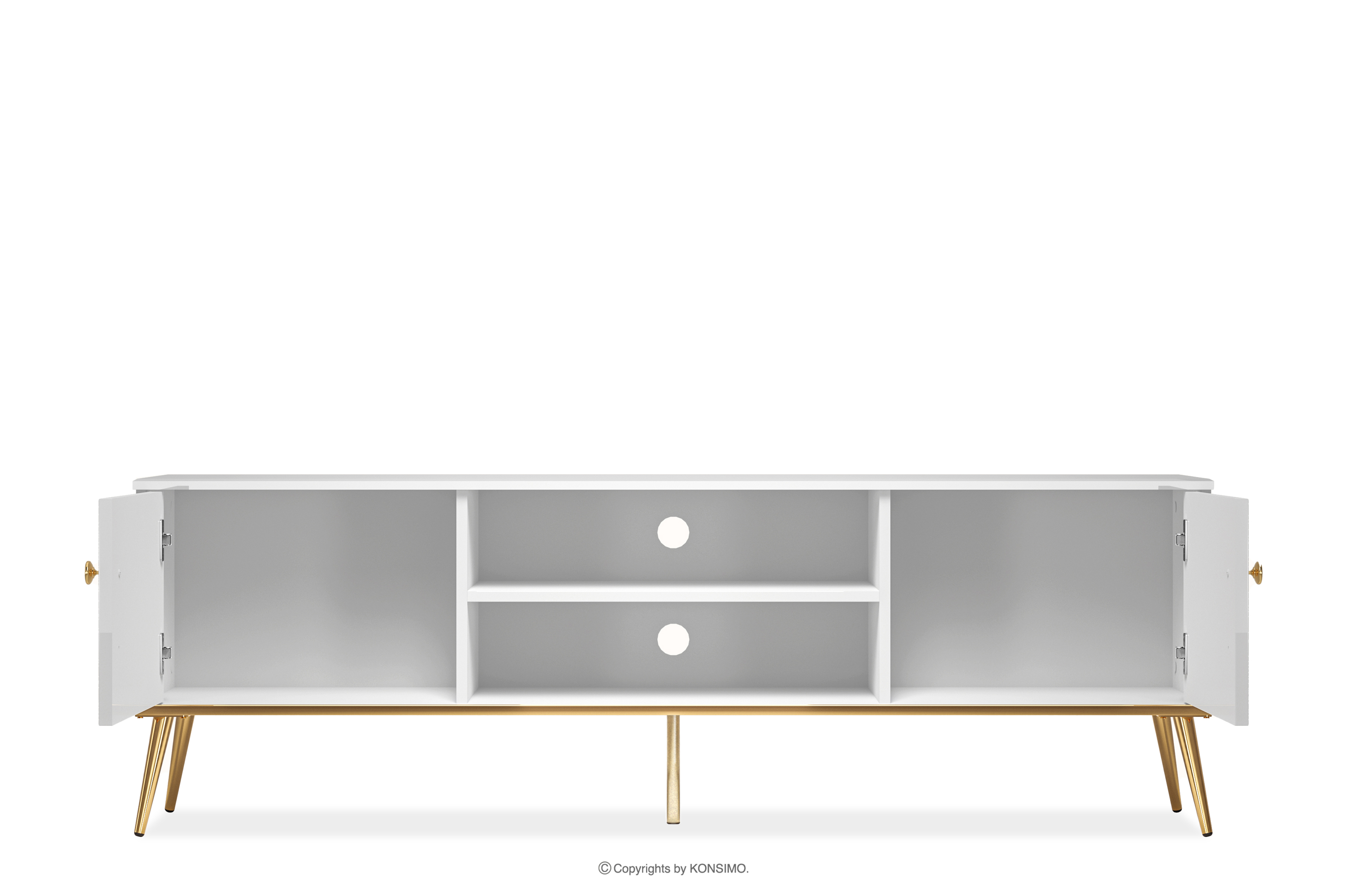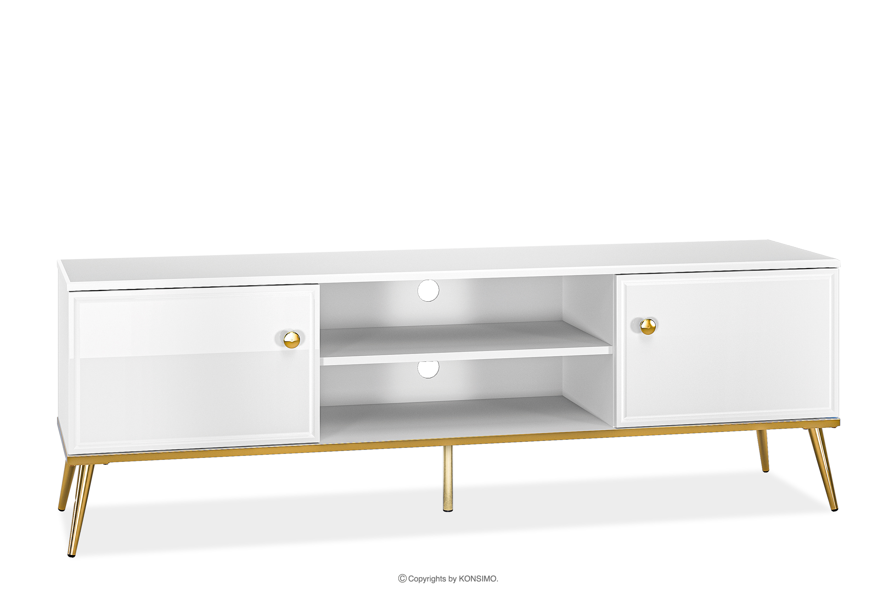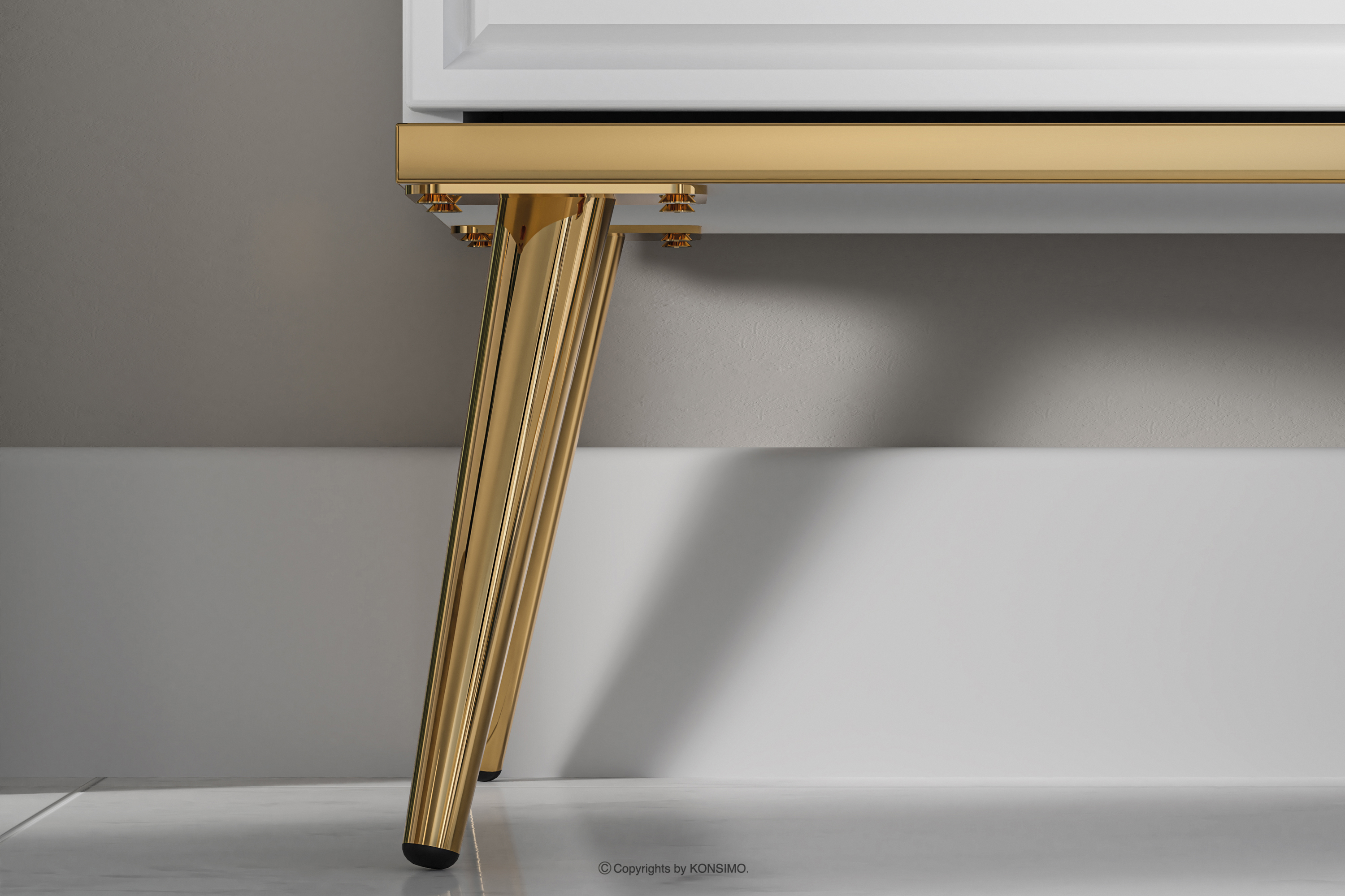 Elegantná skrinka RTV v lesku na vysokých nožičkách vnesie do vašej domácnosti prvky elegancie. Vytvorená pre tých, ktorí ocenia nielen štýl, ale aj pevnosť, korpus z laminovanej dosky/MDF je istým základom pre každý interiér. Vysoký lesk dodáva neprehliadnuteľný lesk, zatiaľ čo zlaté kónické nožičky a úchytky sú ako bodka nad "i".