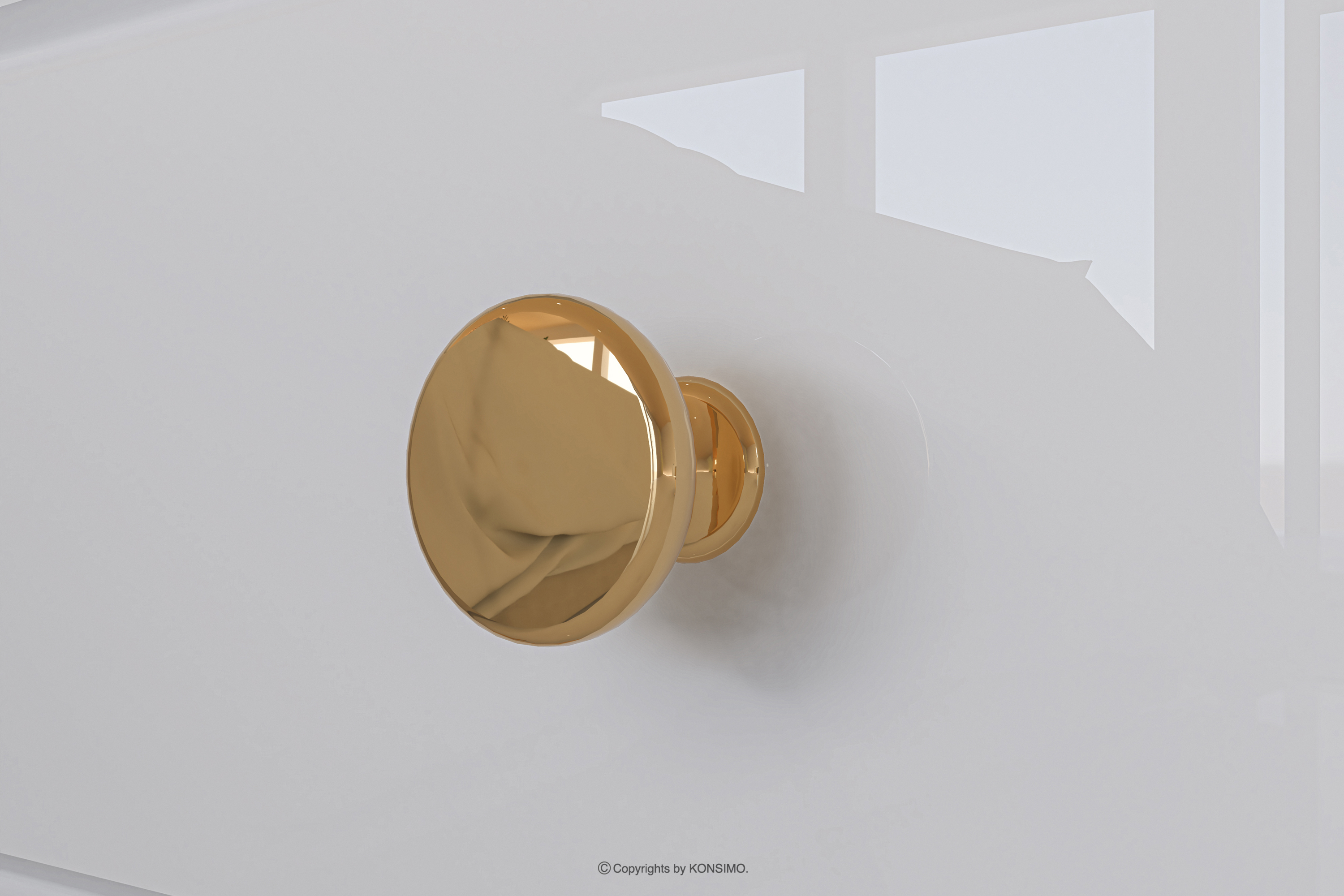 Predná strana z laminovanej dosky/MDF nie je len otázkou vzhľadu - je to aj otázka pevnosti, ktorá zaručuje nezmenený vzhľad po veľmi dlhú dobu. Zlaté akcenty v podobe úchytiek a nožičiek dodávajú nábytku šarm a jemne zdobia biely blok. Vďaka pevnej konštrukcii a starostlivej povrchovej úprave slúži nielen svojej funkcii, ale stáva sa aj hlavným protagonistom elegantného usporiadania priestoru. Plnovýsuvné výsuvy v zásuvkách uľahčujú používanie a zvýšená nosnosť vďaka zosilnenému dnu zaručuje, že komoda nielen zaujme, ale aj splní praktické očakávania.
