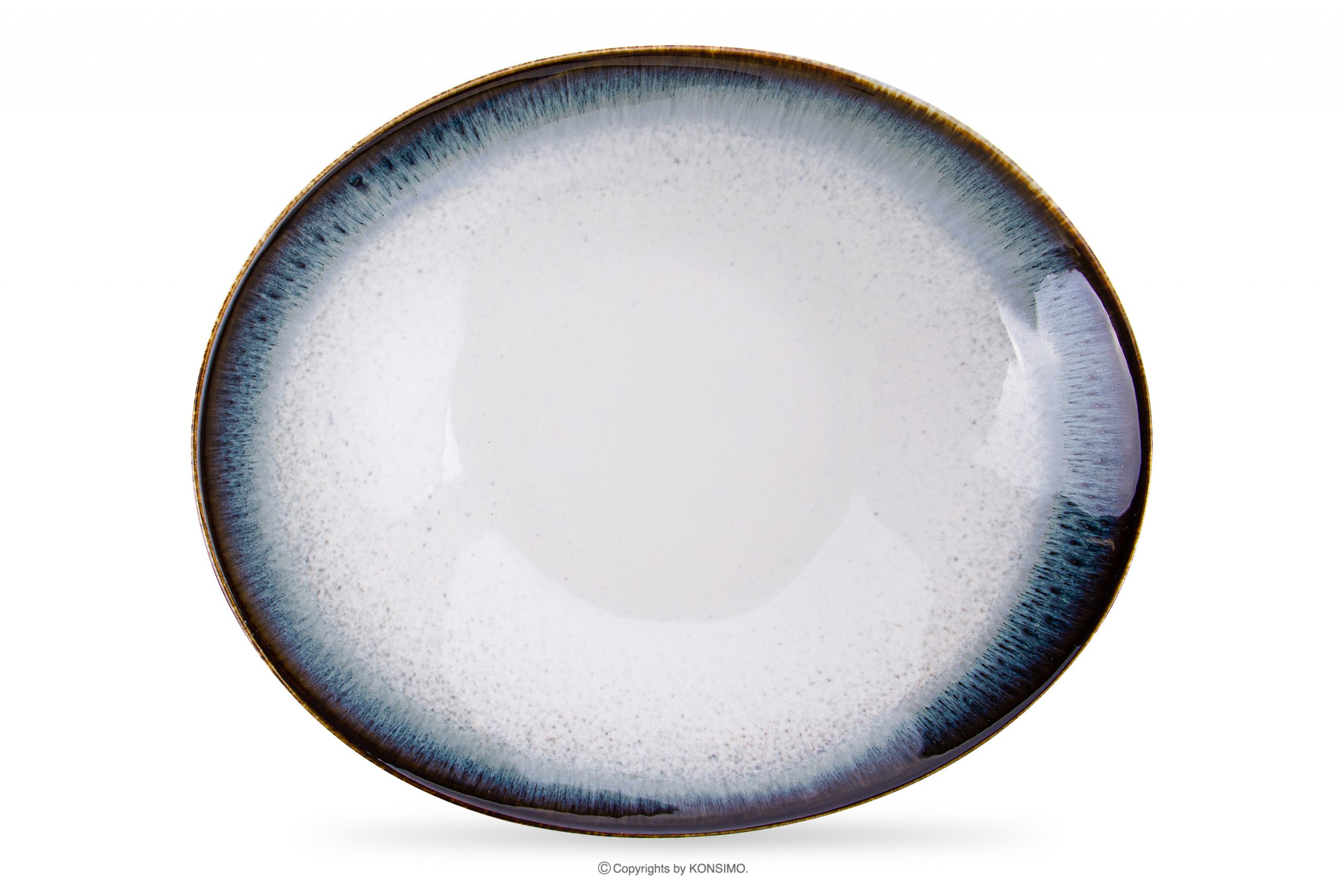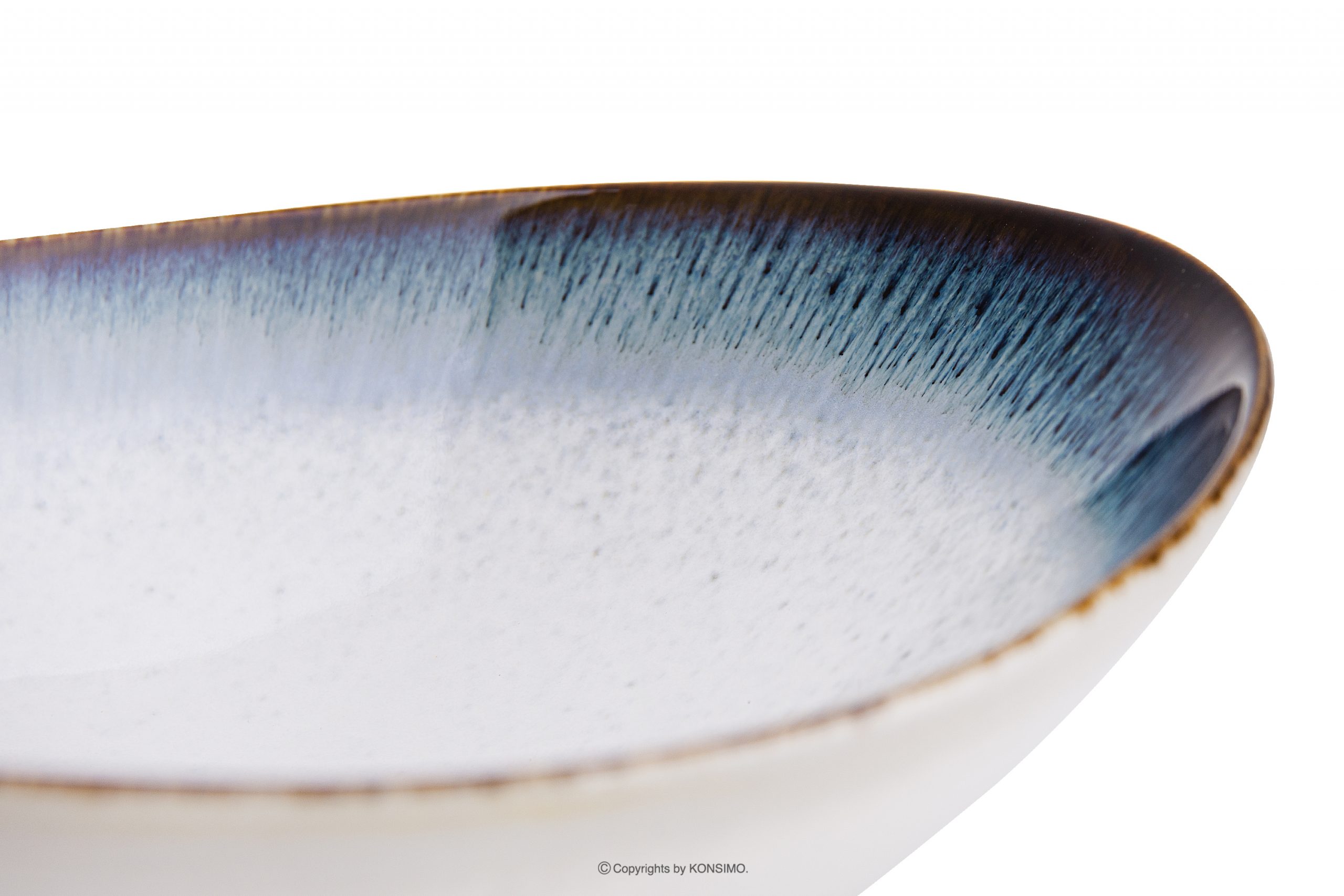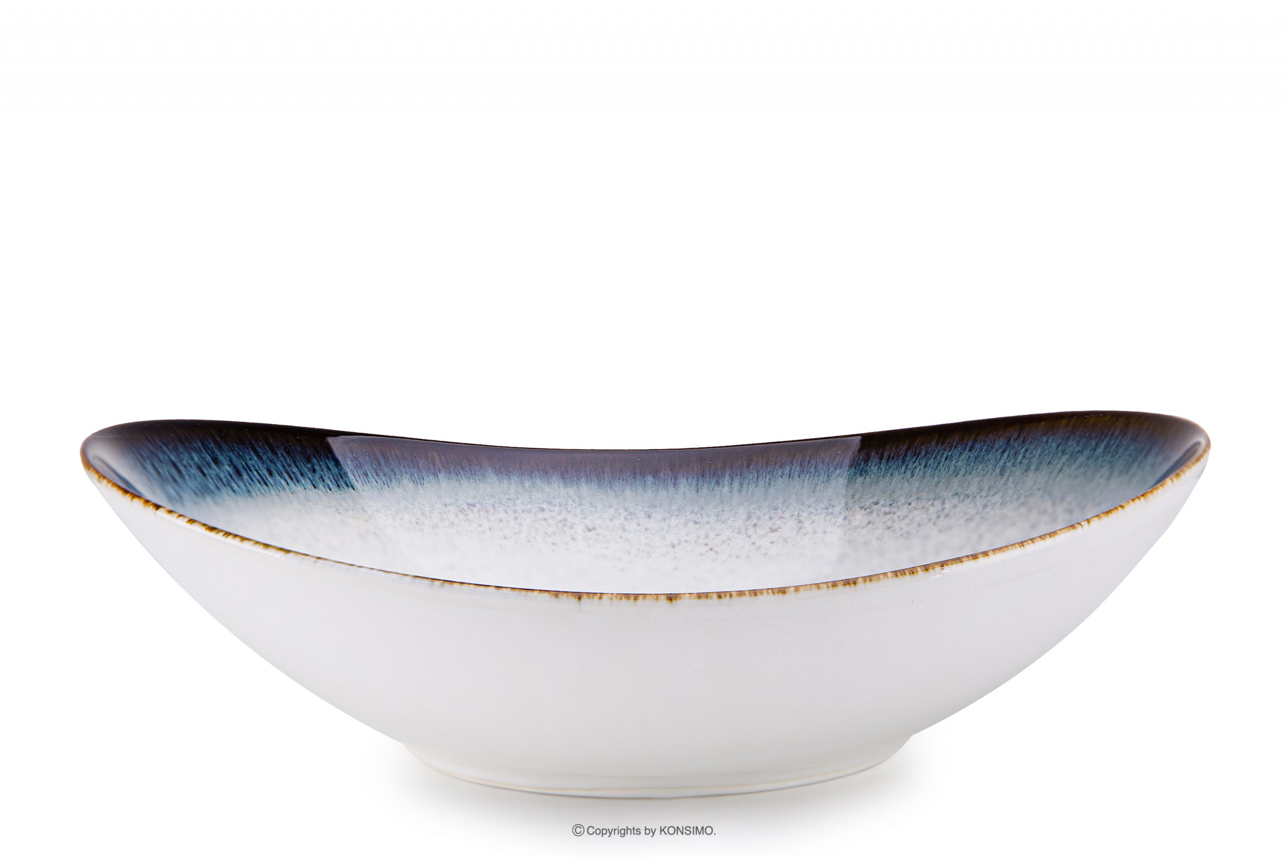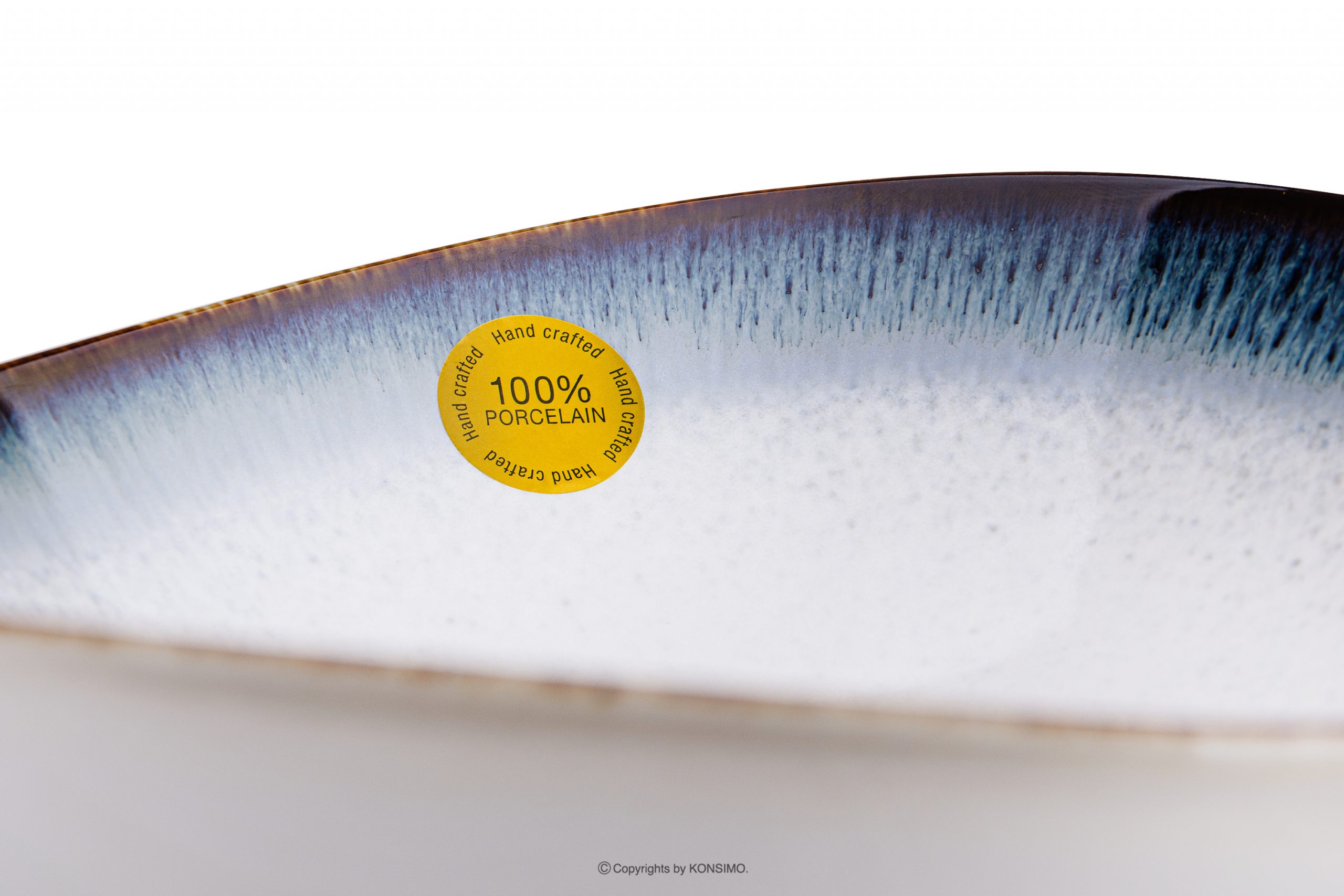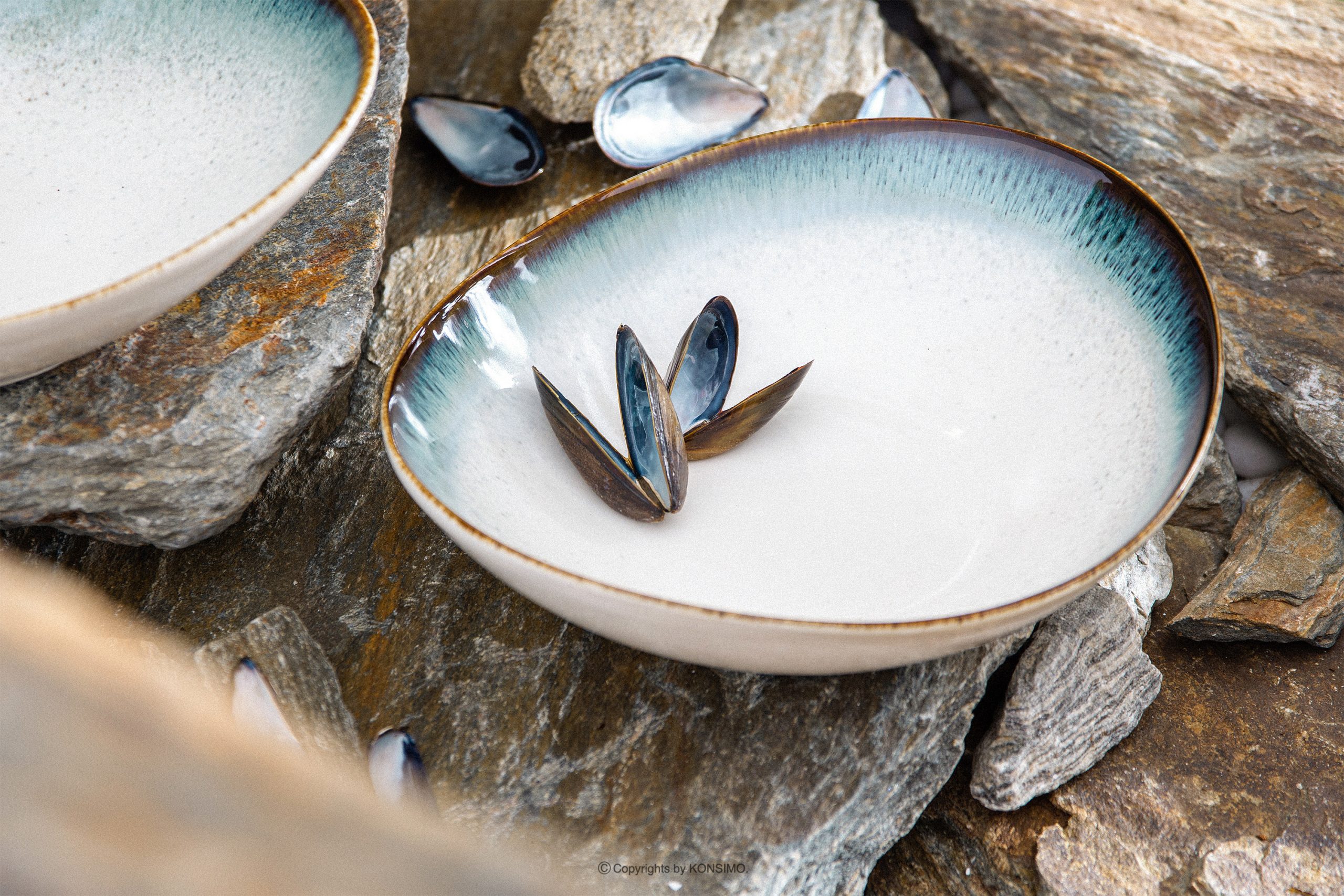 Hlboký tanier s jedinečným dizajnom bol vytvorený tak, aby dodal vášmu prestretému stolu farbu. Je vyrobený z vysokokvalitného porcelánu a dokonale sa hodí k námorníckej, námorníckej a škandinávskej tematike. Charakteristickým znakom je technika nanášania vzoru pomocou reaktívnej glazúry. Vďaka tomu je každý kus jedinečný a jednotlivé kusy sa od seba líšia.