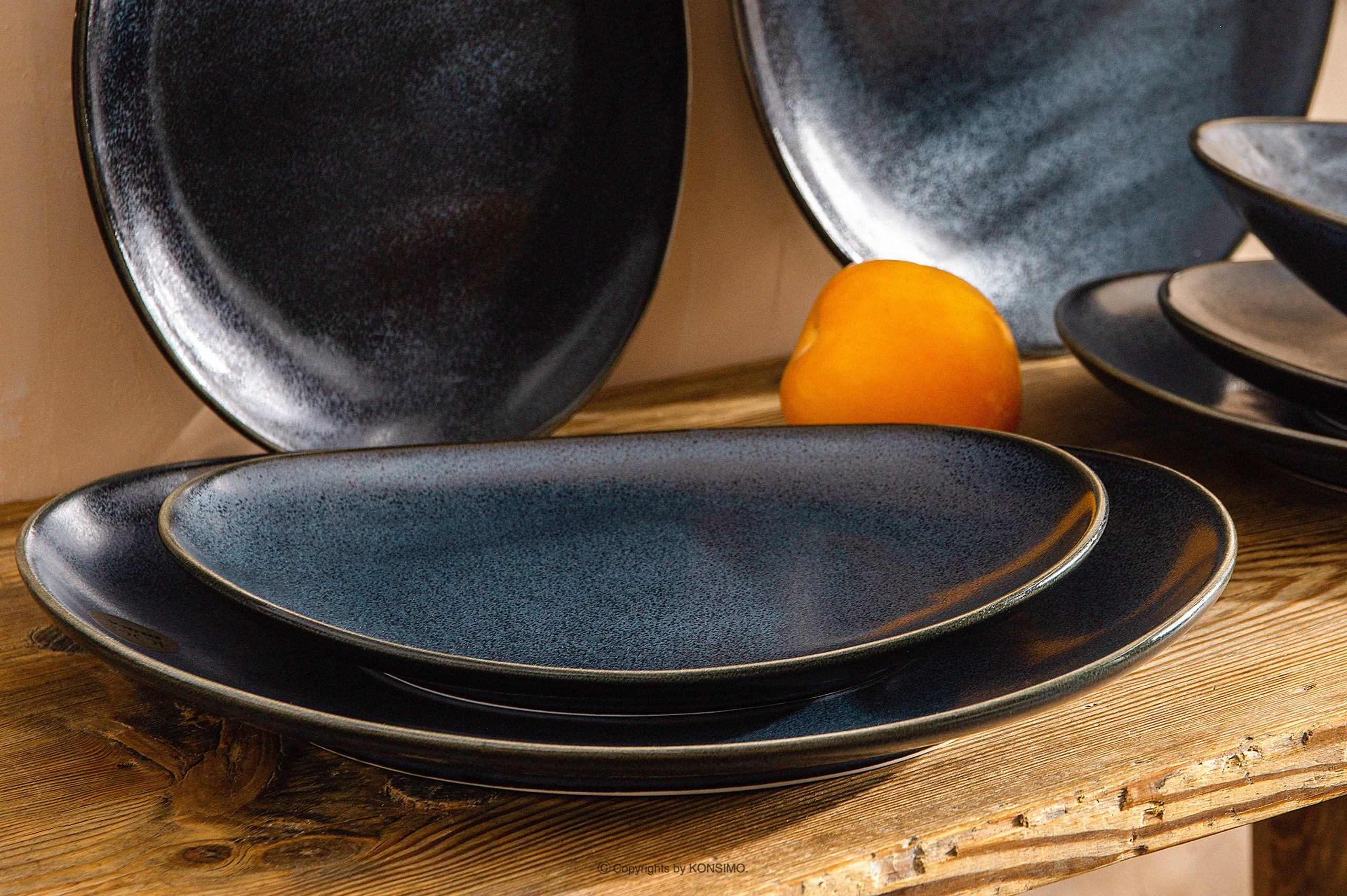 Grafitový riad má mnoho výhod, napríklad to, že sa dá ľahko zladiť s mnohými rôznymi štýlmi. Skvele vyzerá v tradičných interiéroch, ale aj v moderných a minimalistických zariadeniach. Porcelánový riad oválneho tvaru je skvelým doplnkom každého stola a dodáva mu elegantný nádych. Okrem toho sa vzor kusov môže líšiť, pretože sa nanáša technikou reaktívnej glazúry.