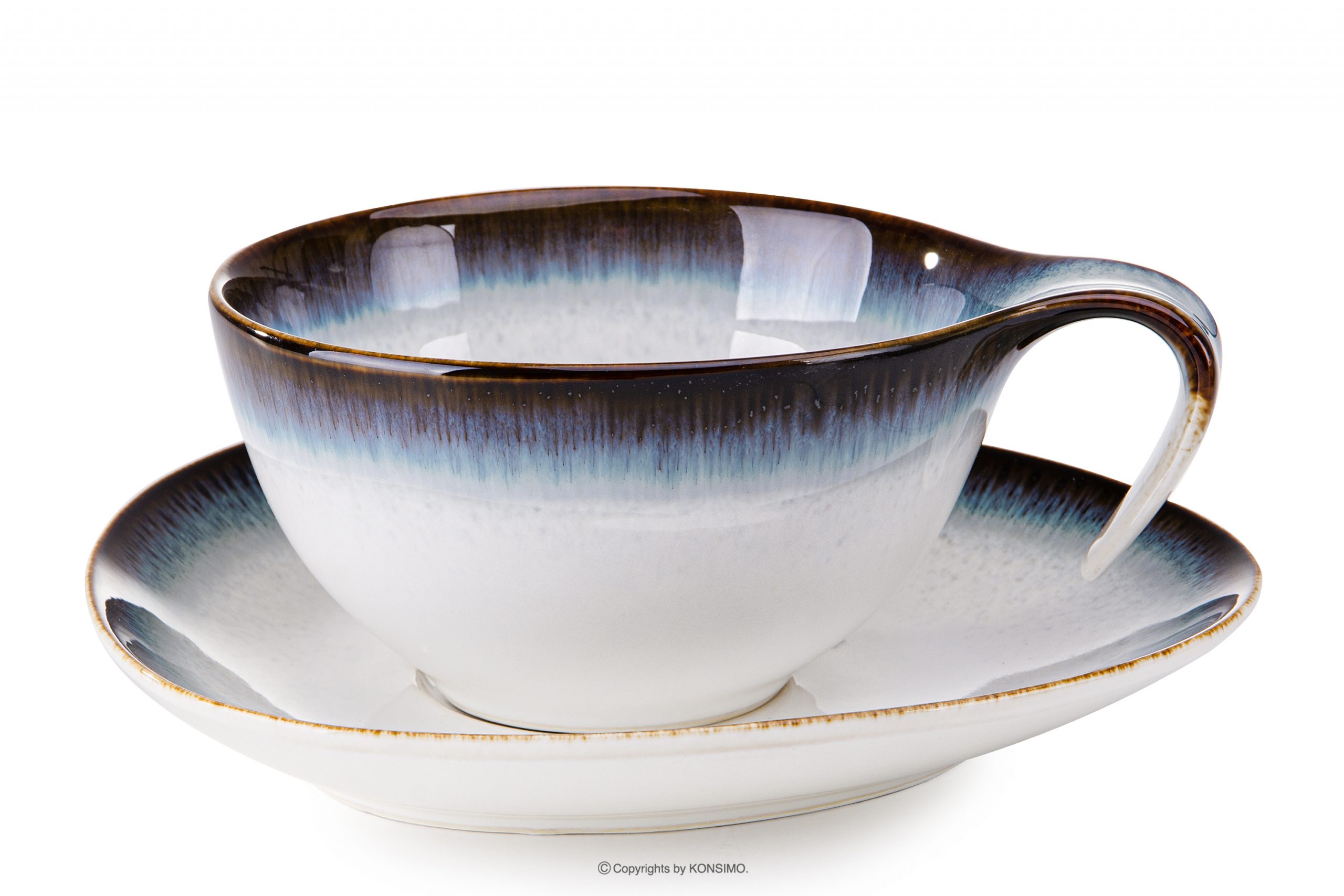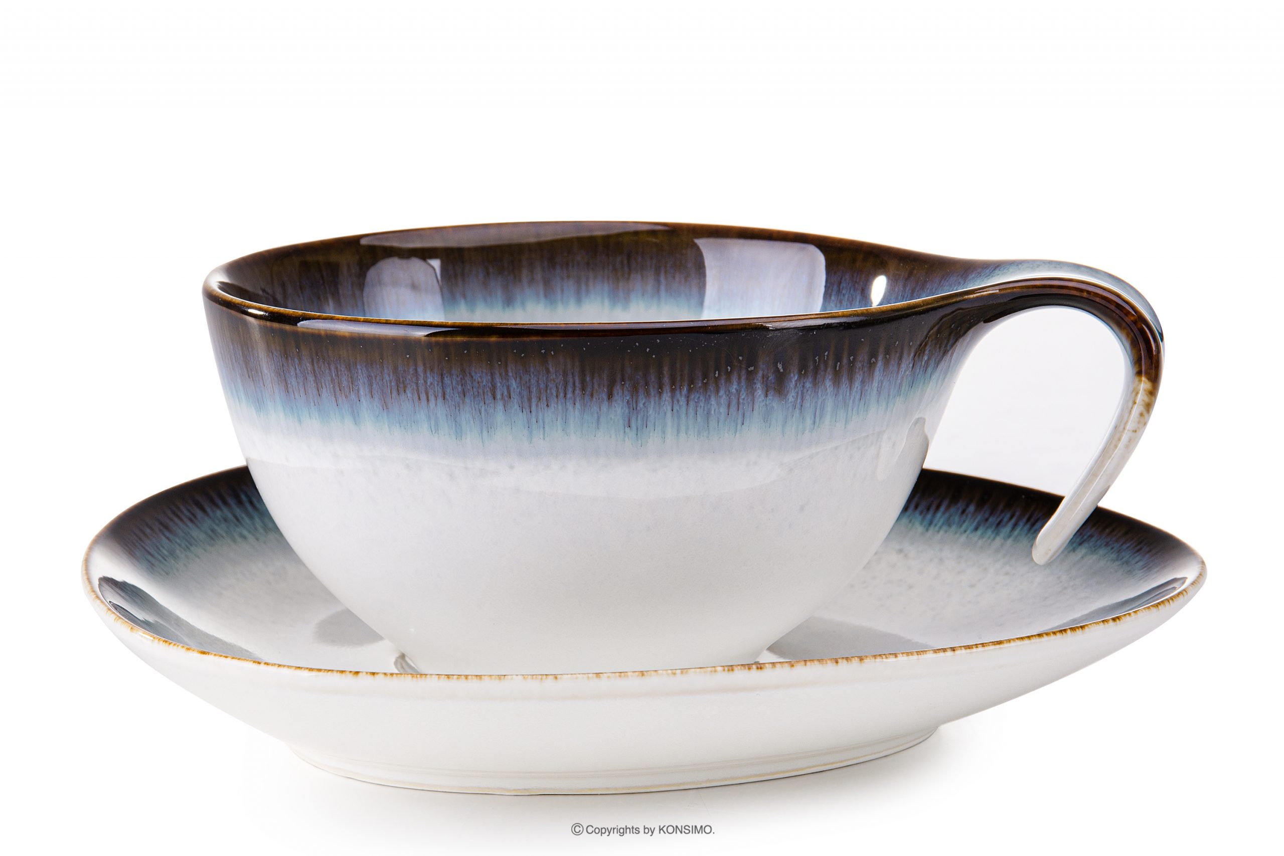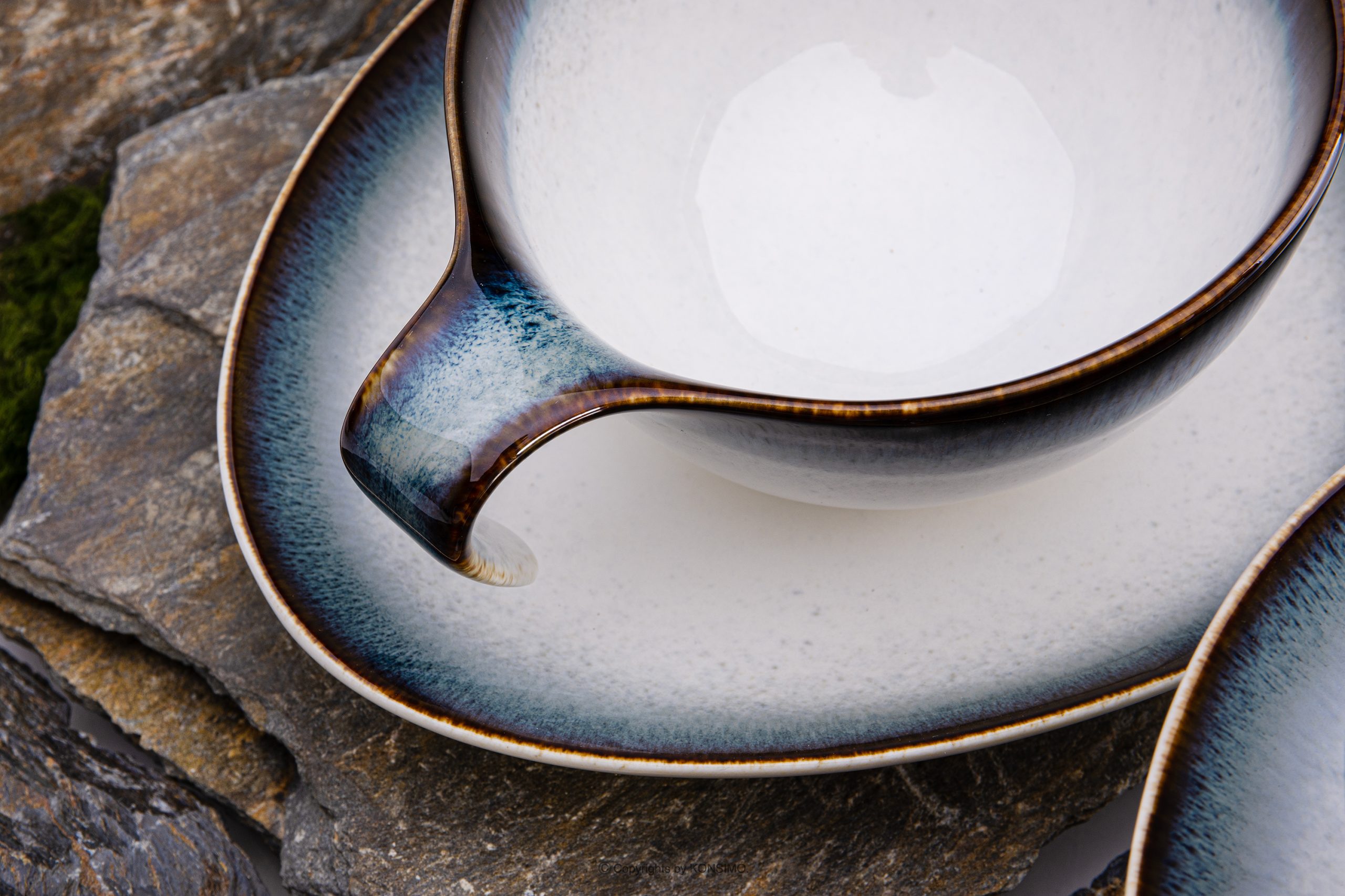 Jedinečne navrhnutá šálka a podšálka na čaj boli vytvorené tak, aby dodali vášmu stolu farbu. Je vyrobená z kvalitného porcelánu a dokonale sa hodí k námorníckym, námorníckym a škandinávskym motívom. Charakteristickým znakom je technika nanášania dizajnu pomocou reaktívnej glazúry. Vďaka tomu je každý kus jedinečný a jednotlivé kusy sa od seba líšia.