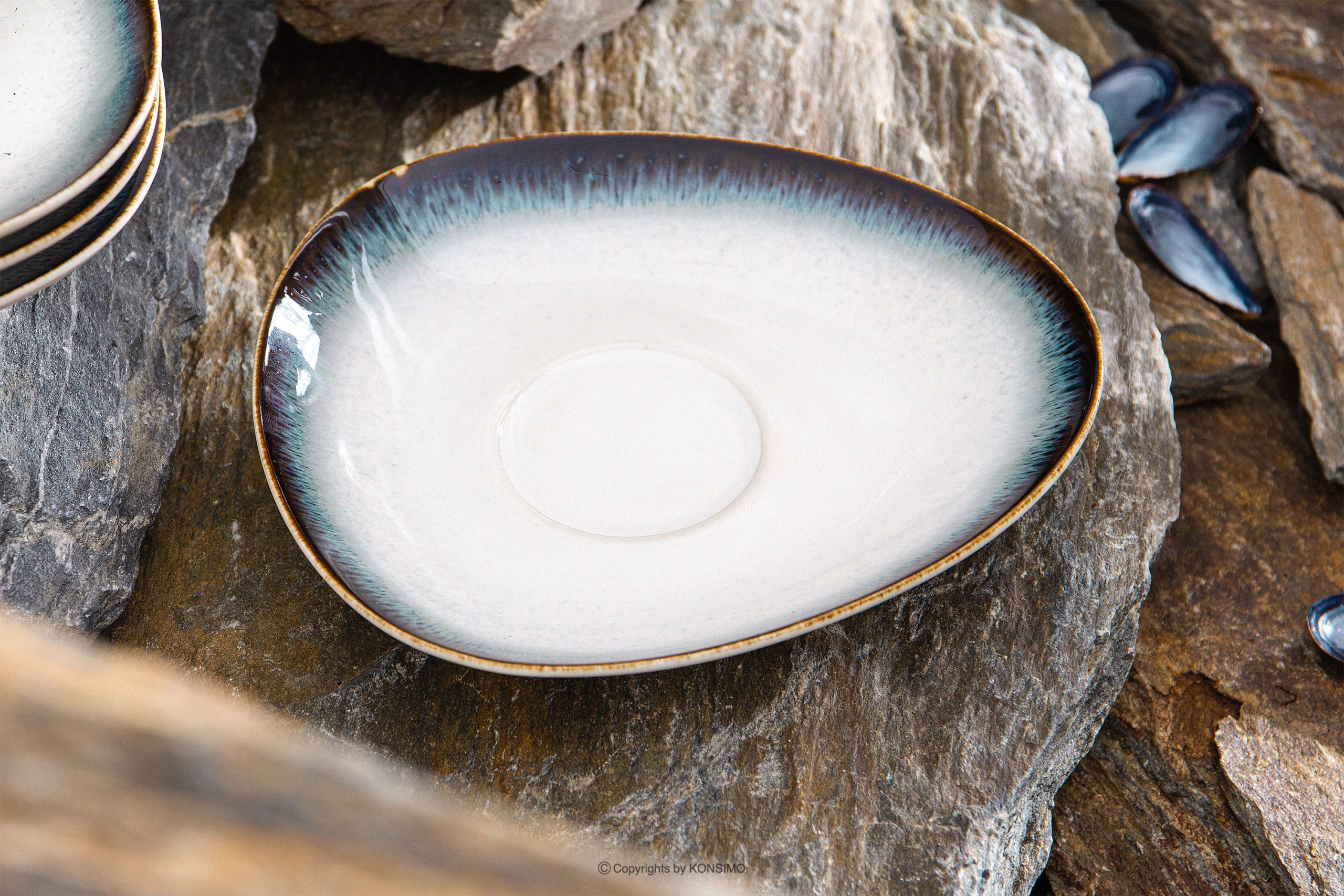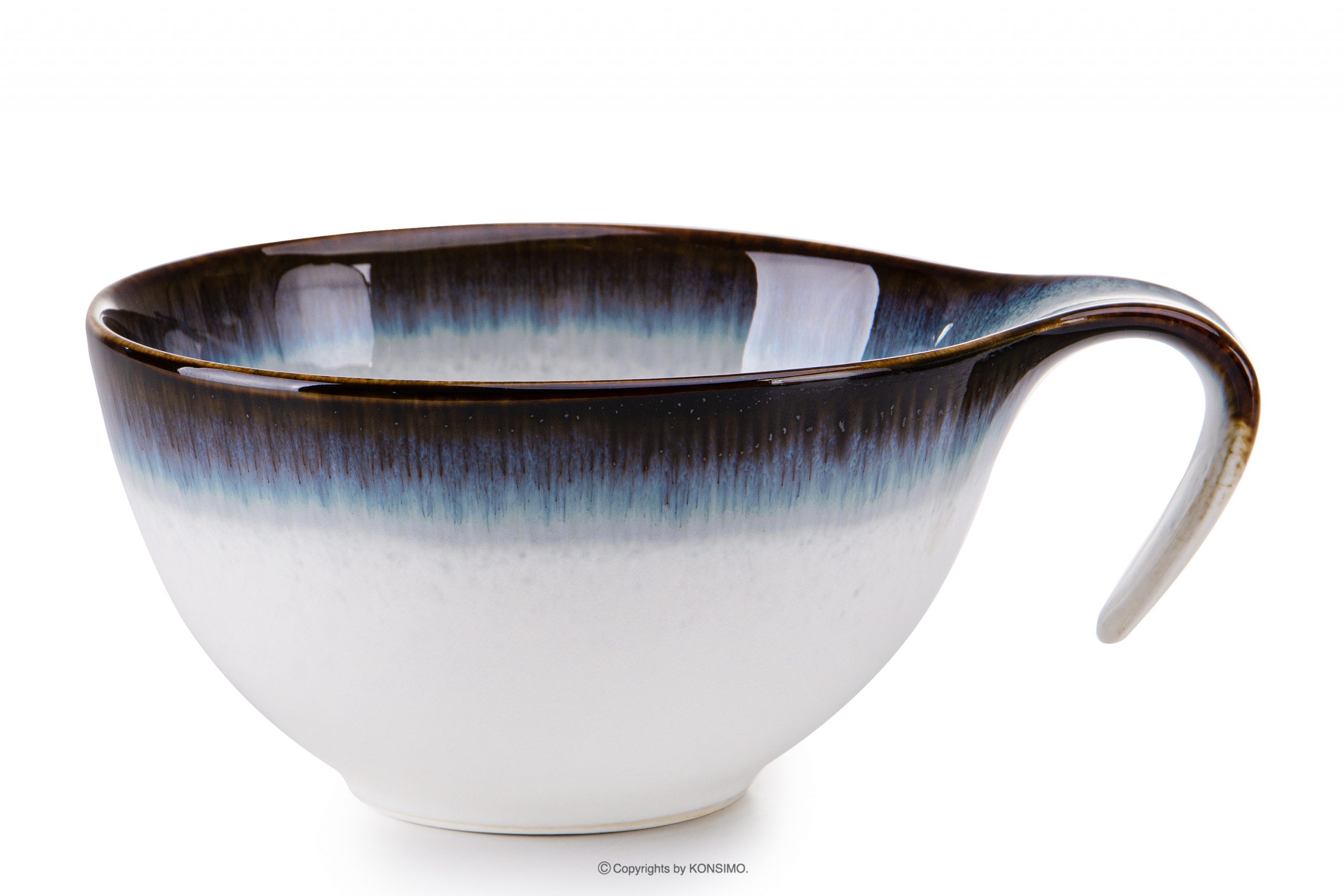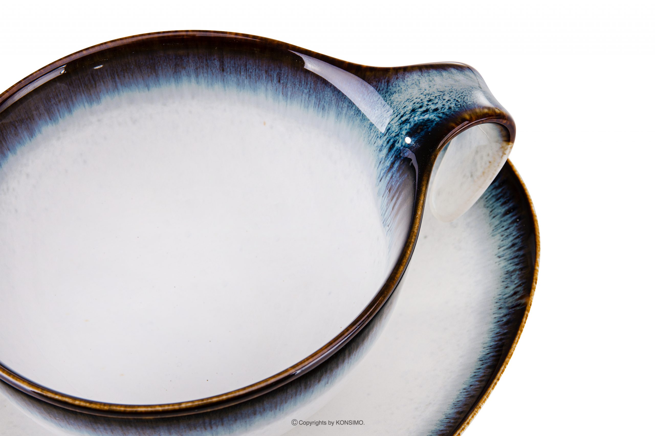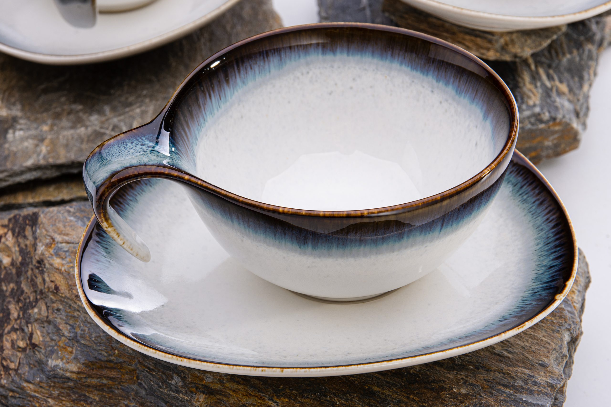 Jedinečne navrhnutá šálka a podšálka na čaj boli vytvorené tak, aby dodali vášmu stolu farbu. Je vyrobená z kvalitného porcelánu a dokonale sa hodí k námorníckym, námorníckym a škandinávskym motívom. Charakteristickým znakom je technika nanášania dizajnu pomocou reaktívnej glazúry. Vďaka tomu je každý kus jedinečný a jednotlivé kusy sa od seba líšia.