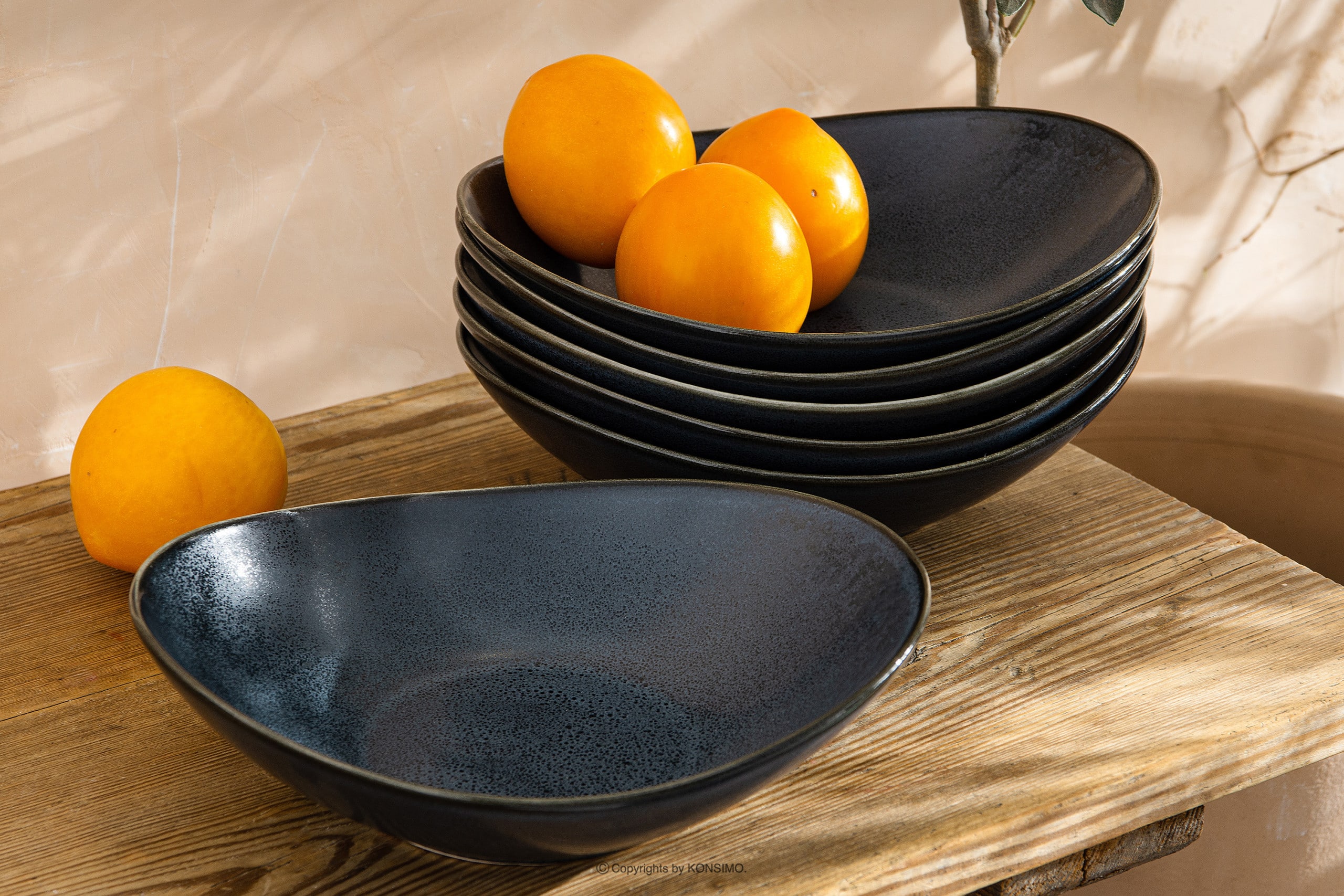 Táto súprava 6 elegantných hlbokých tanierov je dokonalým doplnkom klasického riadu. Sú vyrobené z porcelánu a majú grafitový odtieň, sú odolné a zároveň predstavujú nenápadný akcent na vašom jedálenskom stole. Vďaka grafitovej farbe pôsobia veľmi elegantne a potešia každého hosťa vo vašej domácnosti. TIME BLACK je kolekcia, ktorá prekvapí svojím netradičným dizajnom a zároveň je vysoko funkčná a vďaka svojmu nepravidelnému tvaru sa bude vynímať na rodinnom jedálenskom stole.
