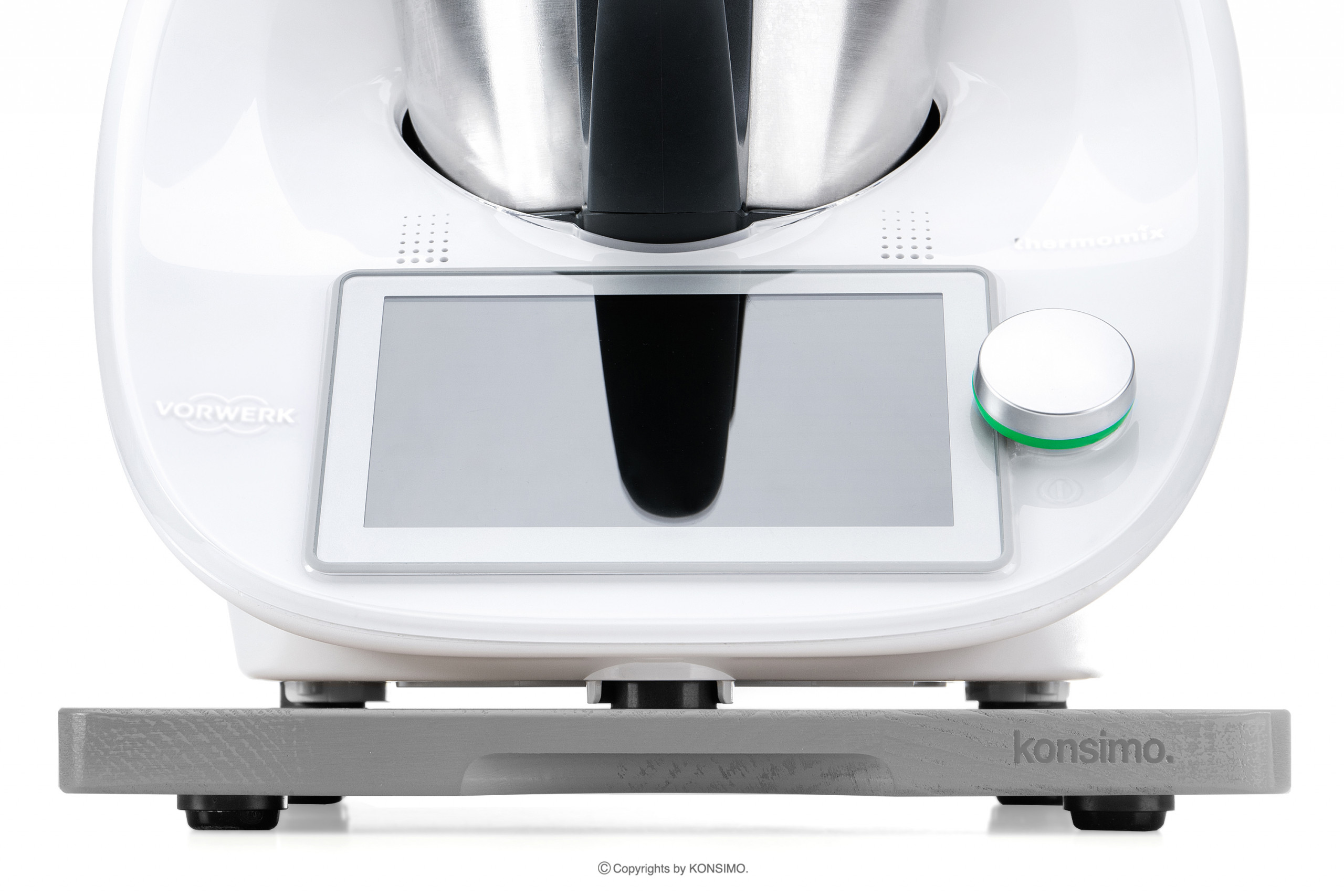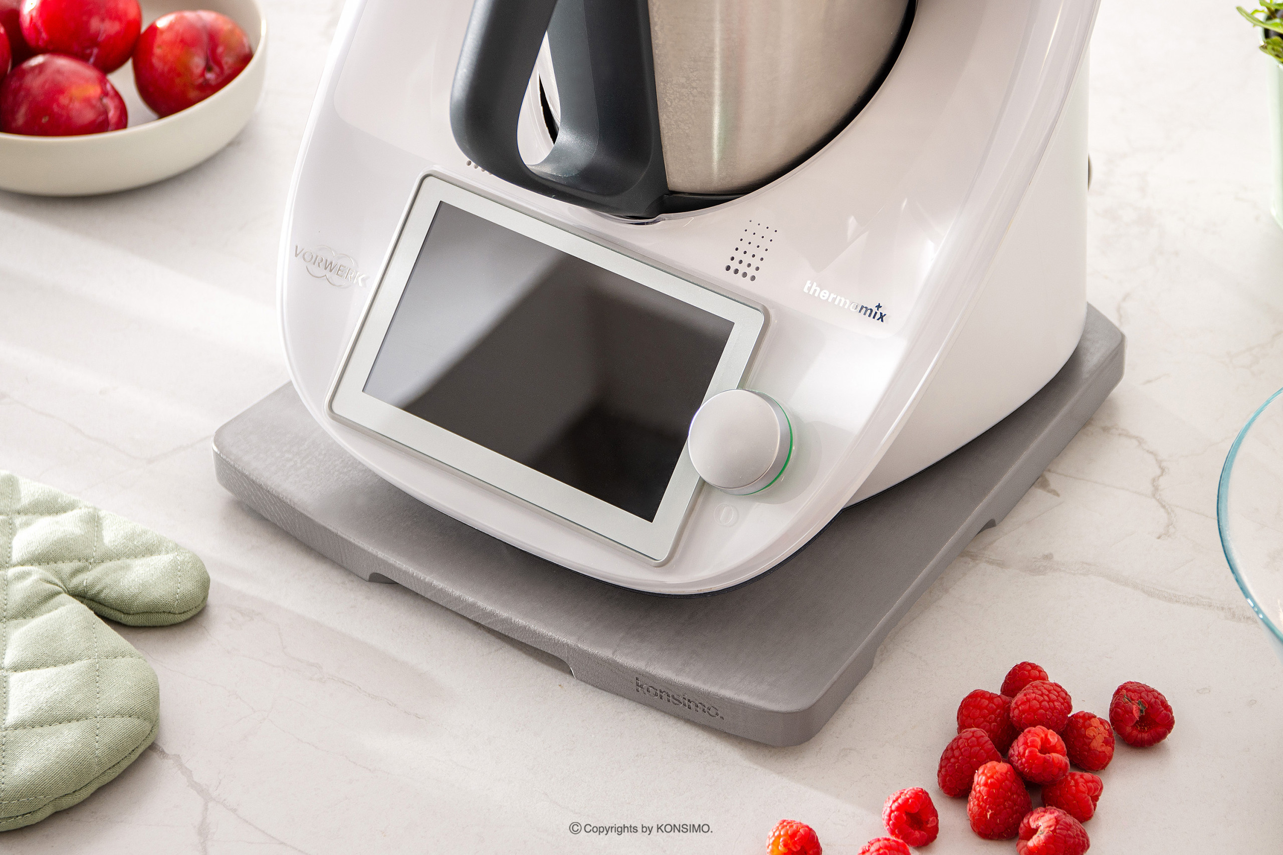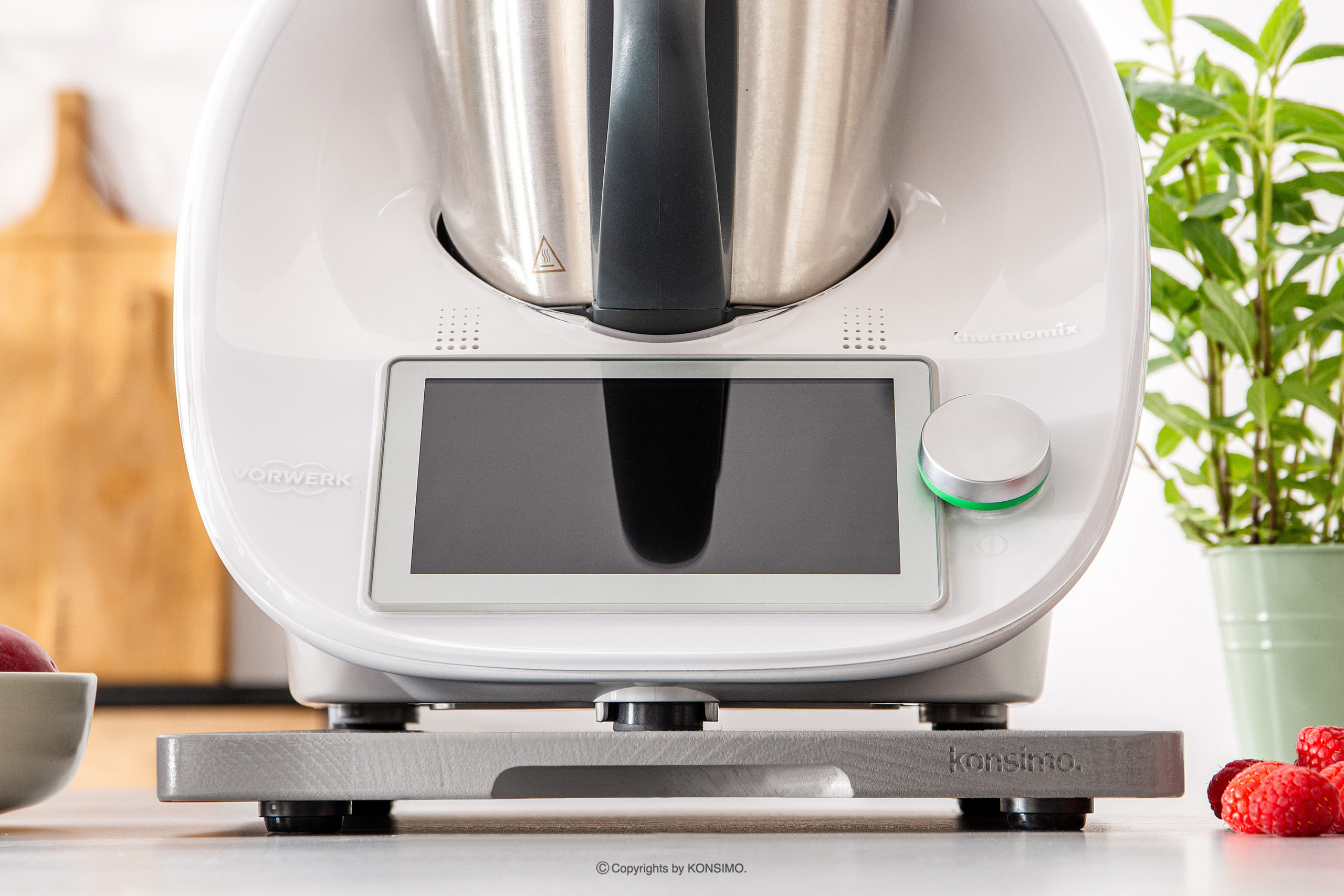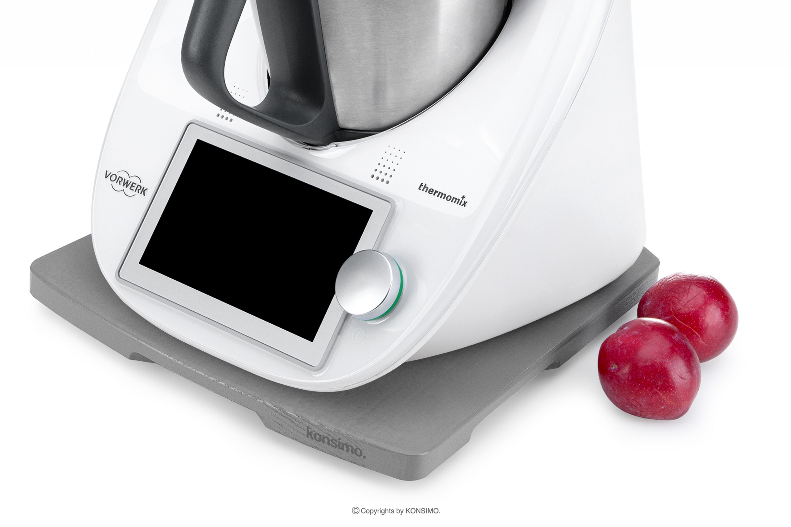 Sivý stojan Thermomix bol navrhnutý na stabilné umiestnenie spotrebiča. Vďaka špeciálne tvarovaným priehlbinám a gumovým nožičkám doska účinne zabraňuje poškodeniu snímača stupnice, ktorý je umiestnený v nožičkách spotrebiča. To zaručuje bezpečné a neprerušované používanie Thermomixu. Doska COQUERE má ergonomický tvar a vyfrézované rukoväte po stranách a vpredu na jednoduchú manipuláciu a pohyb.