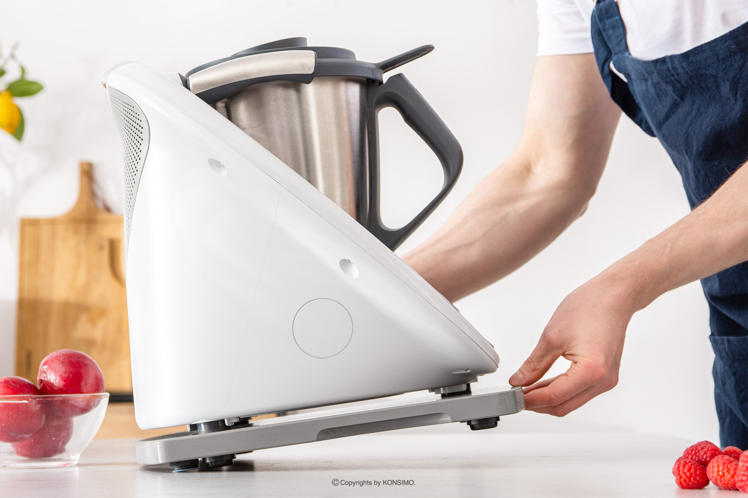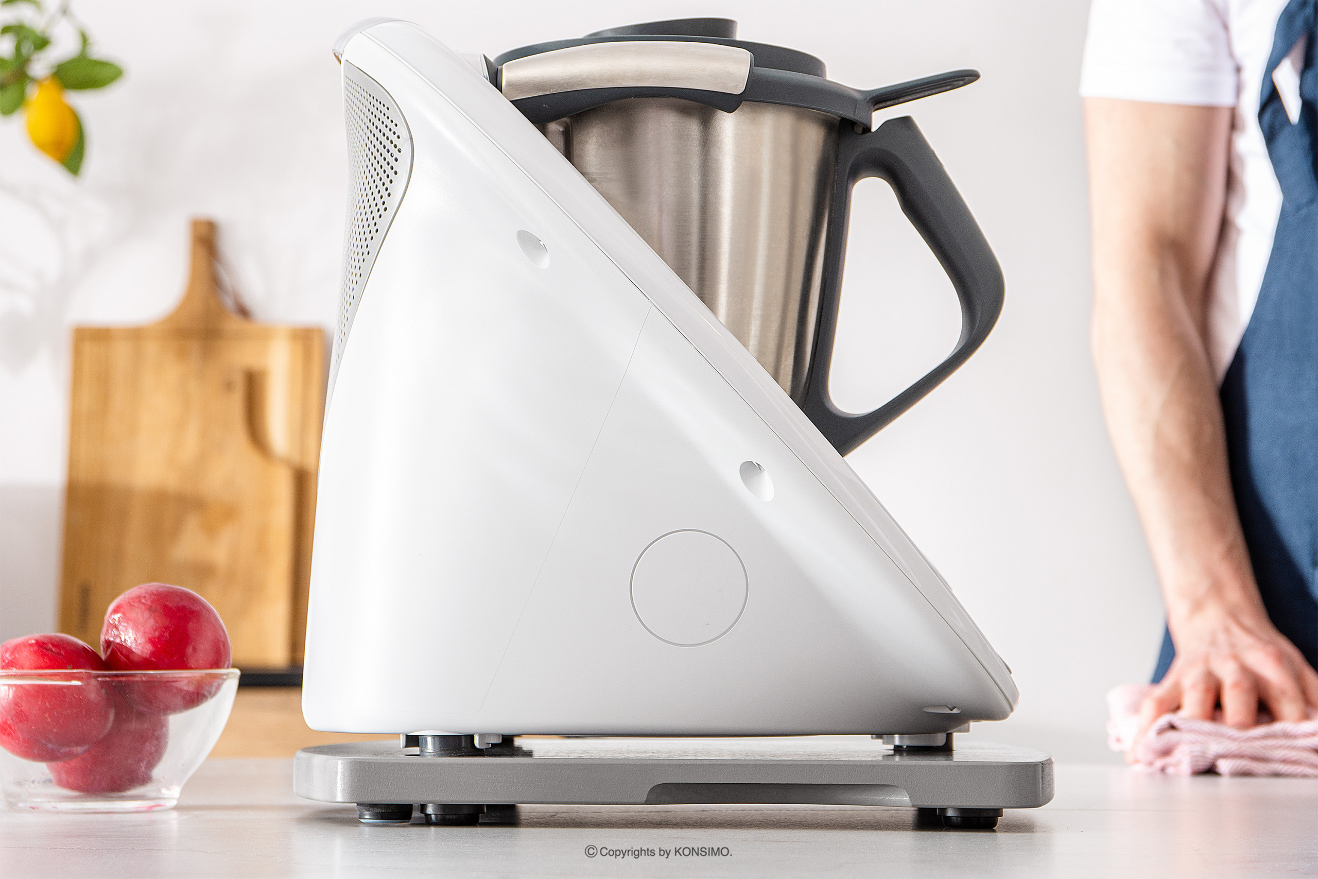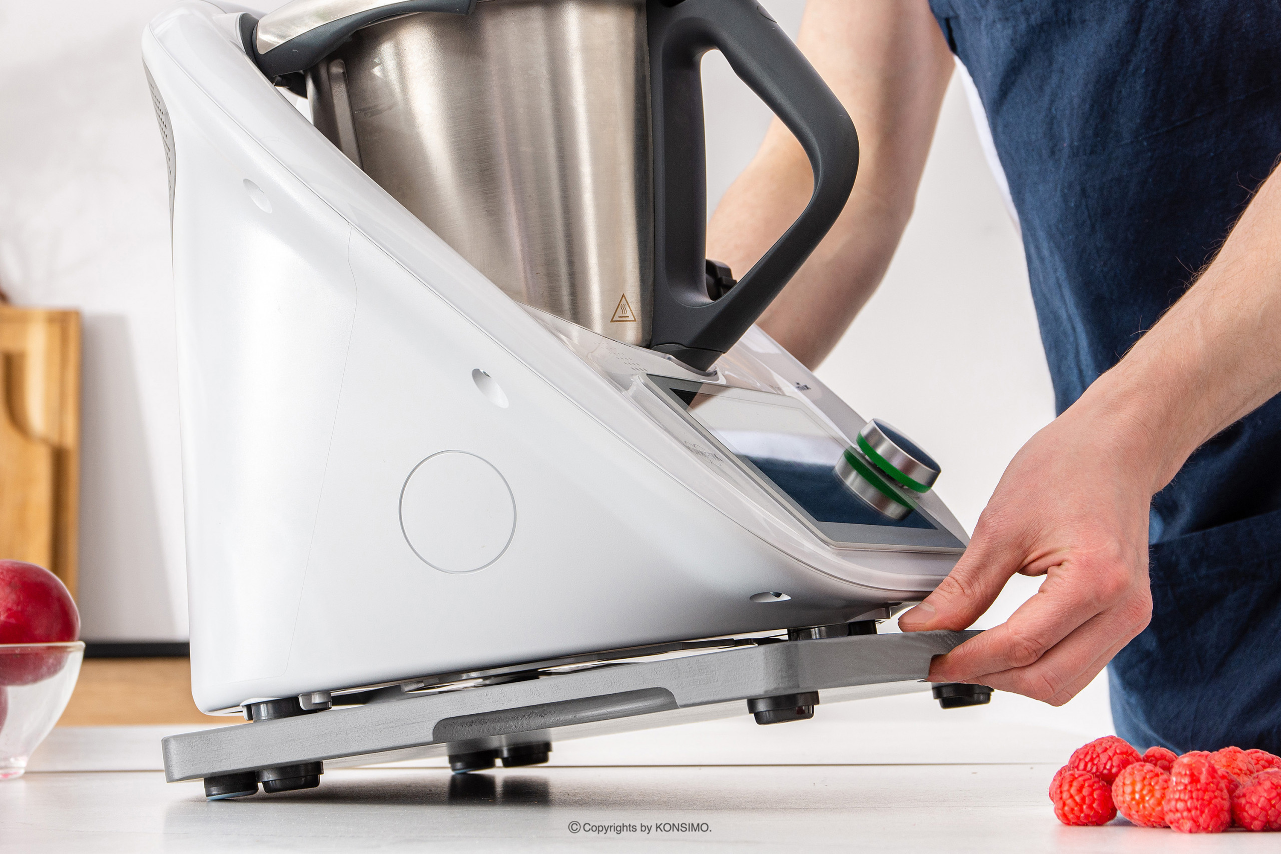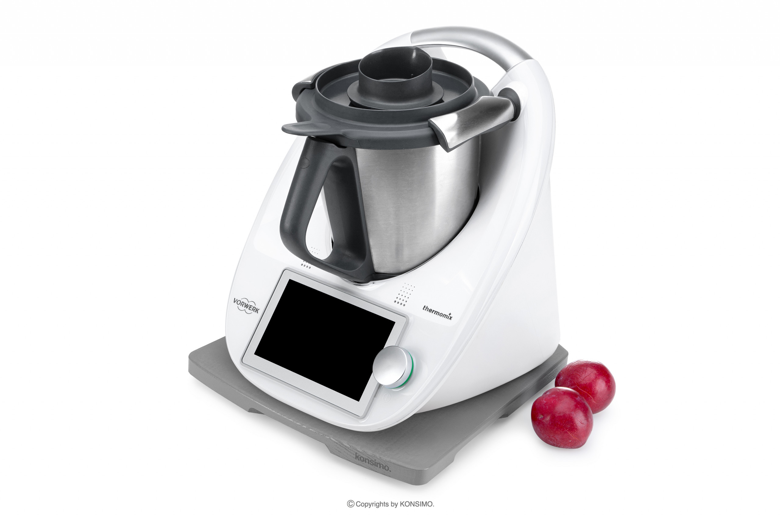 Sivý stojan Thermomix bol navrhnutý na stabilné umiestnenie spotrebiča. Vďaka špeciálne tvarovaným priehlbinám a gumovým nožičkám doska účinne zabraňuje poškodeniu snímača stupnice, ktorý je umiestnený v nožičkách spotrebiča. To zaručuje bezpečné a neprerušované používanie Thermomixu. Doska COQUERE má ergonomický tvar a vyfrézované rukoväte po stranách a vpredu na jednoduchú manipuláciu a pohyb.