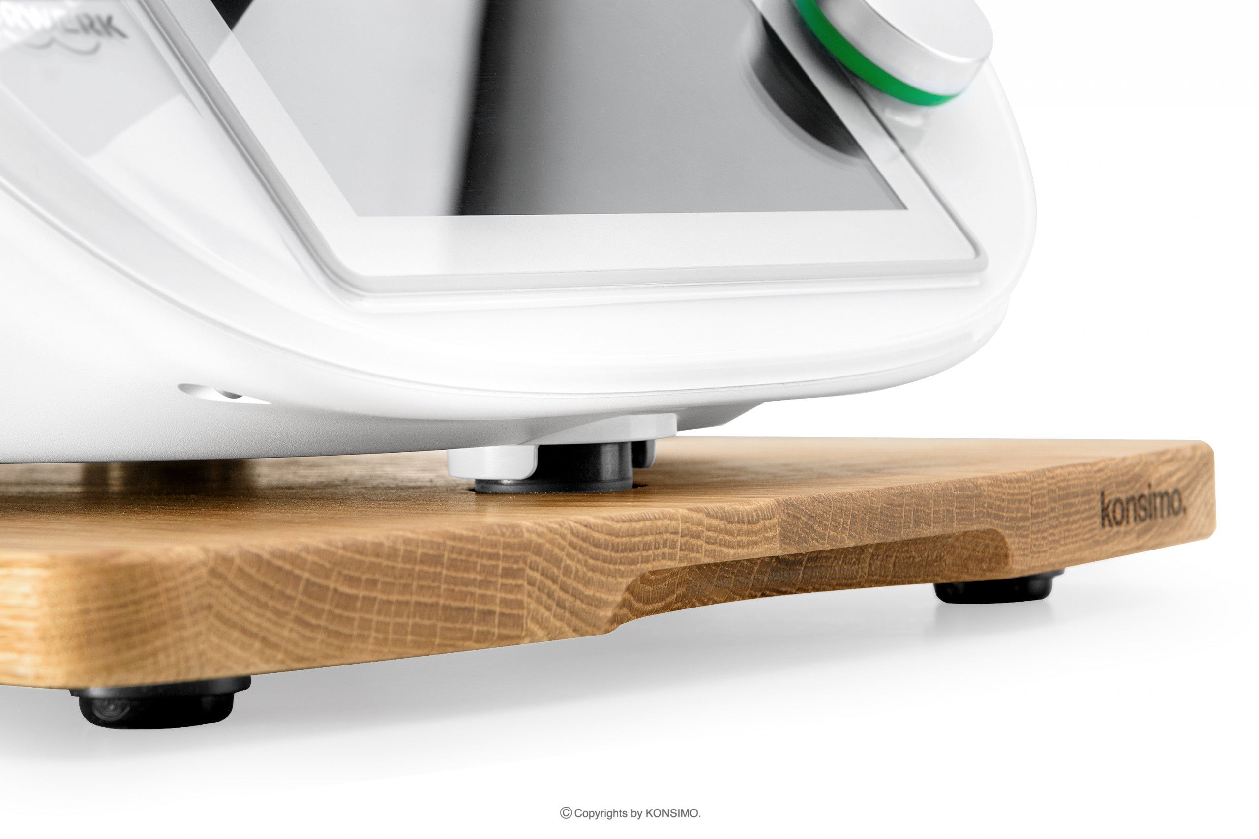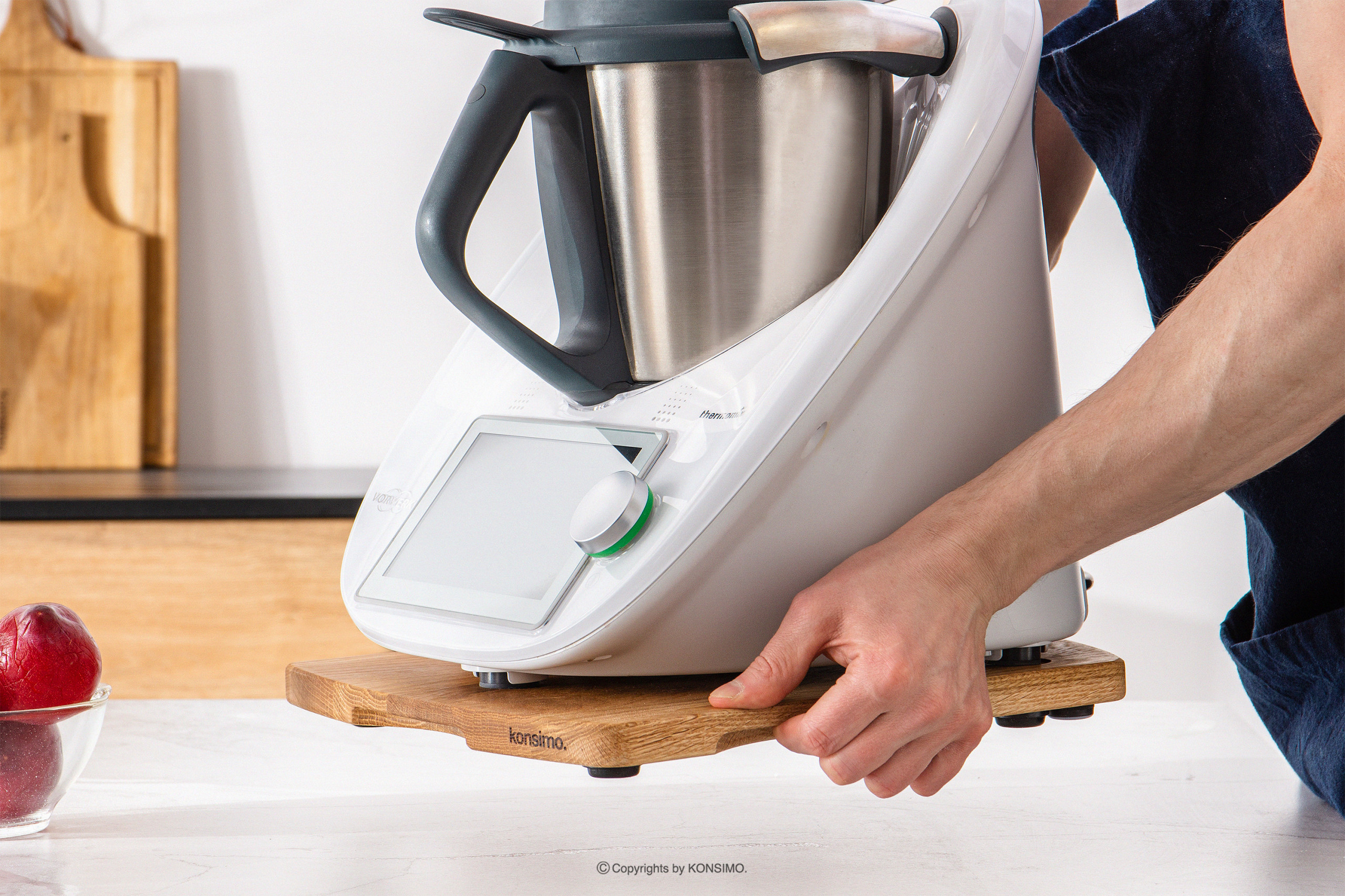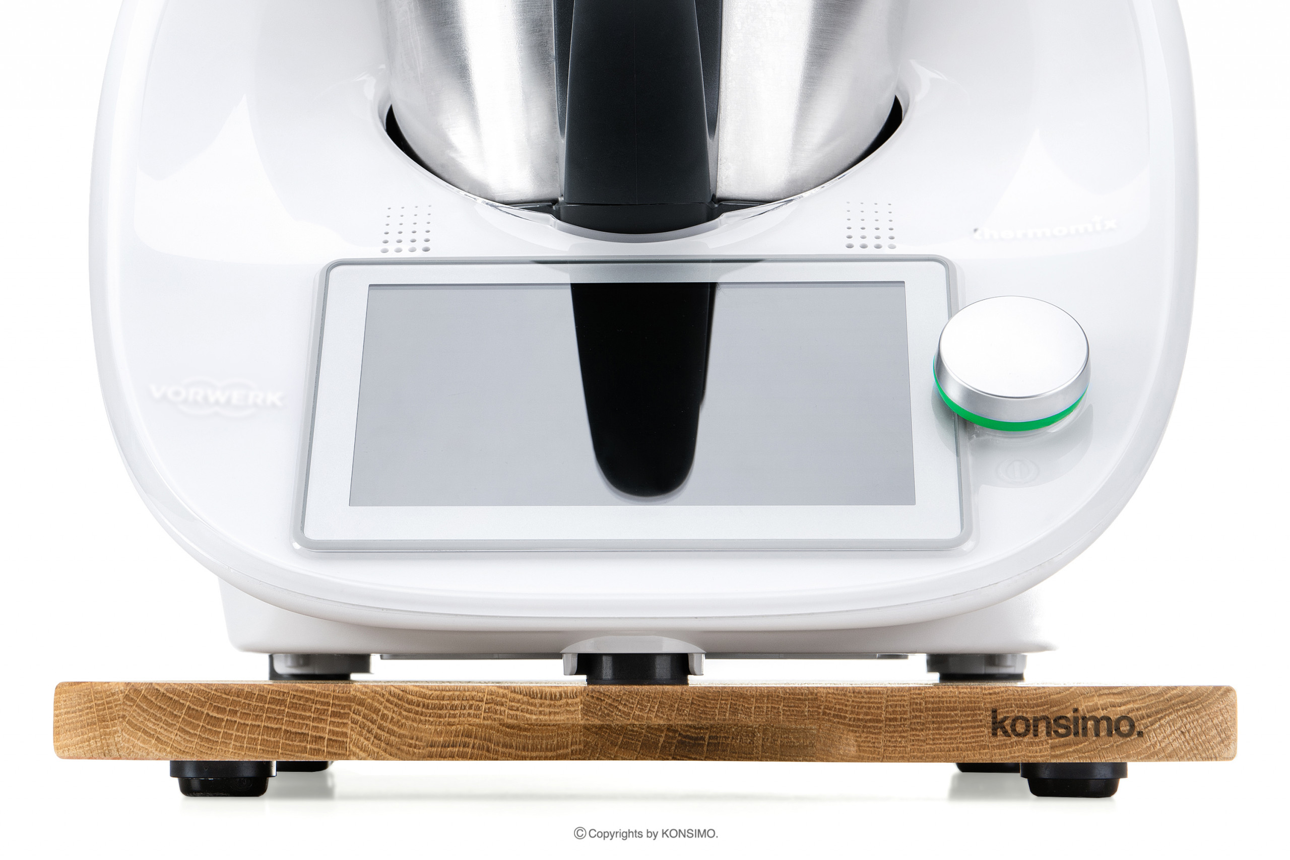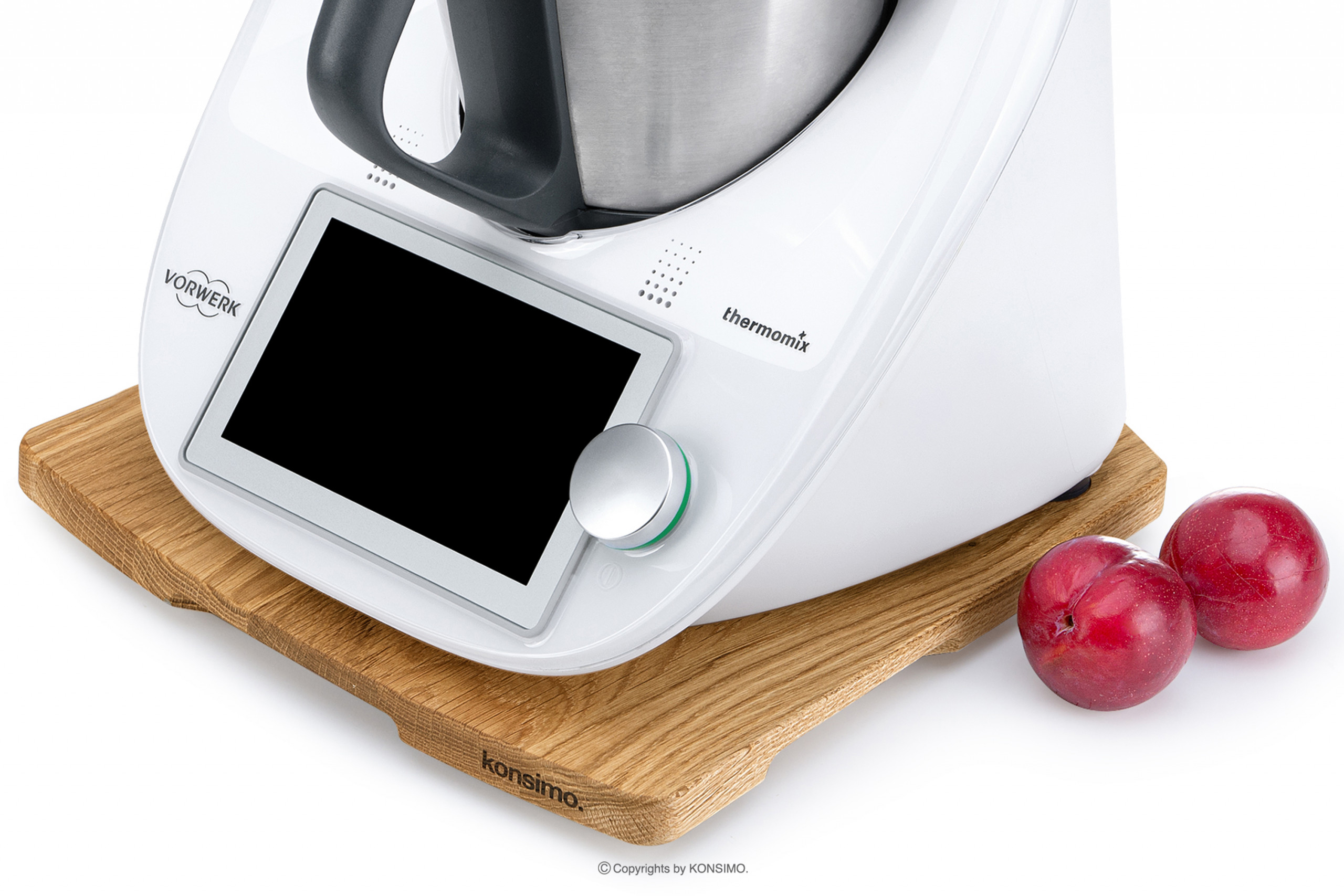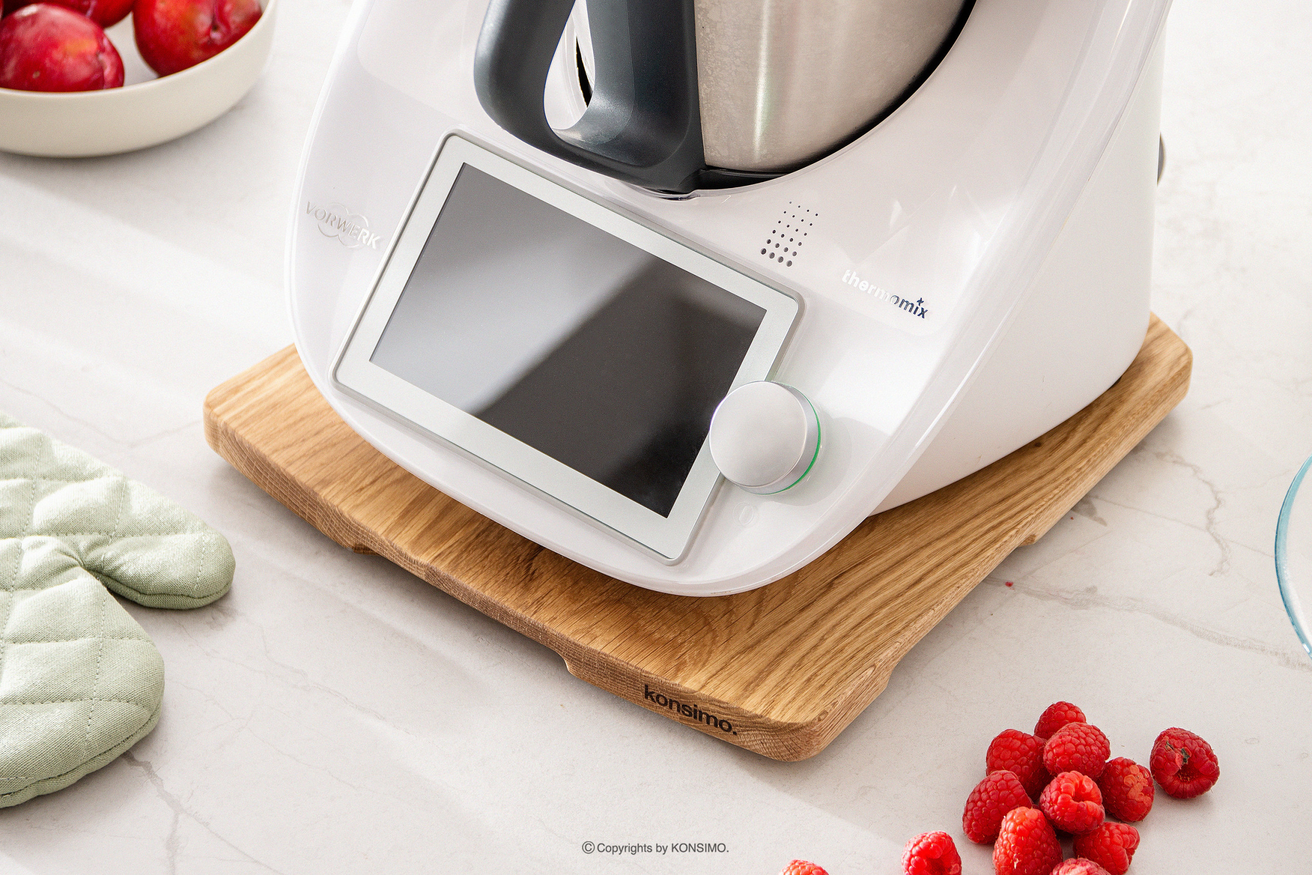 Doska pre Thermomix olejovaný dub bola navrhnutá na stabilné umiestnenie spotrebiča. Vďaka špeciálne tvarovaným priehlbinám a gumovým nožičkám doska účinne zabraňuje poškodeniu snímača rovnováhy, ktorý je umiestnený v nožičkách spotrebiča. To zaručuje bezpečné a neprerušované používanie Thermomixu. Doska COQUERE má ergonomický tvar a vyfrézované rukoväte po stranách a vpredu na jednoduchú manipuláciu a pohyb.