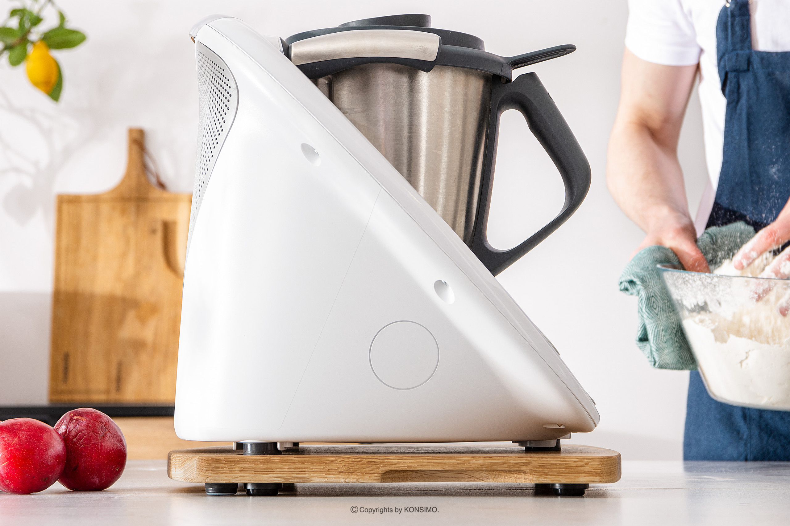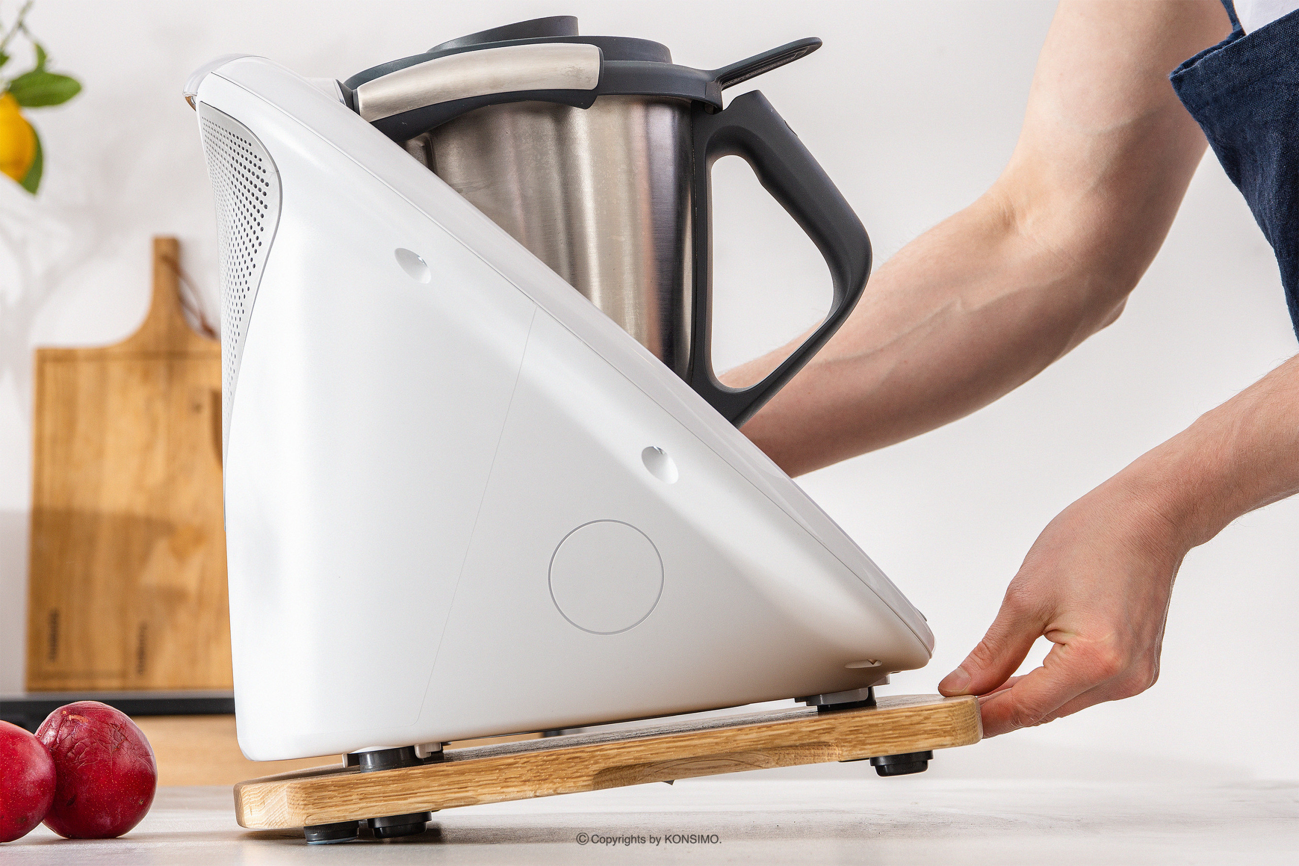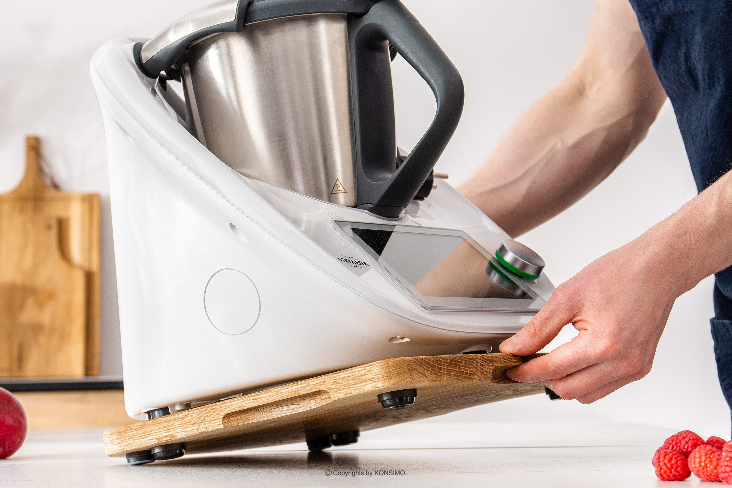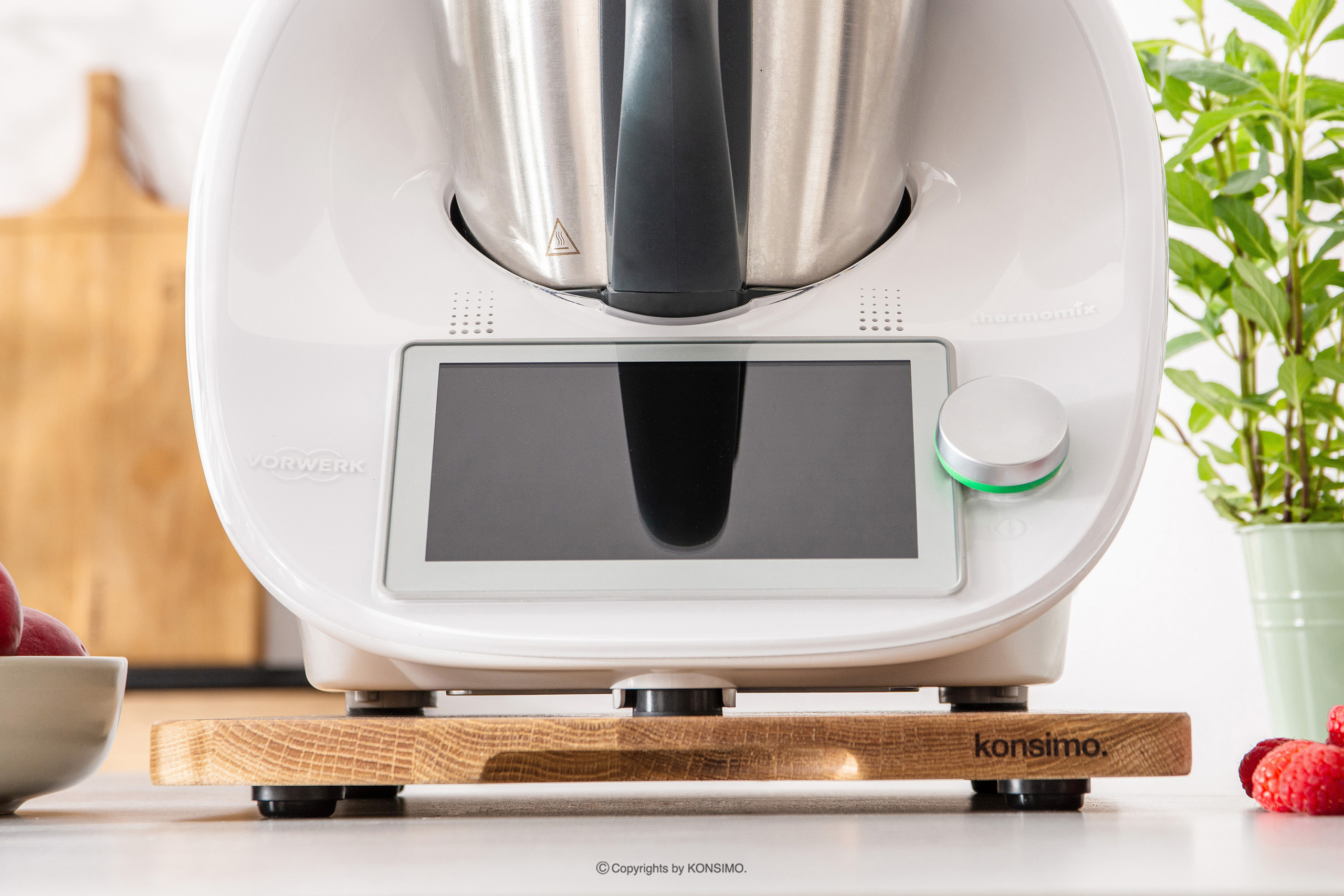 Základňa dosky má tri dokonale rozmiestnené nožičky Thermomix TM5 a TM6, ktoré zabezpečujú stabilitu spotrebiča a eliminujú jeho pohyb počas používania. Okrem toho je doska na spodnej strane vybavená dvoma teflónovými klzákmi, ktoré umožňujú ľahký pohyb spotrebiča vo všetkých smeroch. Či už potrebujete Thermomix presunúť do strany alebo ho otočiť iným smerom, naša doska vám poskytne voľnosť a pohodlie pri manipulácii so spotrebičom. Na ďalšie zvýšenie stability a pohodlia je doska vybavená štyrmi gumovými nožičkami, ktoré sú protišmykové a tlmia vibrácie počas používania. Vďaka nim zostane Thermomix bezpečne na svojom mieste bez toho, aby sa pohol aj počas intenzívneho varenia.